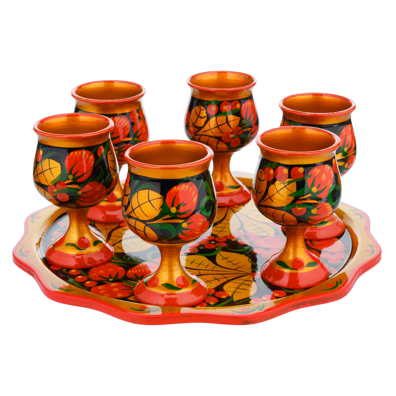 Питейный набор на 6 персон с росписью. Хохлома.Материалы: дерево, краски, лак.