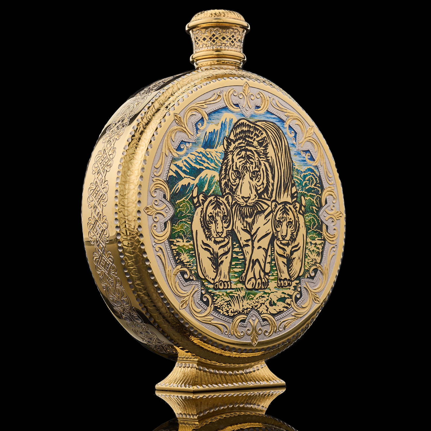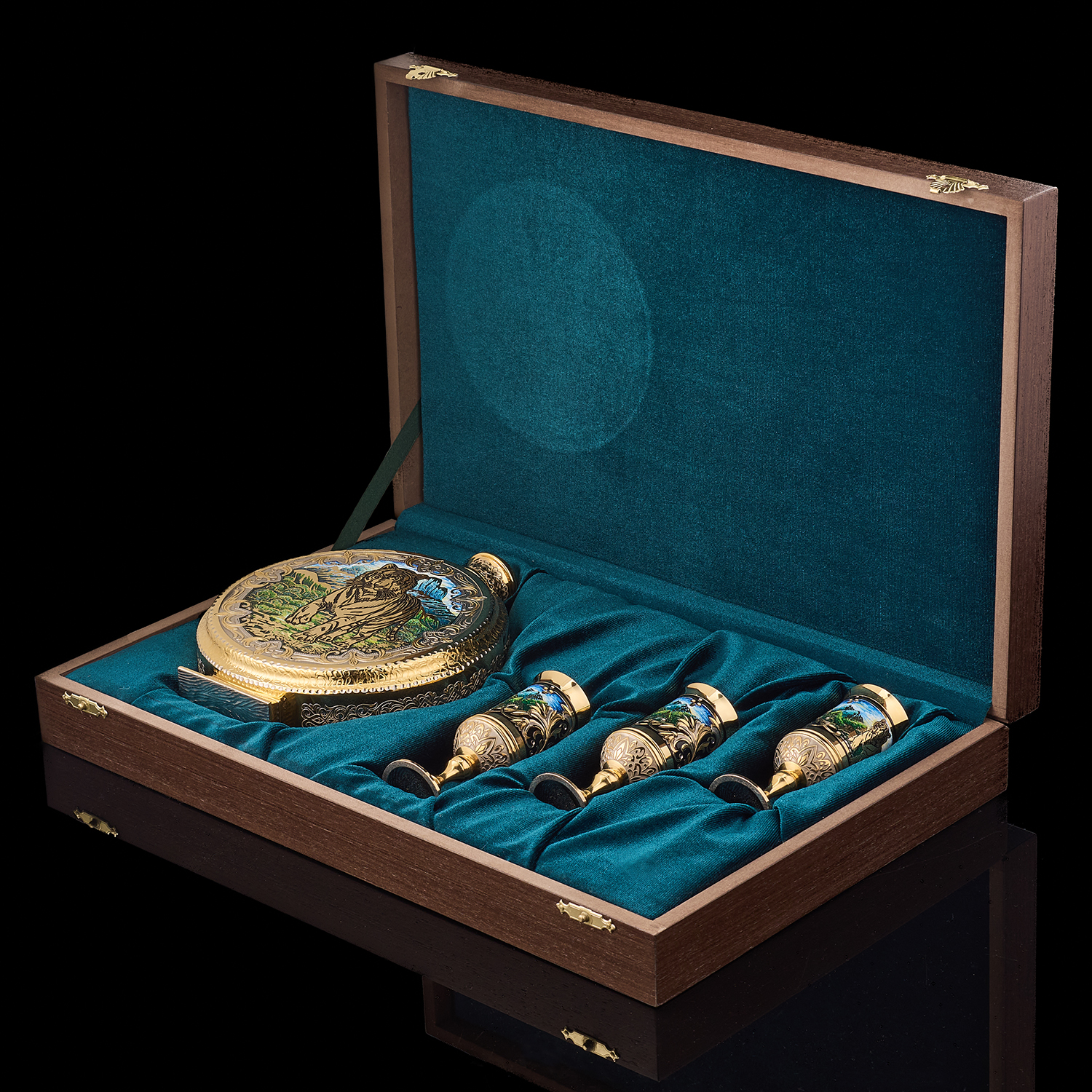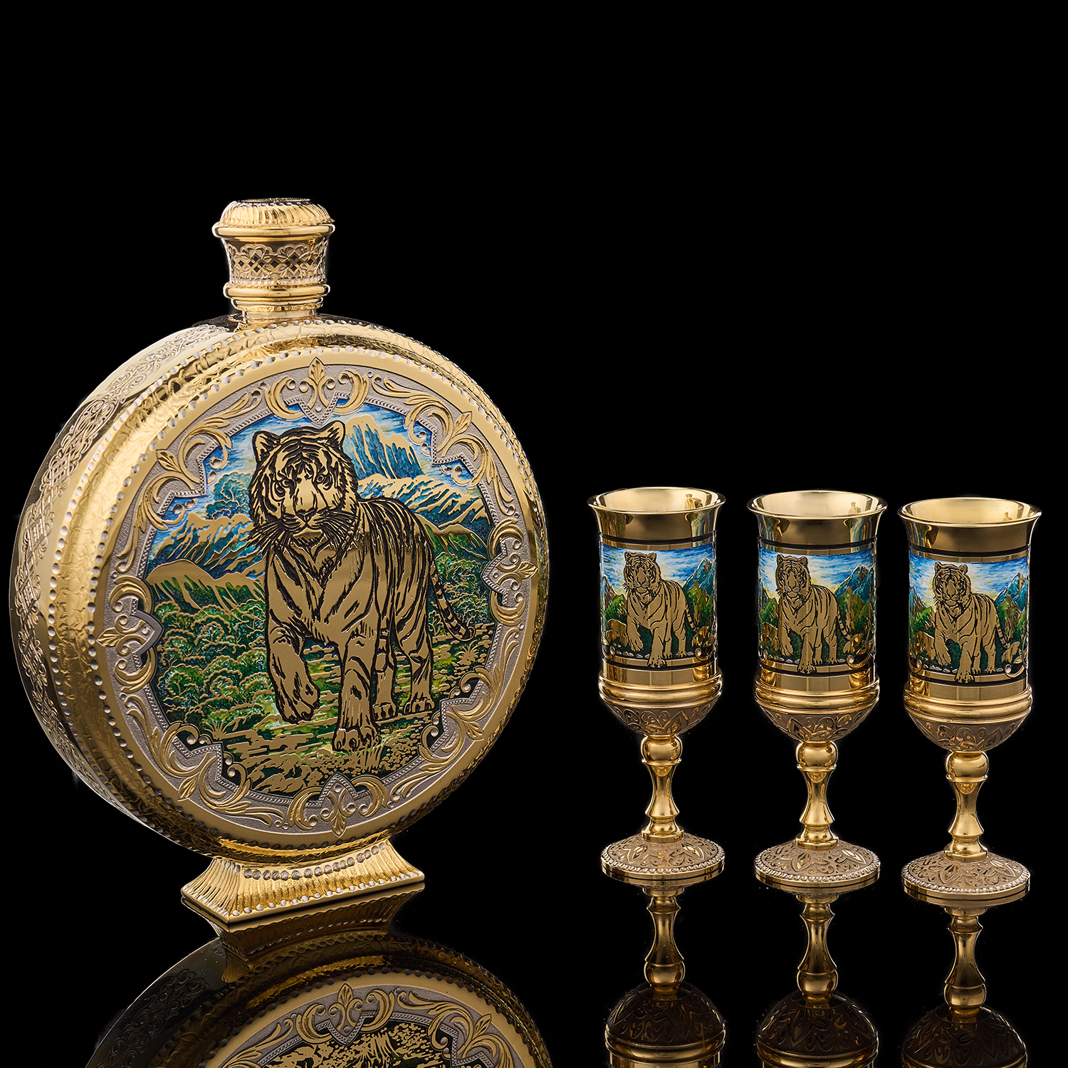 Питейный набор с флягой и рюмками "Тигр". Златоуст.Материалы: латунь, никель, золото 999,9*, эмаль.