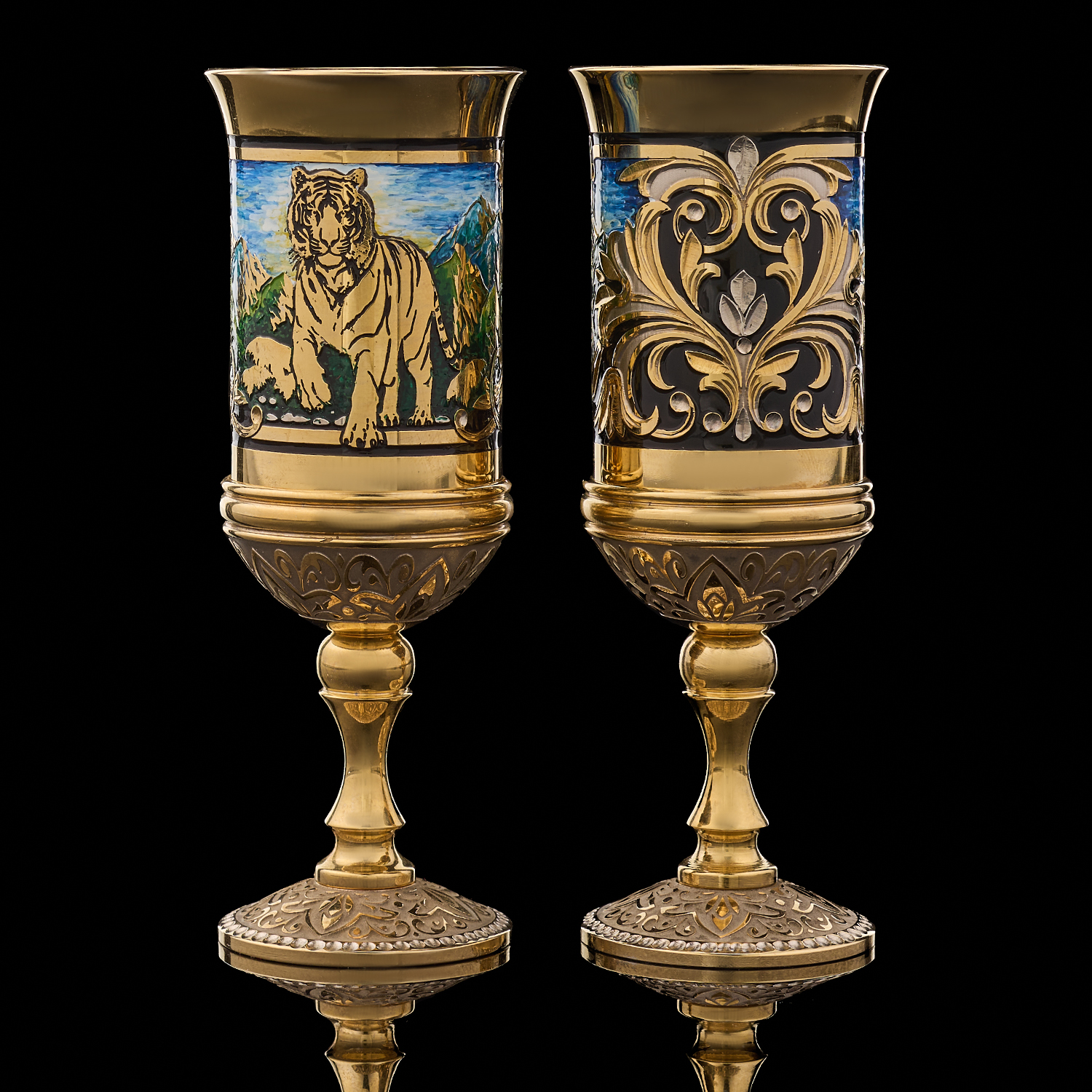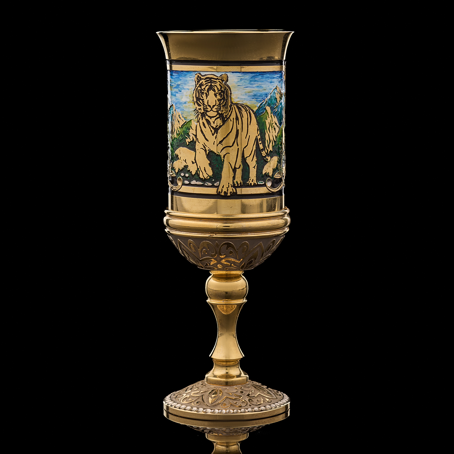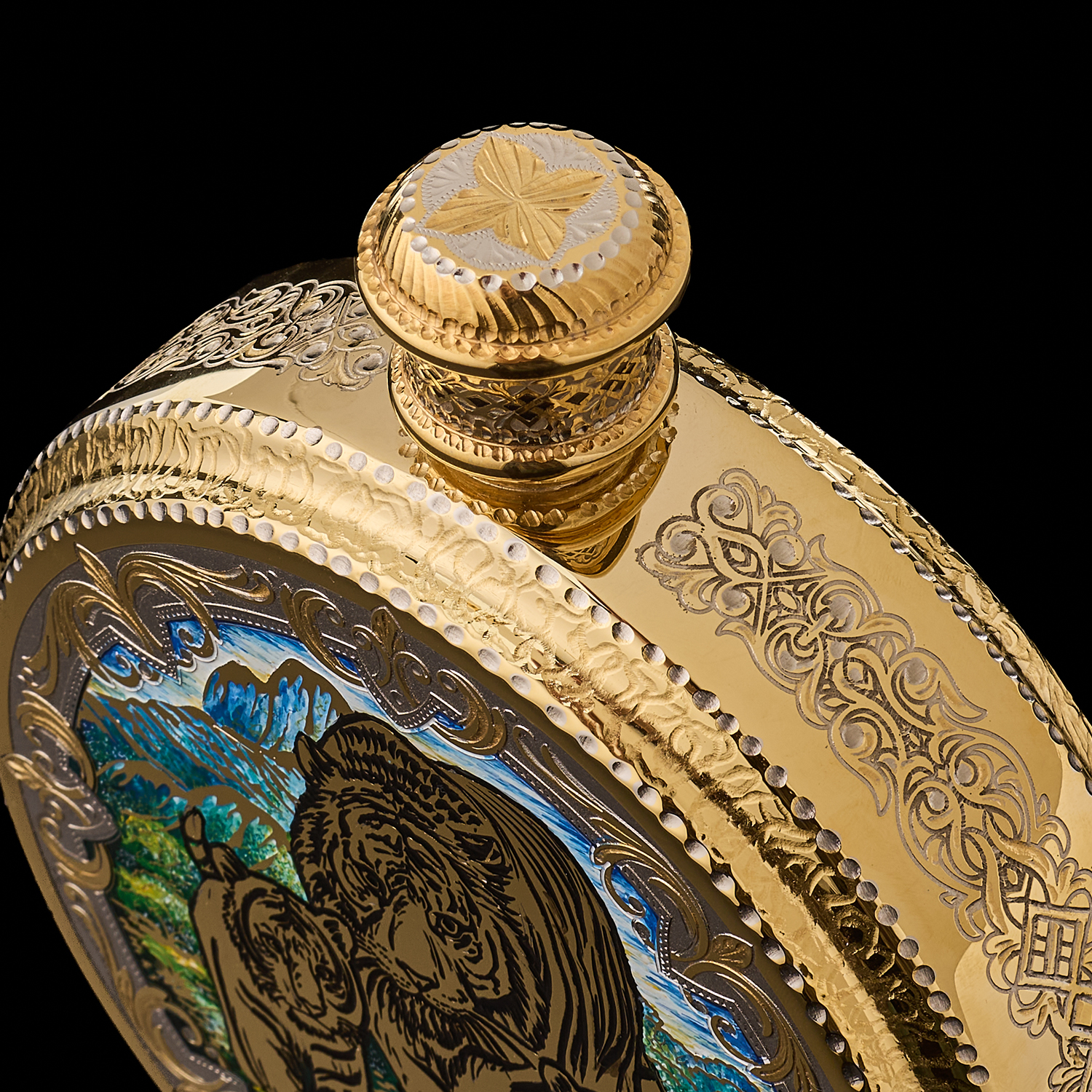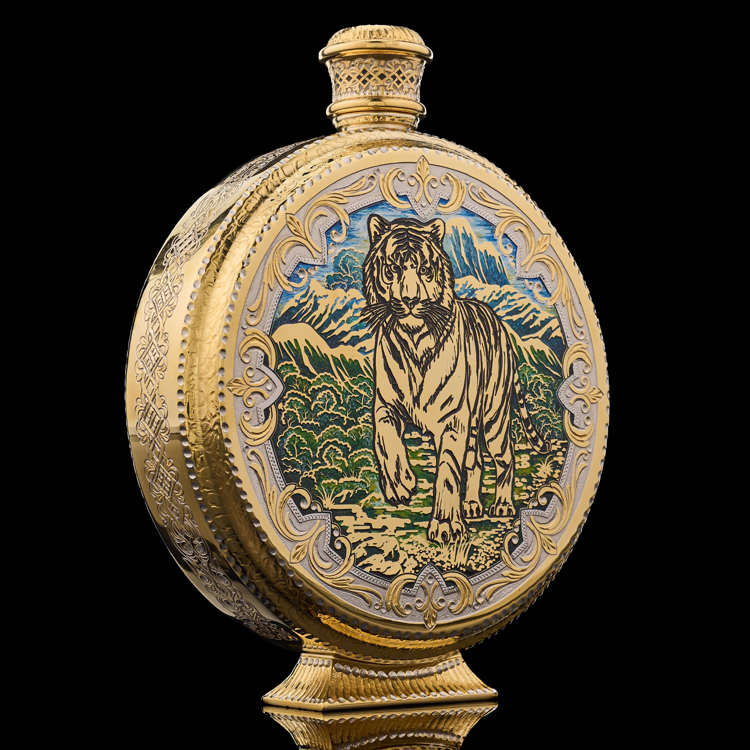 Питейный набор с флягой и рюмками "Тигр". Златоуст.Материалы: латунь, никель, золото 999,9*, эмаль.
