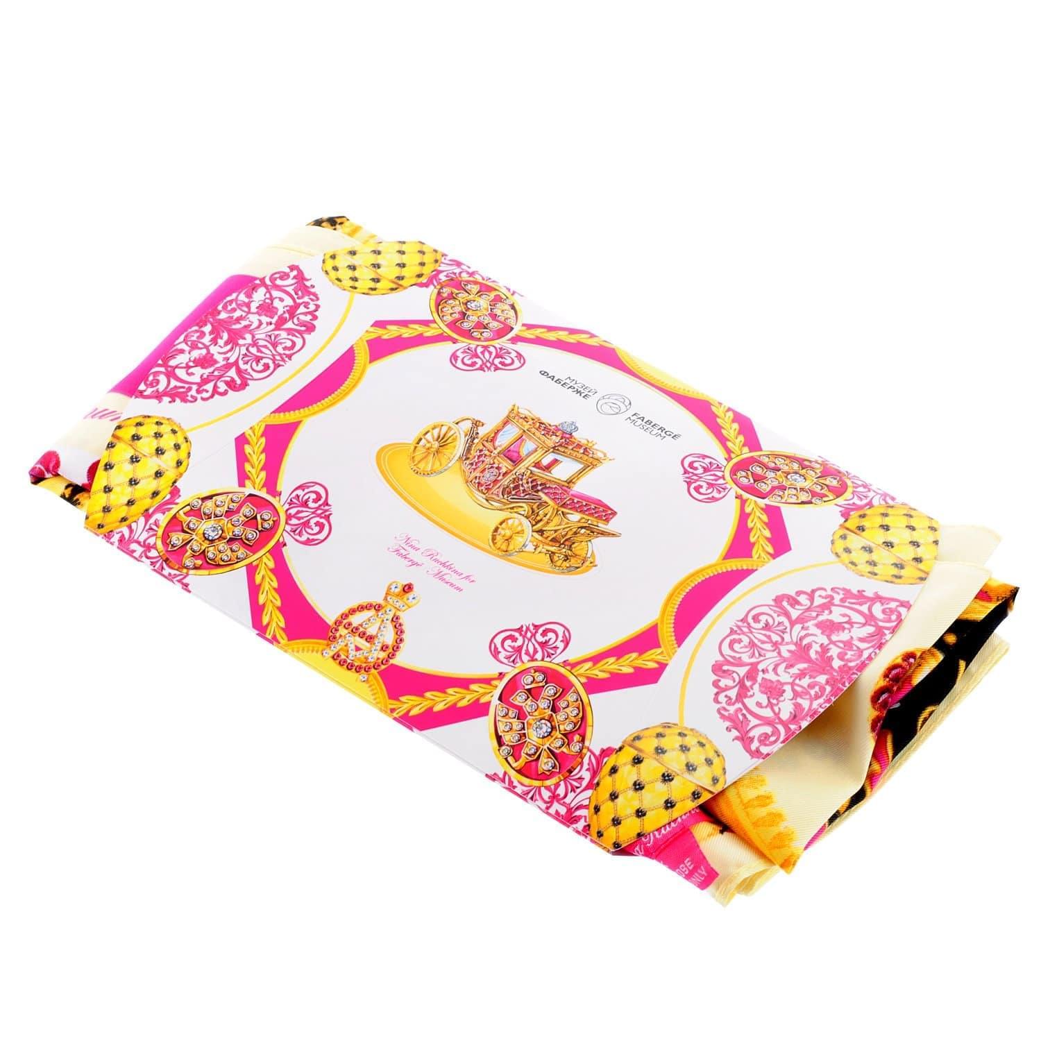 Аксессуар платок продается в подарочном конверте из картона, демонстрирующем красоту и особенности принта. Авторская работа, платок "Фаберже Коронационное яйцо" - это вариант женского подарка-сувенира на общий или личный праздник.