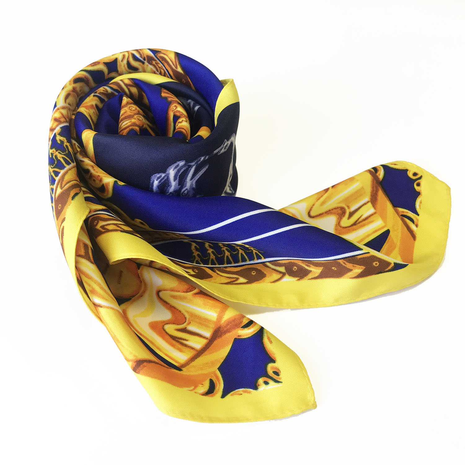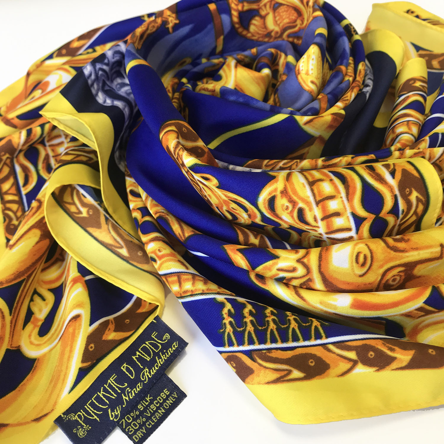 Платок входит в лимитированную коллекцию аксессуаров из русского шелка с добавлением "дышащей" вискозы.Полотно платка оформлено авторским принтом с элементами стиля барокко, нанесенным на материал по современной технологии. Цветовая гамма с благородными оттенками синего и желто-золотого привносит желаемый эффект "дорого-богато" в женский образ.