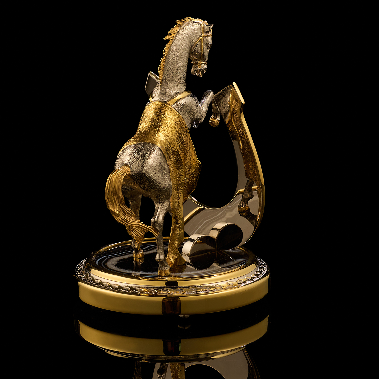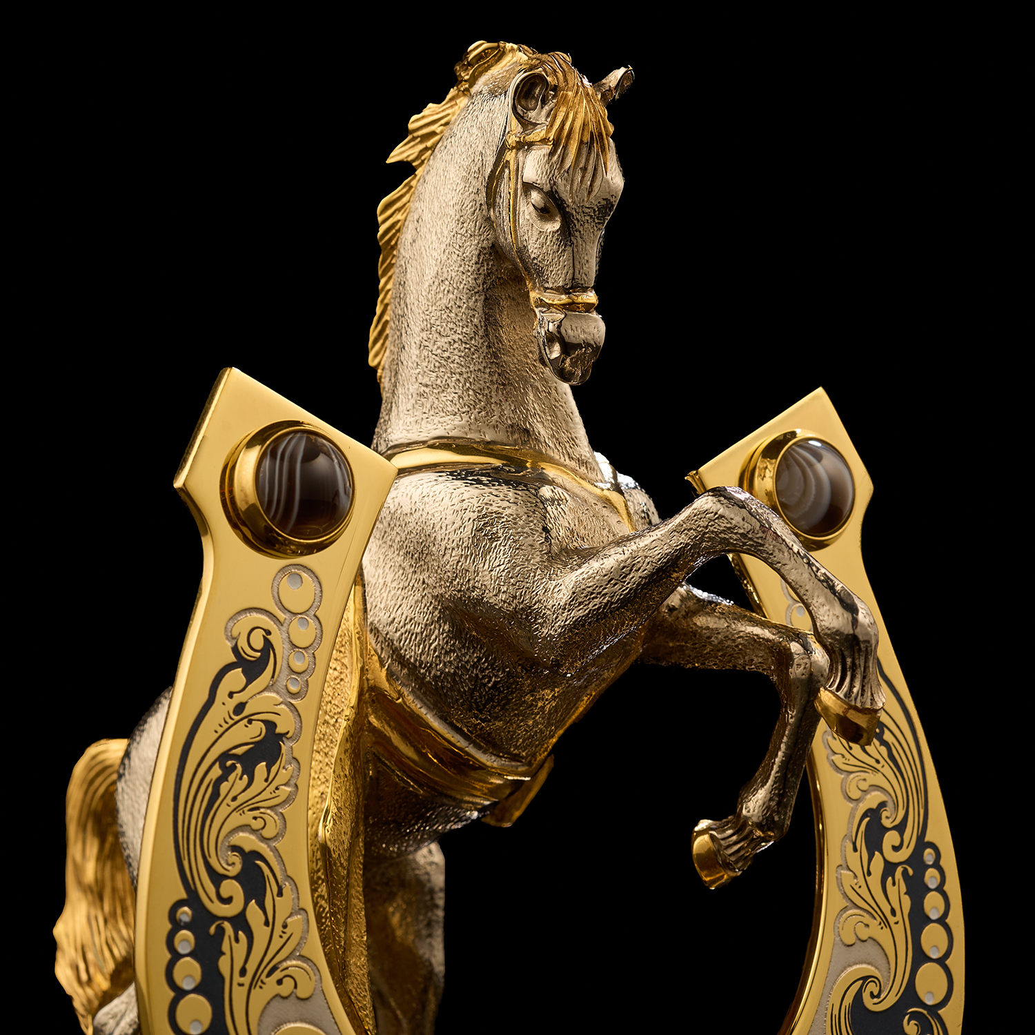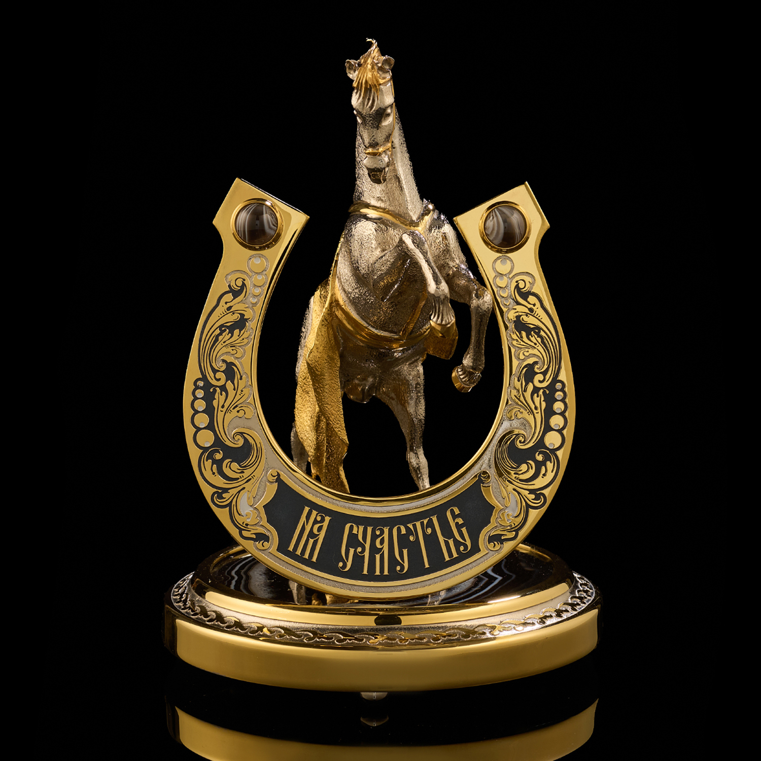 Лошадь Символ 2026 года. Подкова "На счастье". Златоуст.Материалы: латунь, никель, золото 999,9*, эмаль, агат.