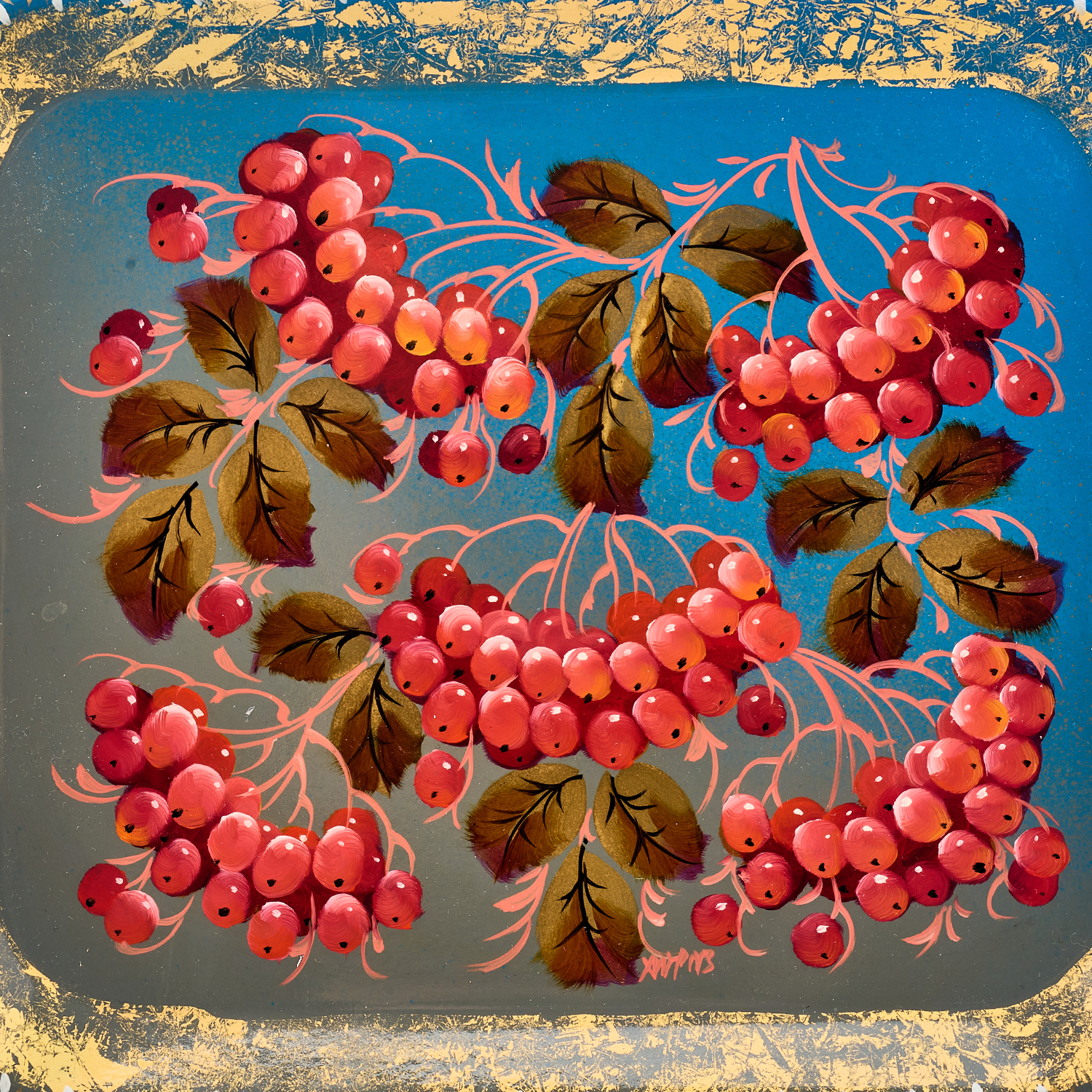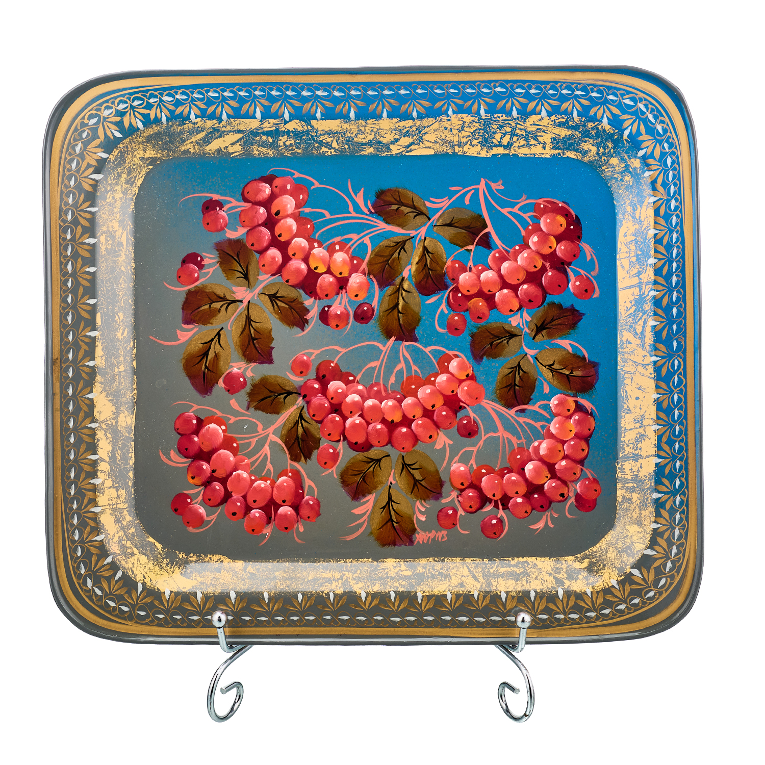 Поднос с авторской росписью "Рябина".Материалы: сталь, краски, лак.