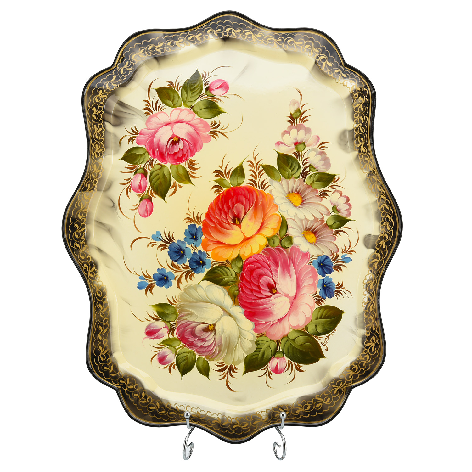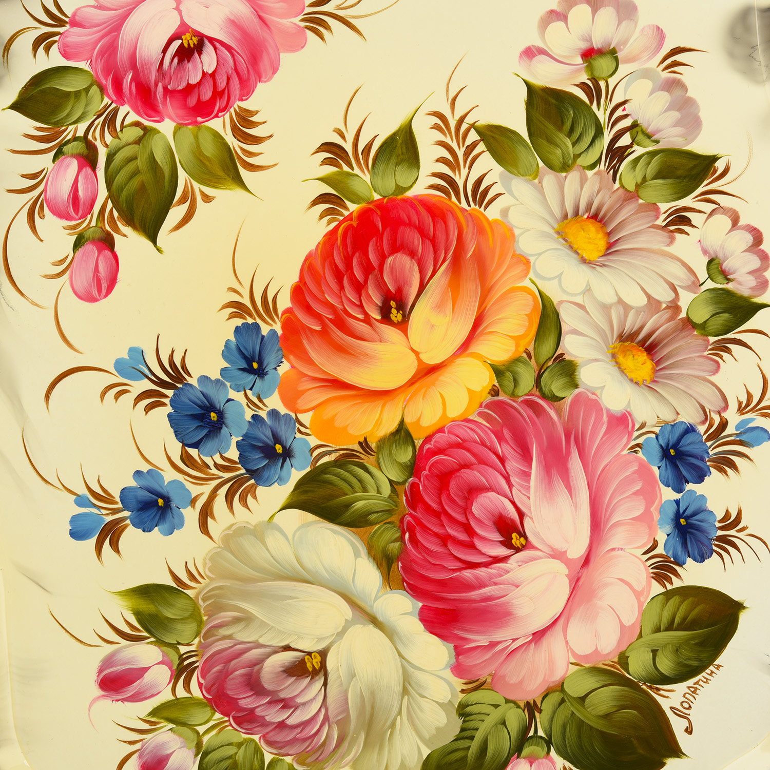 Поднос с авторской росписью "Цветы".Материалы: сталь, краски, лак.