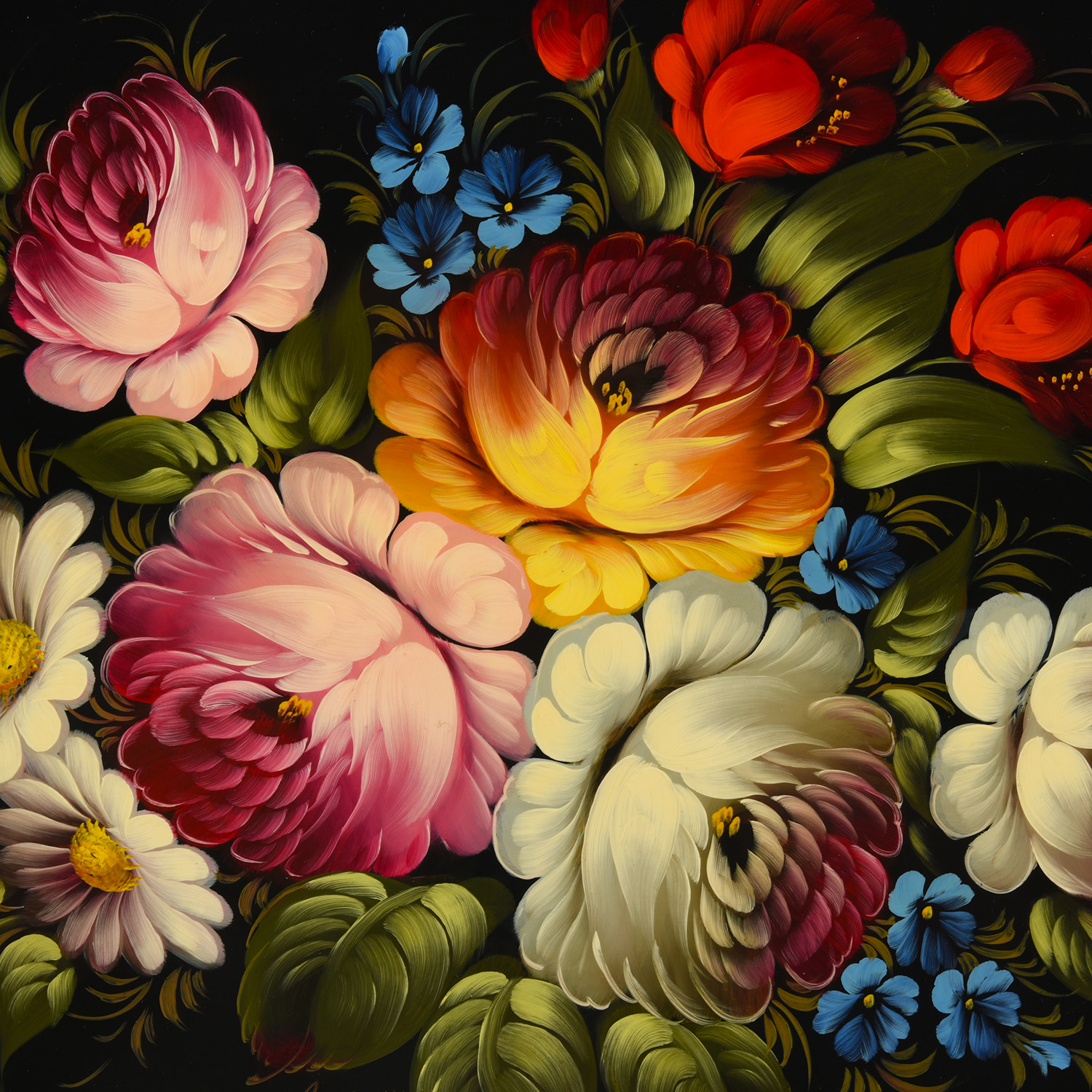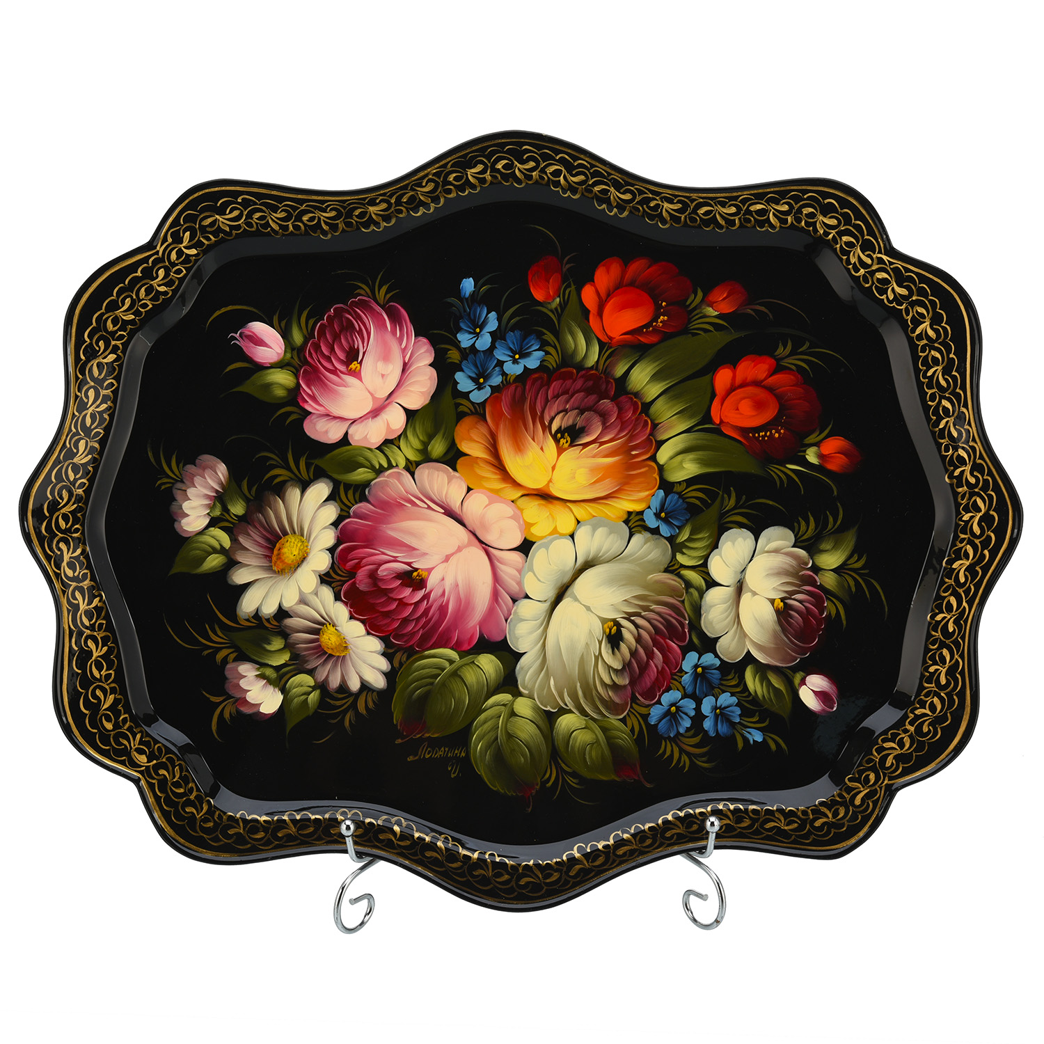 Поднос с авторской росписью "Цветы".Материалы: сталь, краски, лак.