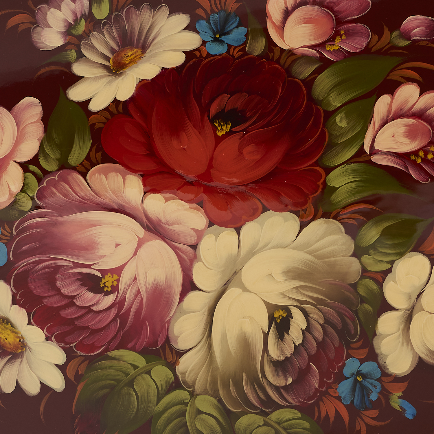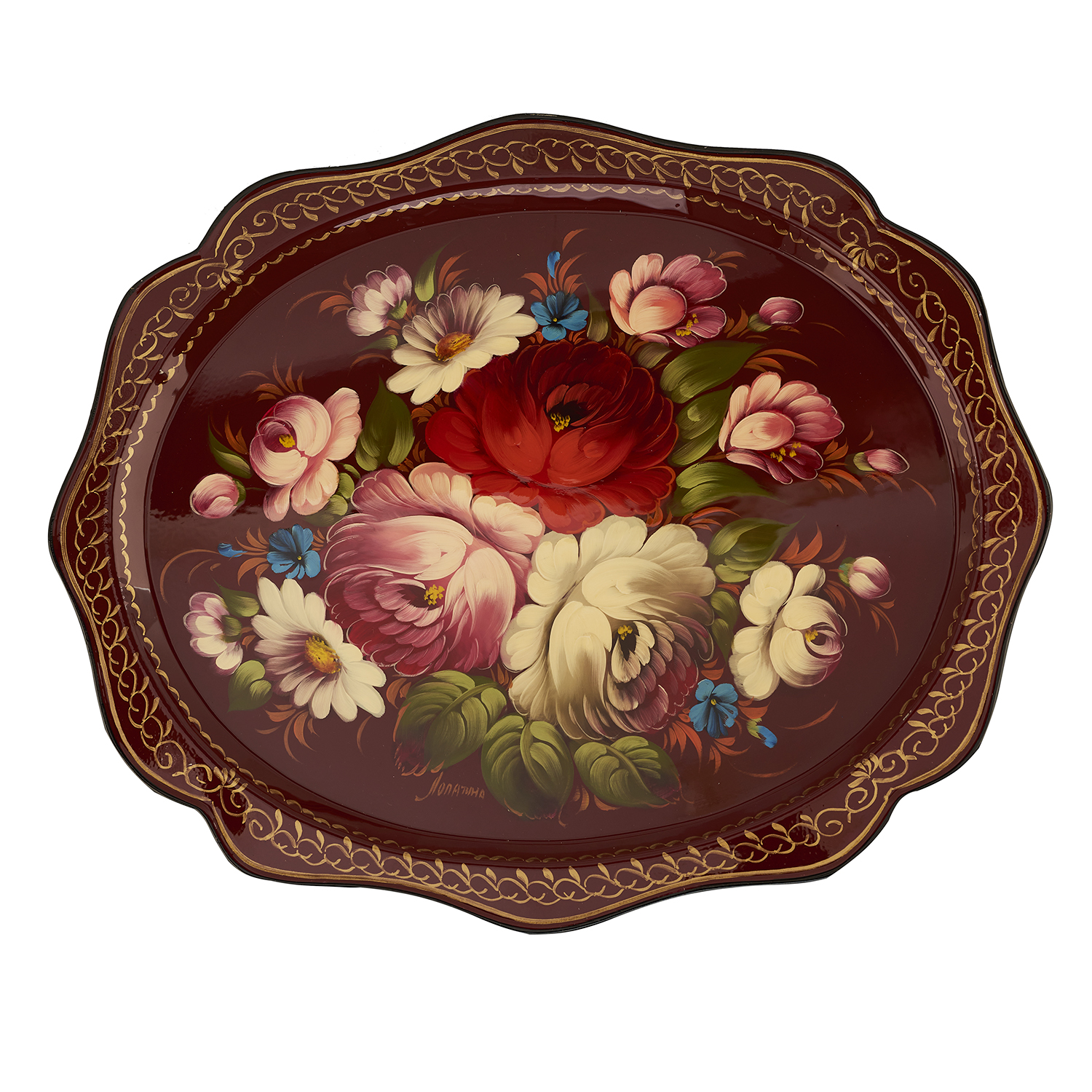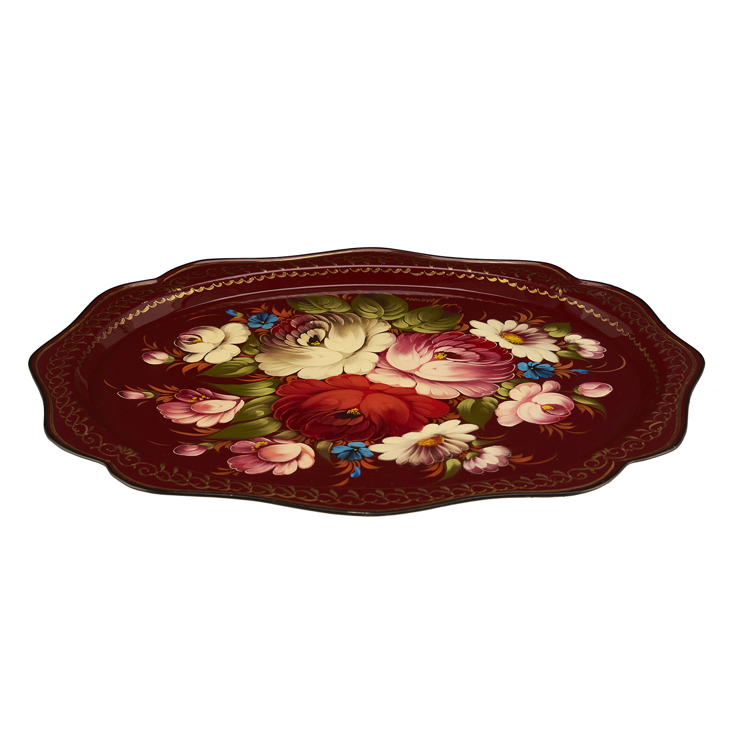 Поднос с авторской росписью "Цветы".Материалы: сталь, краски, лак.