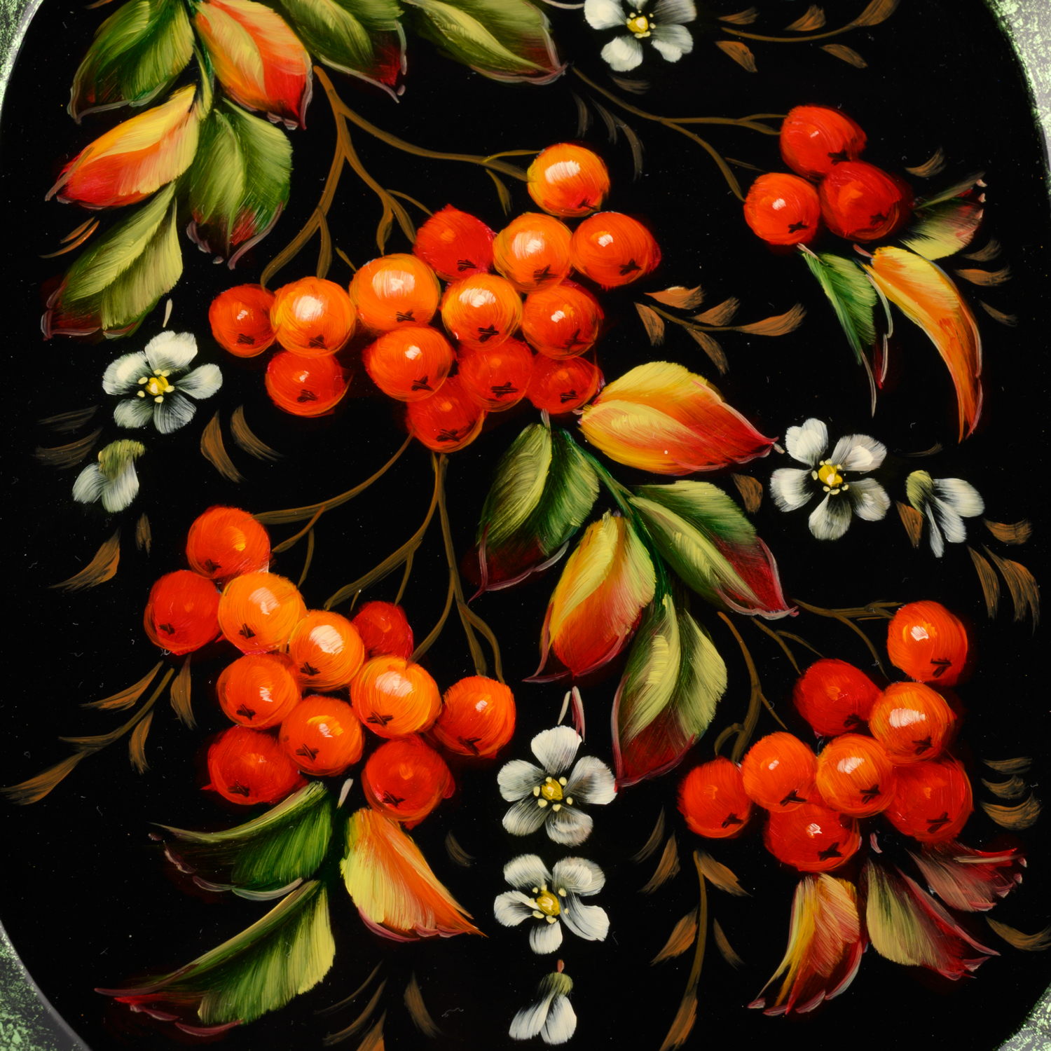 Поднос с авторской росписью "Рябина".Материалы: сталь, краски, лак.