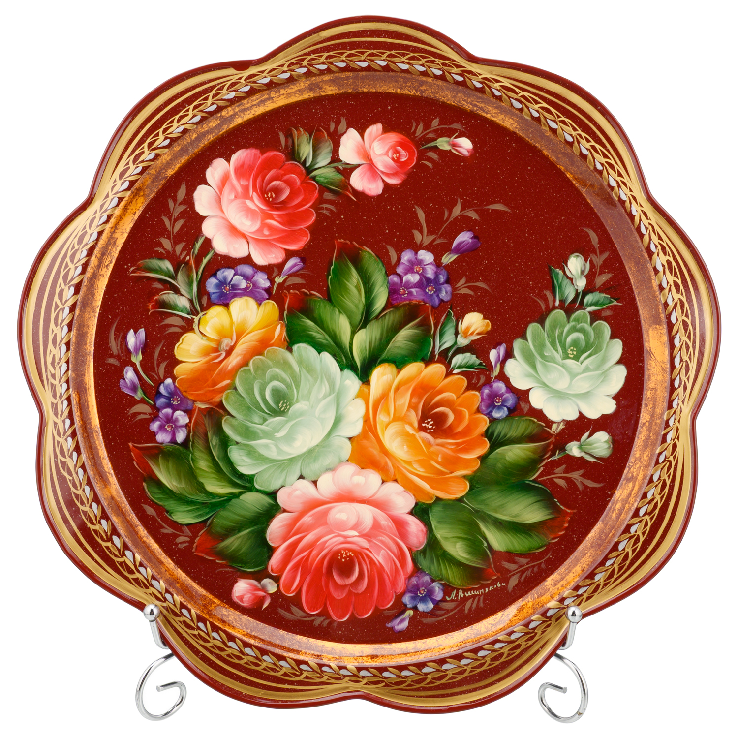 Поднос с авторской росписью "Цветы".Материалы: сталь, краски, лак.