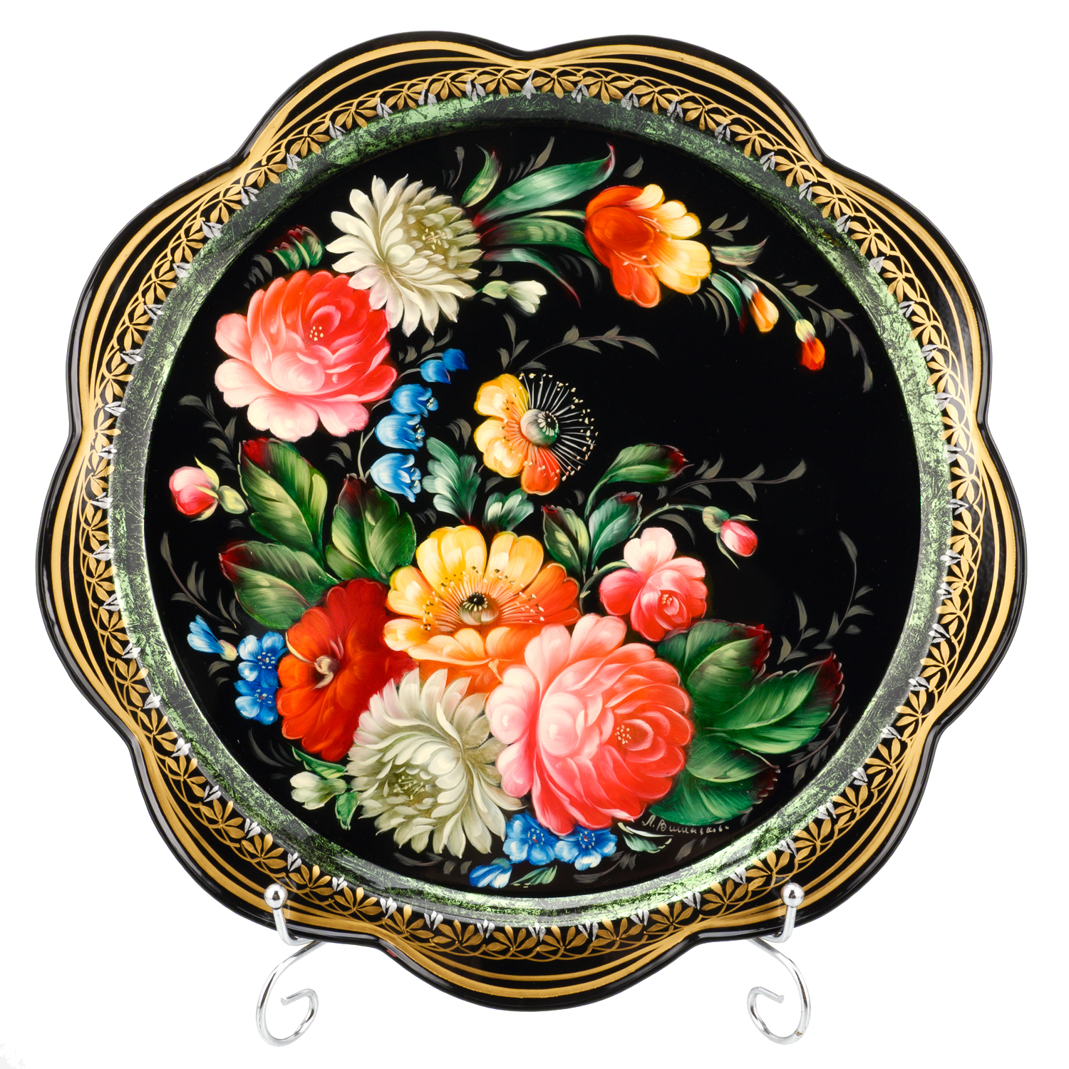 Поднос с авторской росписью "Цветы".Материалы: сталь, краски, лак.