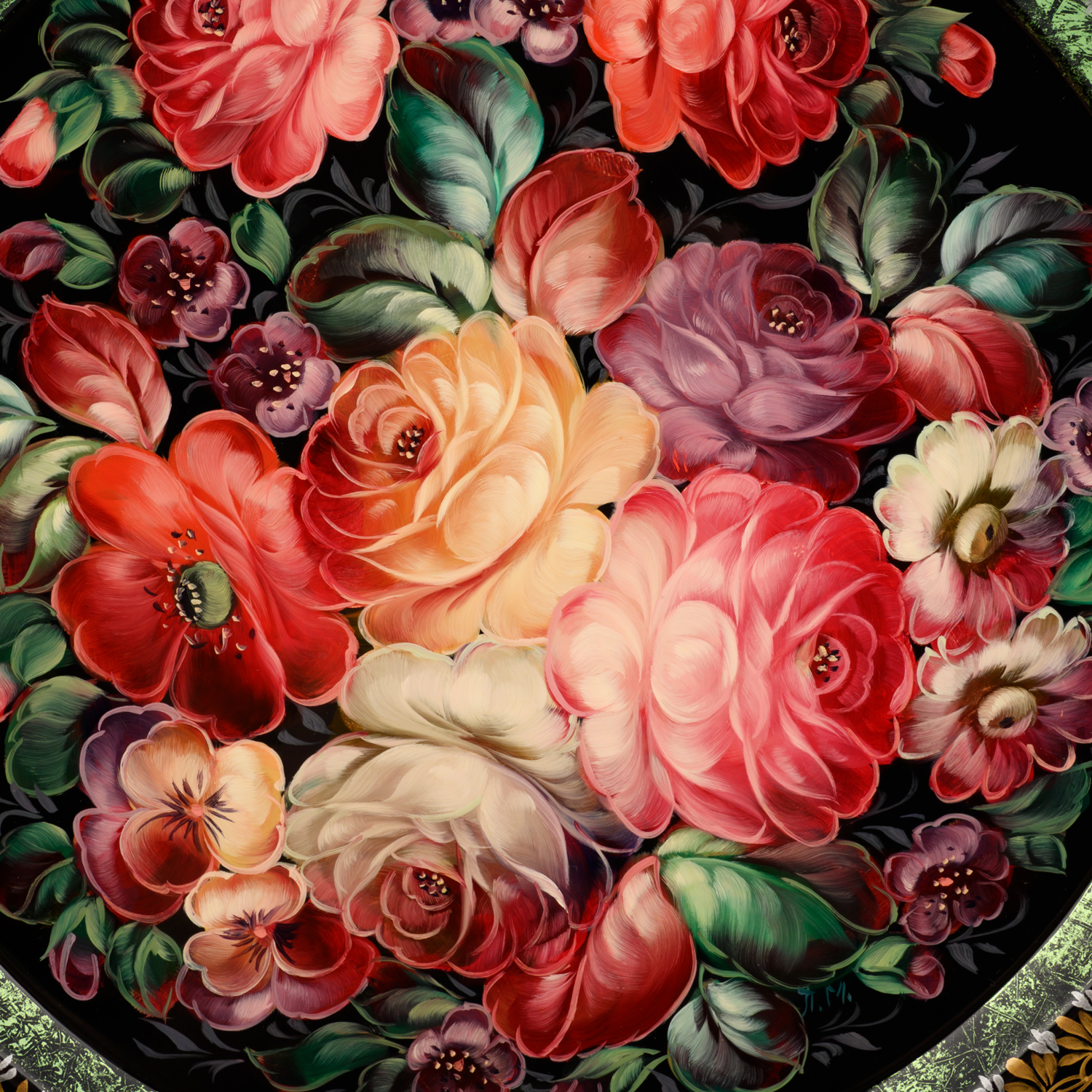Поднос с авторской росписью "Цветы".Материалы: сталь, краски, лак.