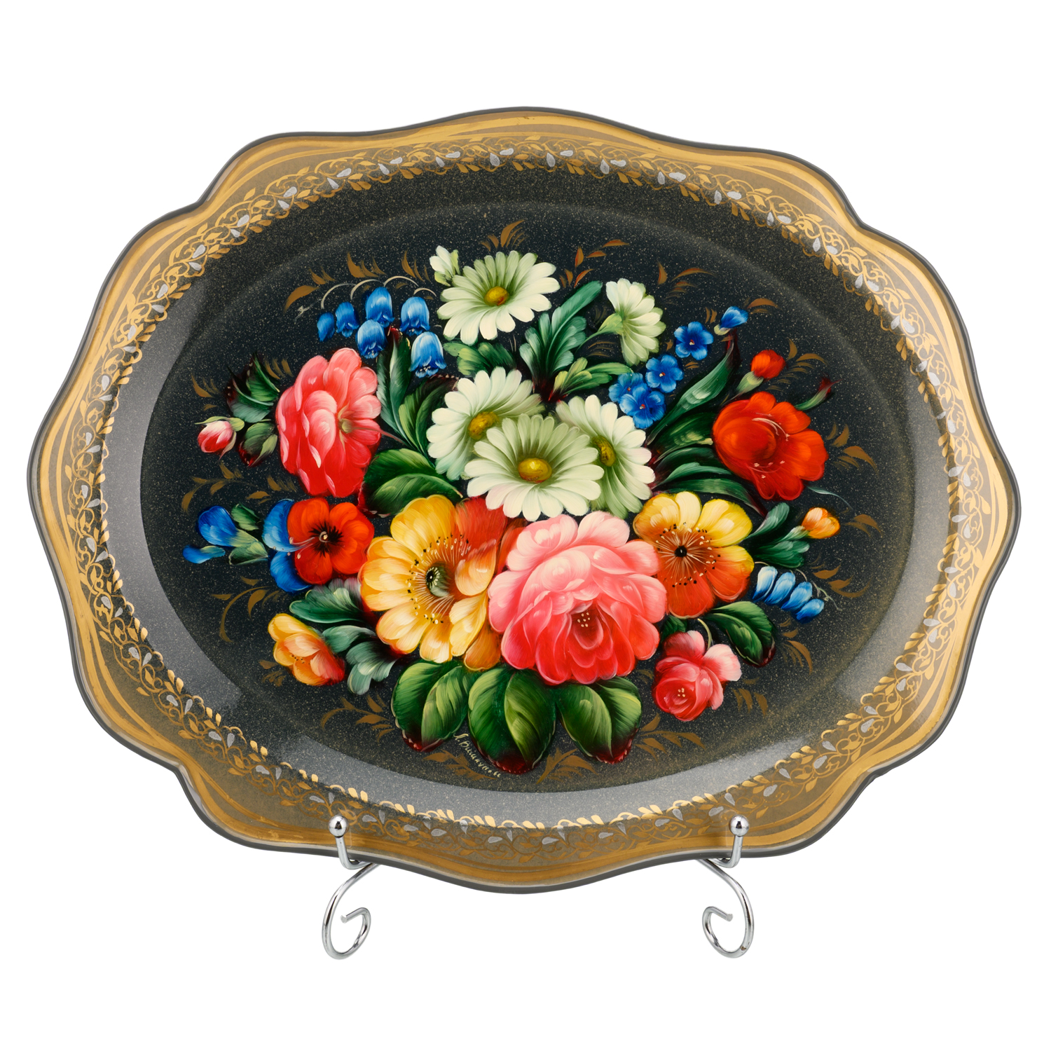 Поднос с авторской росписью "Цветы".Материалы: сталь, краски, лак.