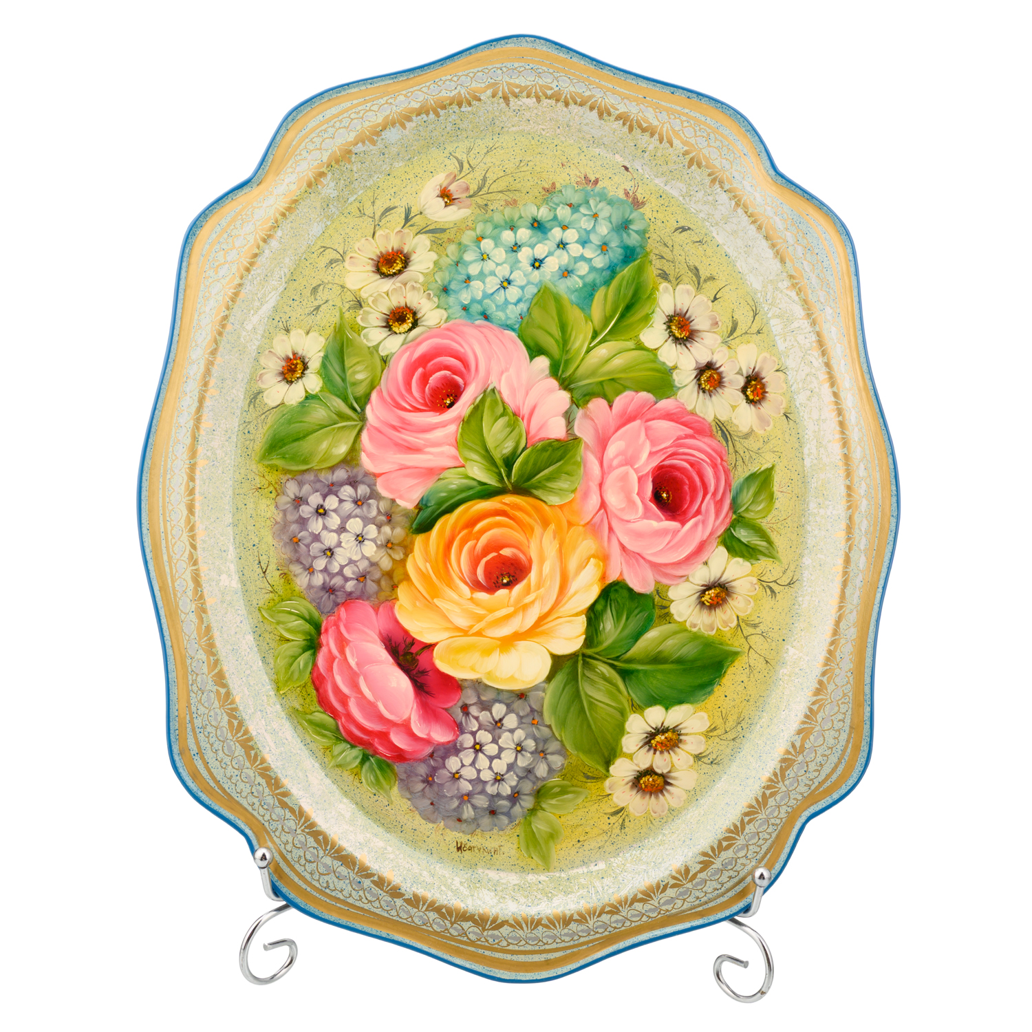 Поднос с авторской росписью "Цветы".Материалы: сталь, краски, лак.