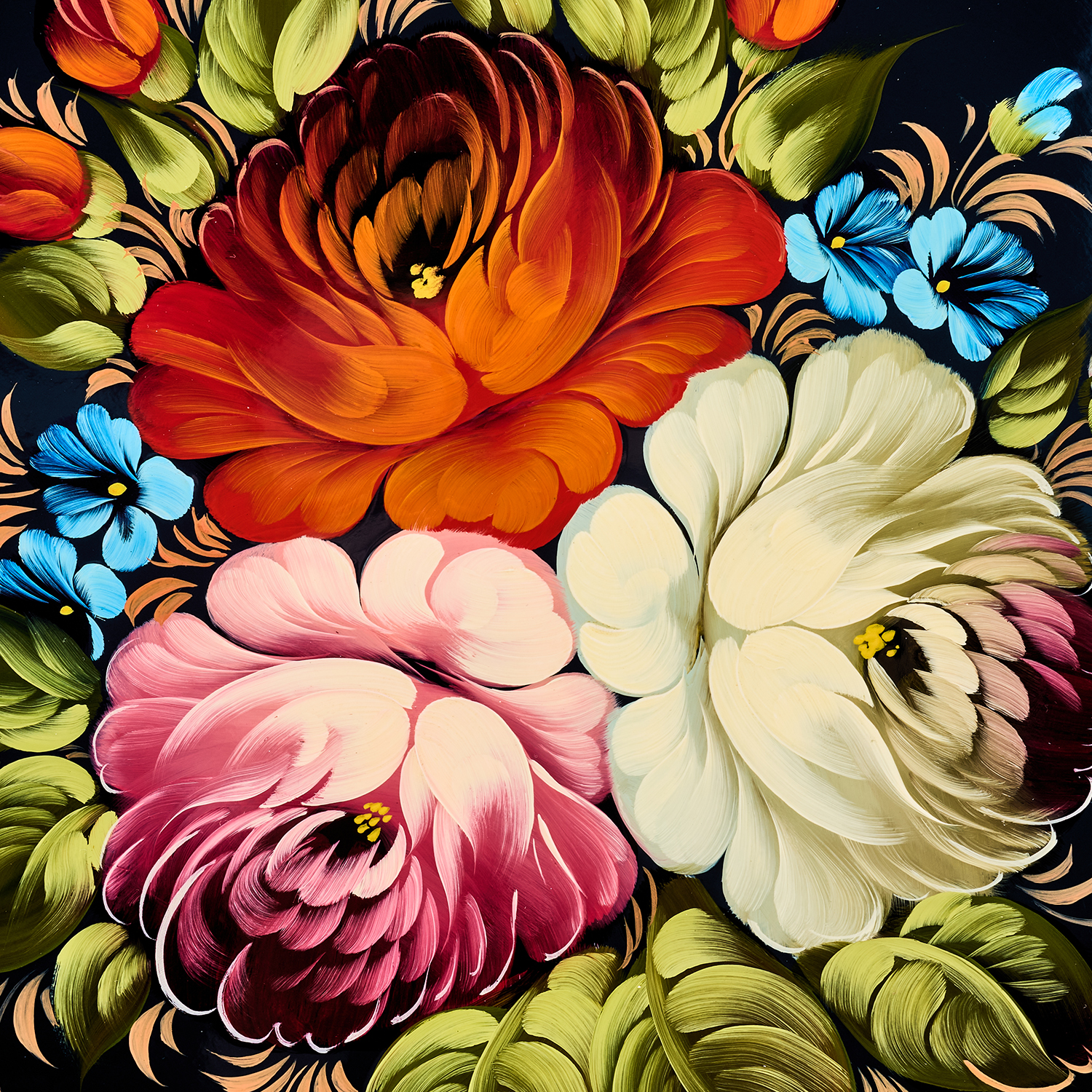 Поднос с авторской росписью "Цветы".Материалы: сталь, краски, лак.