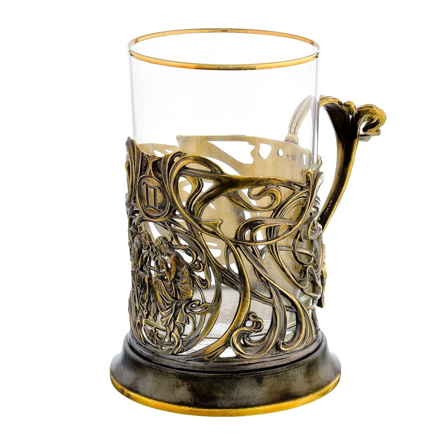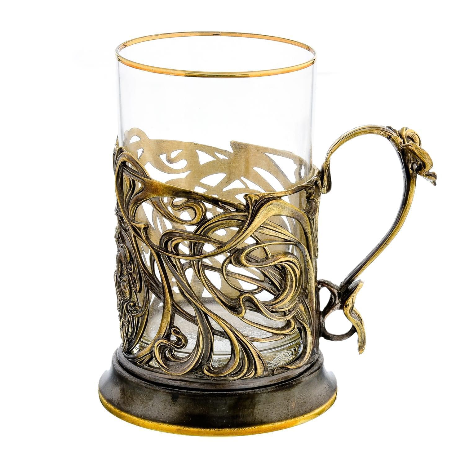 Подстаканник в наборе со вставным стаканом из твердого фарфора сделан вручную. Корпус с ручкой оформлен в технике художественного литья из латуни.  Металл с  медью в составе имеет  множество  природных свойств, это один из лучших материалов для изготовления дорогой посуды. Рука к подстаканнику сама тянется!
