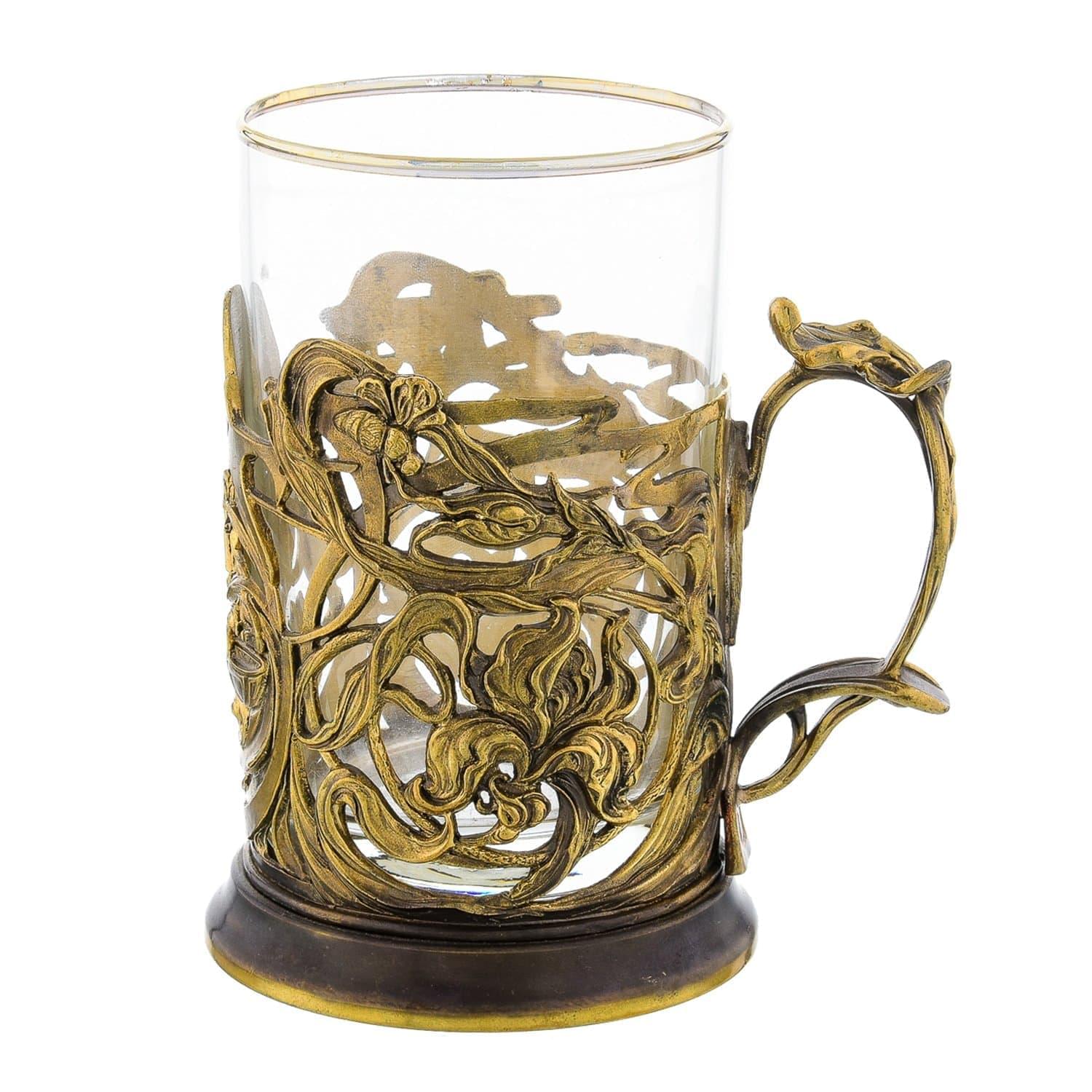 Подстаканник в наборе со вставным стаканом из твердого фарфора сделан вручную. Корпус с ручкой оформлен в технике художественного литья из латуни. Металл с медью в составе имеет множество природных свойств, это один из лучших материалов для изготовления дорогой посуды. Рука к подстаканнику сама тянется!