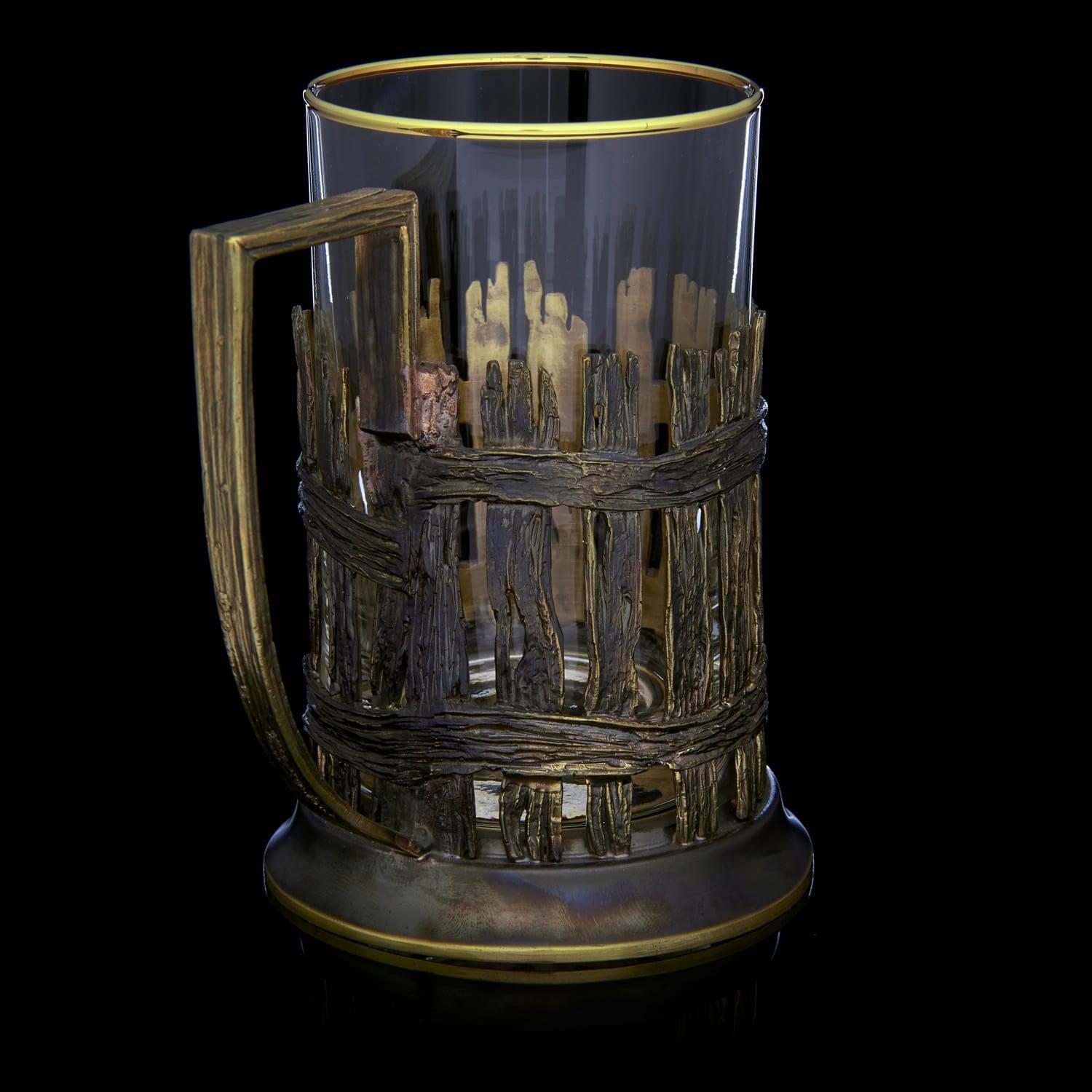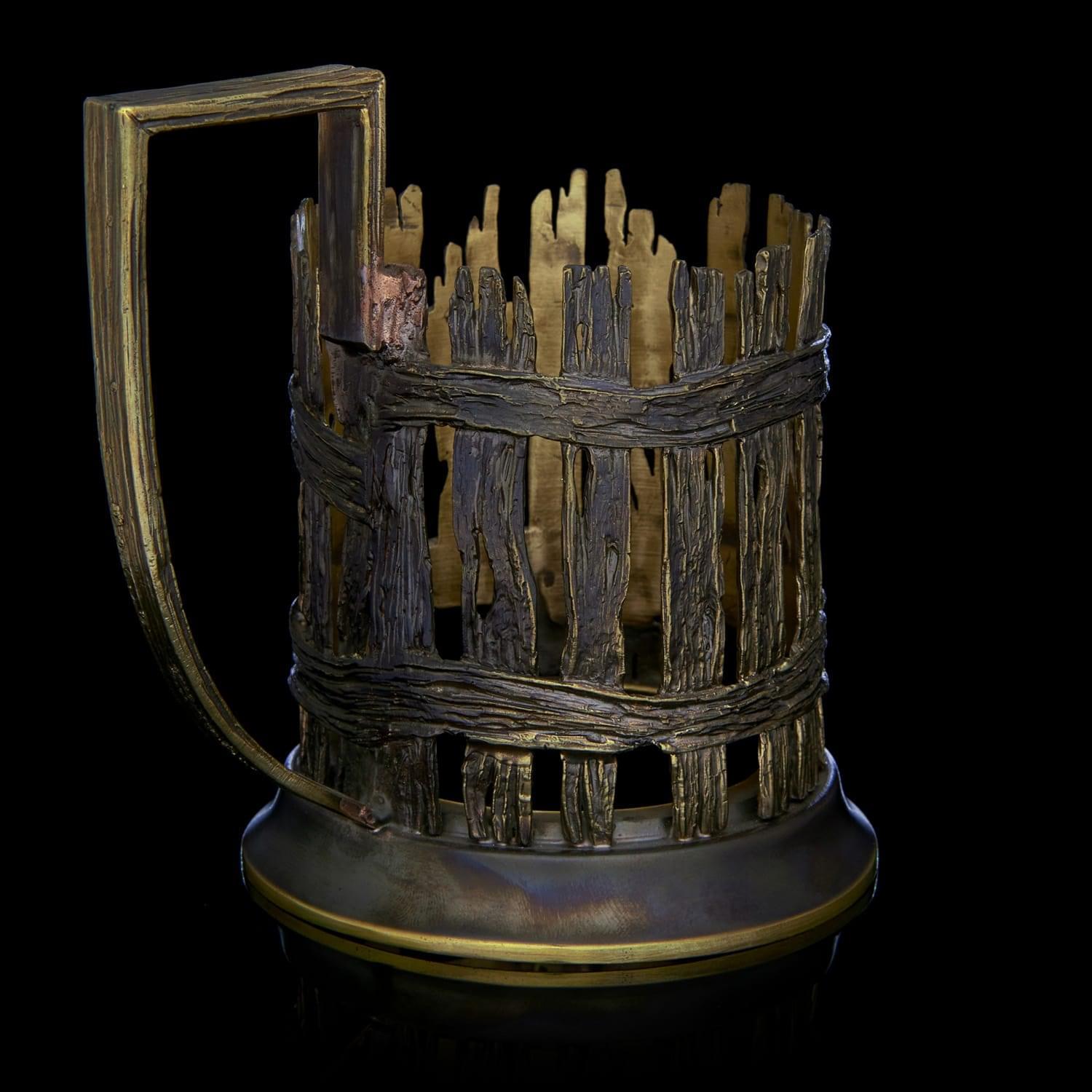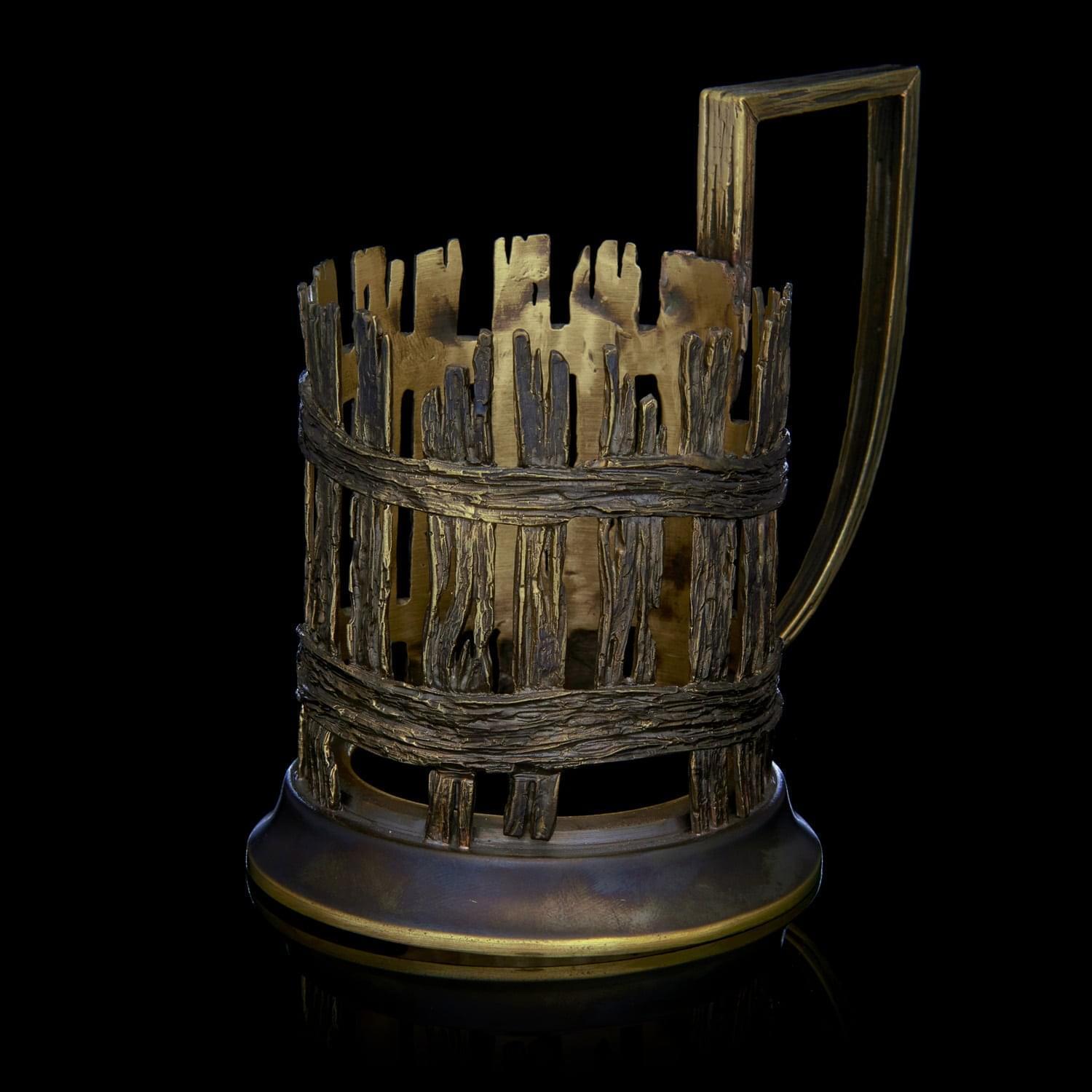 Корпус подстаканника представляет собой авторский образец латунного литья. Он искусно оформлен в соответствии с оригинальным эскизом, предполагающим детальную композицию с образом пастуха. Литой корпус тонирован позолотой и патиной. Имеет удобную фигурную ручку для нескольких пальцев. Вставной стакан сделан из ровного прозрачного стекла.