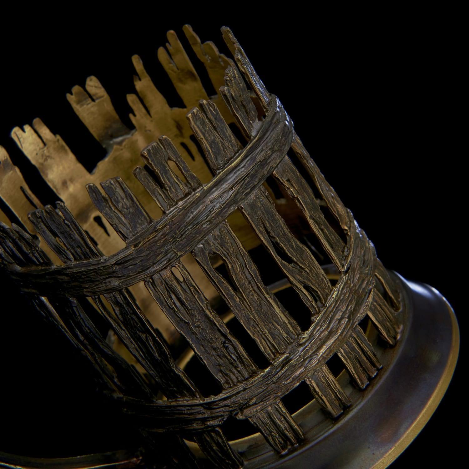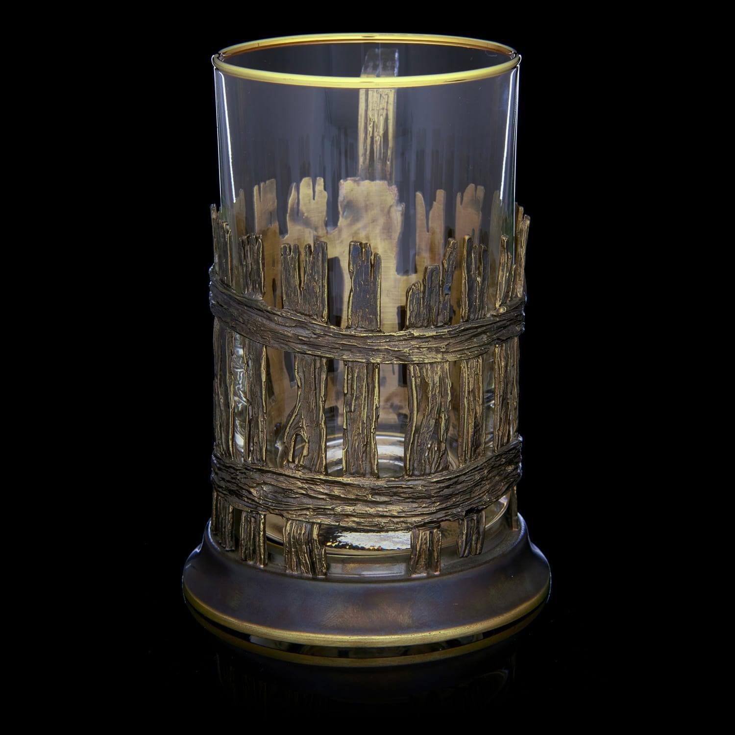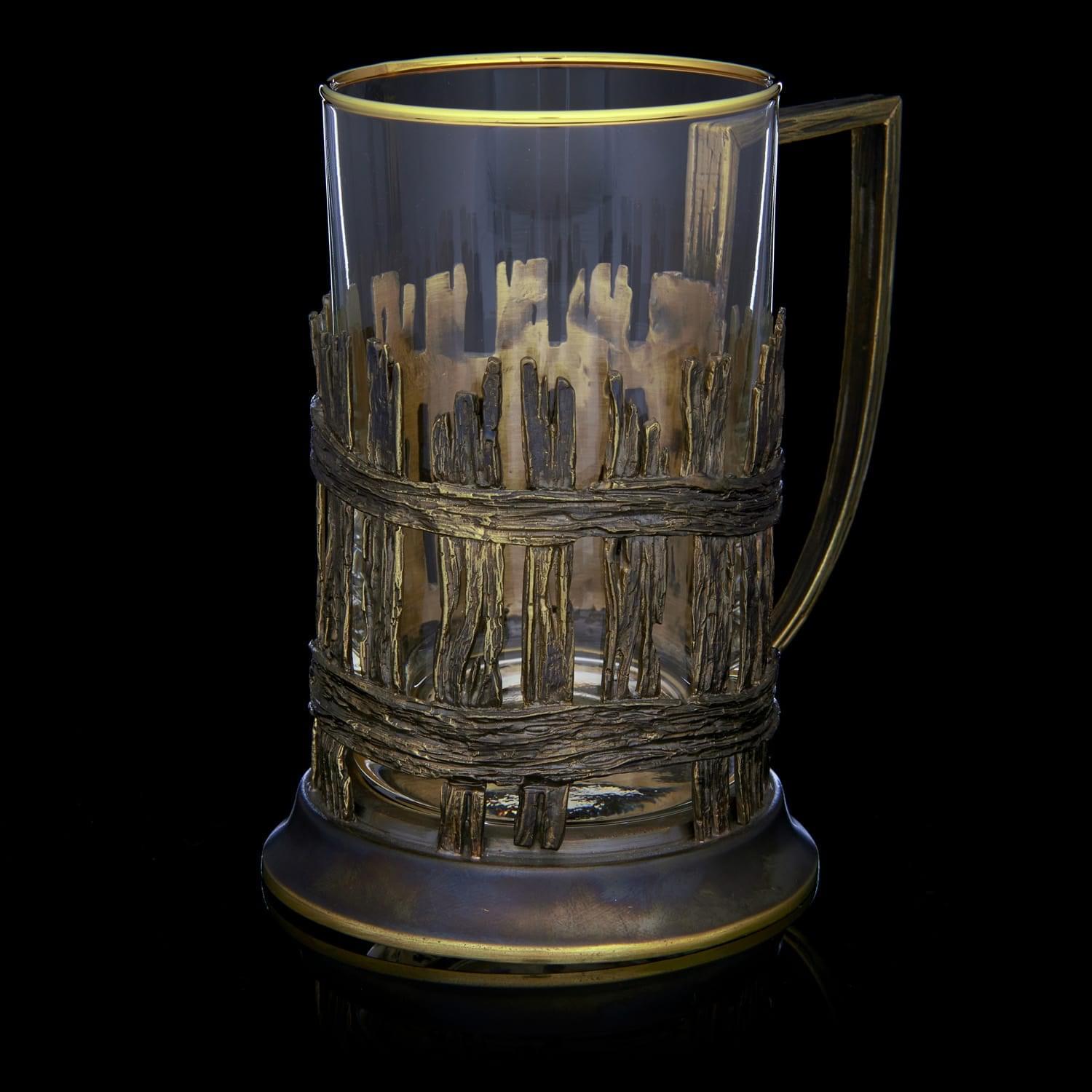 Корпус подстаканника представляет собой авторский образец латунного литья. Он искусно оформлен в соответствии с оригинальным эскизом, предполагающим детальную композицию с образом пастуха. Литой корпус тонирован позолотой и патиной. Имеет удобную фигурную ручку для нескольких пальцев. Вставной стакан сделан из ровного прозрачного стекла.
