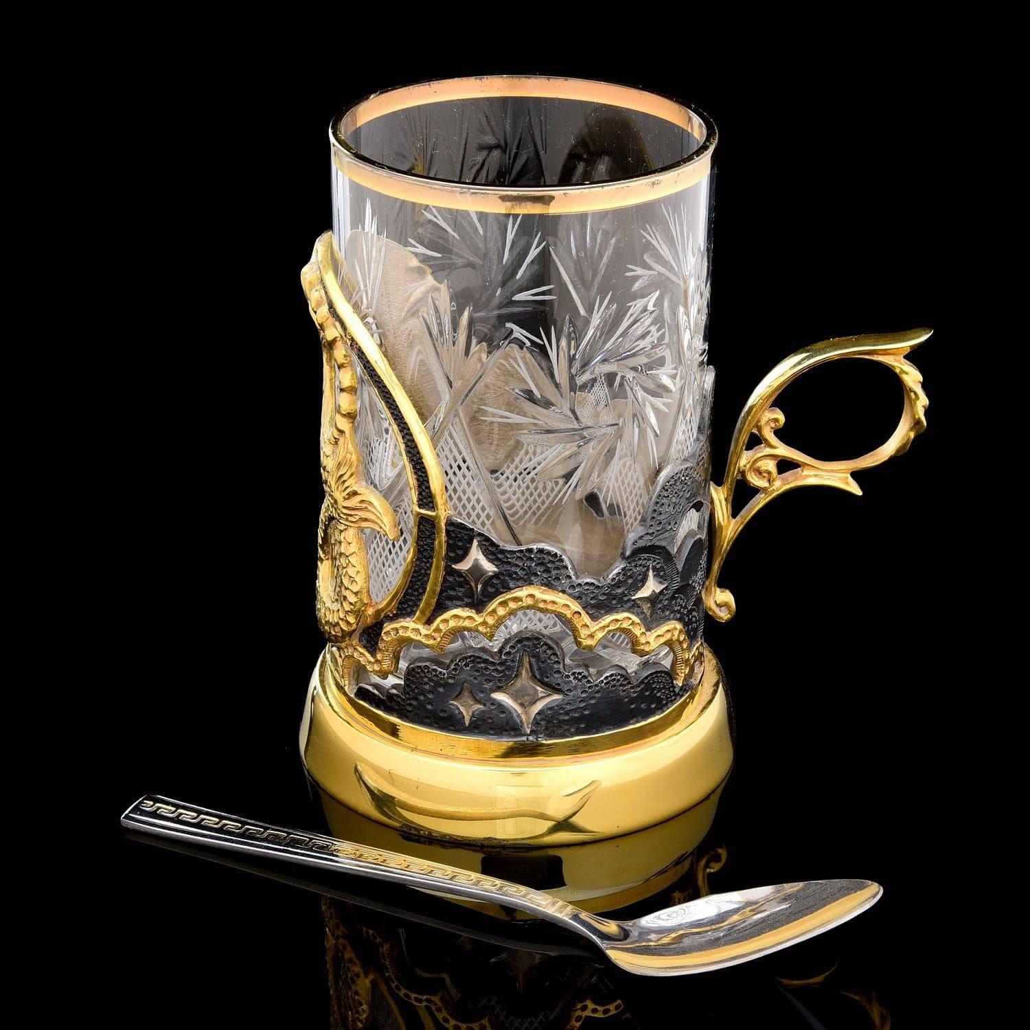 Подставку под стеклянный стакан, с ручкой, названную «подстаканником», традиционно используют в ж/д транспорте как элемент сервировки стола. Она появилась в российских пассажирских поездах в конце 19 века, когда Сергей Витте был директором Департамента железнодорожных дел Министерства финансов и министром путей сообщения Российской империи. Крупное производство подстаканников расположено в городе Кольчугино Владимирской области на заводе столовых приборов и посуды, который основал купец Александр Кольчугин в 19 веке как часть металлургической мануфактуры. Делаются изделия из мельхиора, латуни, меди и серебра. В качестве защитно-декоративного покрытия используются серебро, золото, никель. Чтобы придать подстаканникам рельефность и контрастность, мастера применяют технику чернения, затем полируют поверхность до блеска, многие работы дополнительно гравируют лазером, покрывают эмалью. Данный подстаканник с изображением Козерога украшен в технике Златоустовской гравюры на металле. .