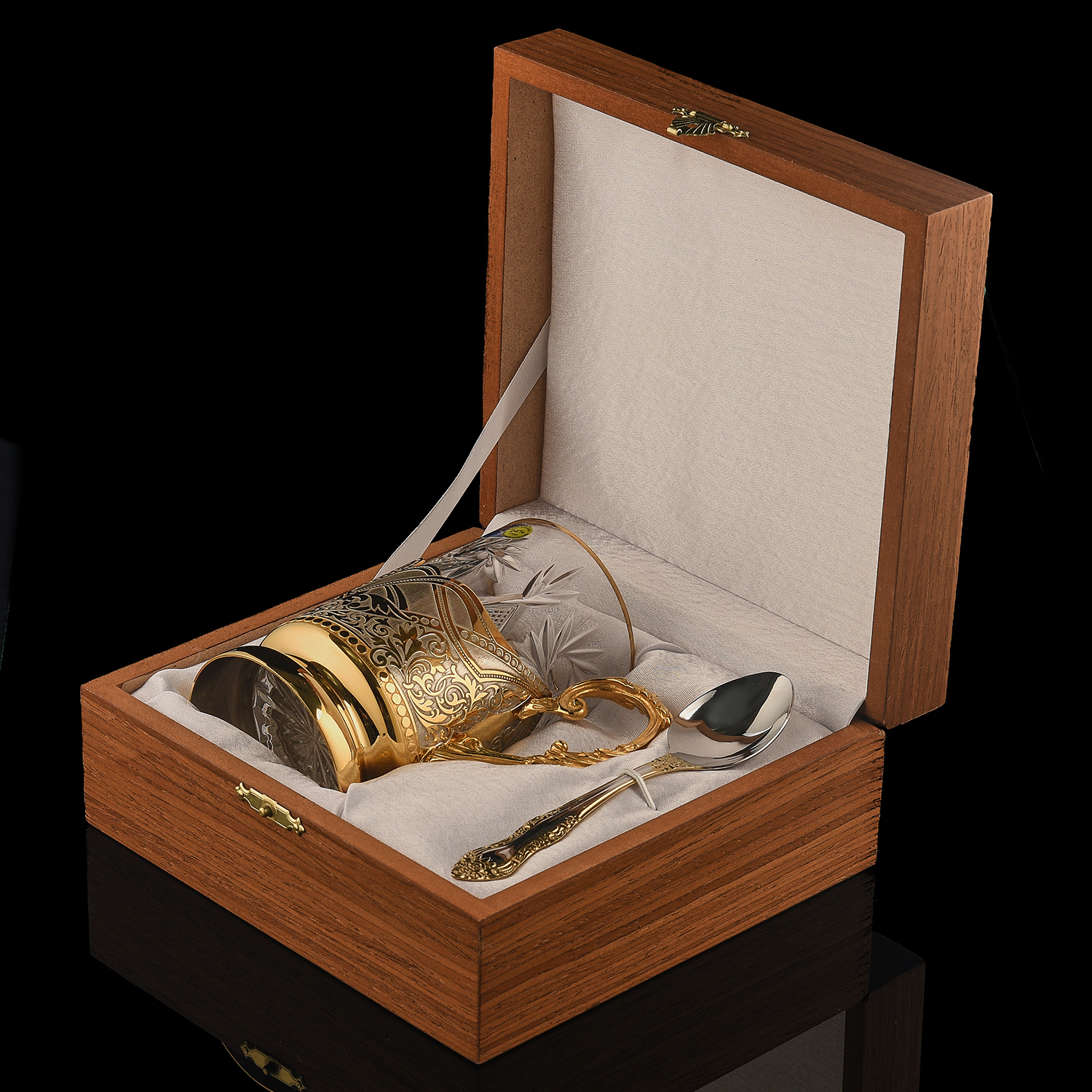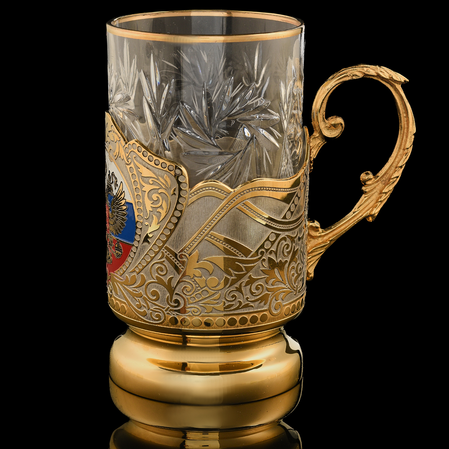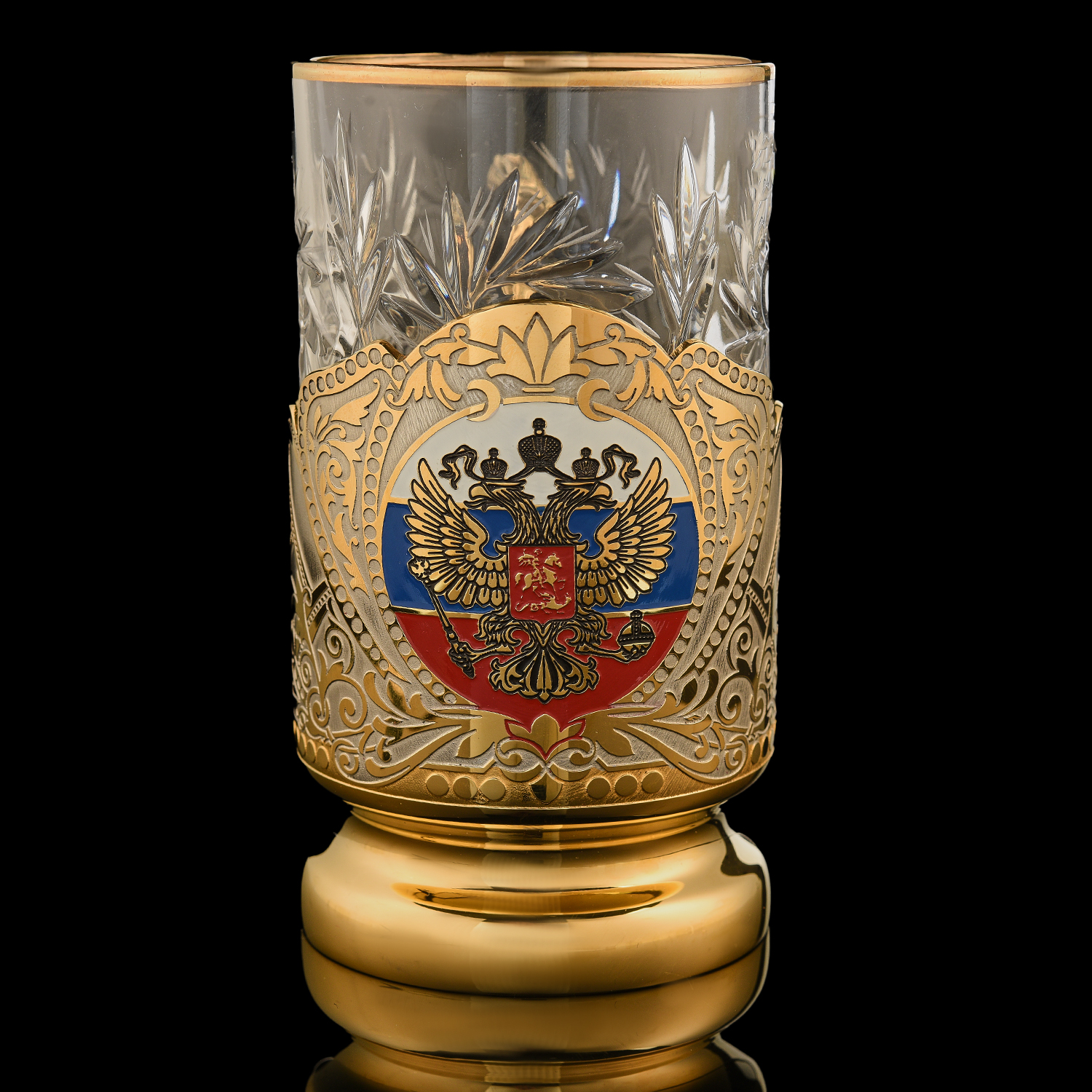 Подстаканник "Герб РФ". Златоуст.Материалы: латунь, никель, золото 999,9*, эмаль, хрусталь.
