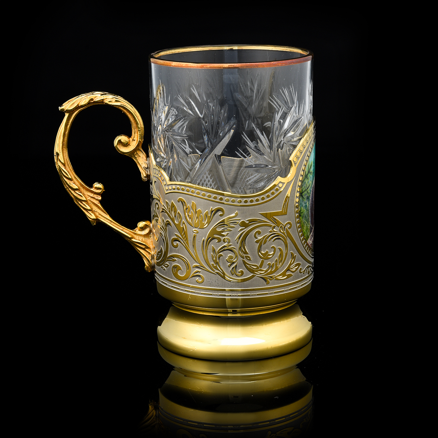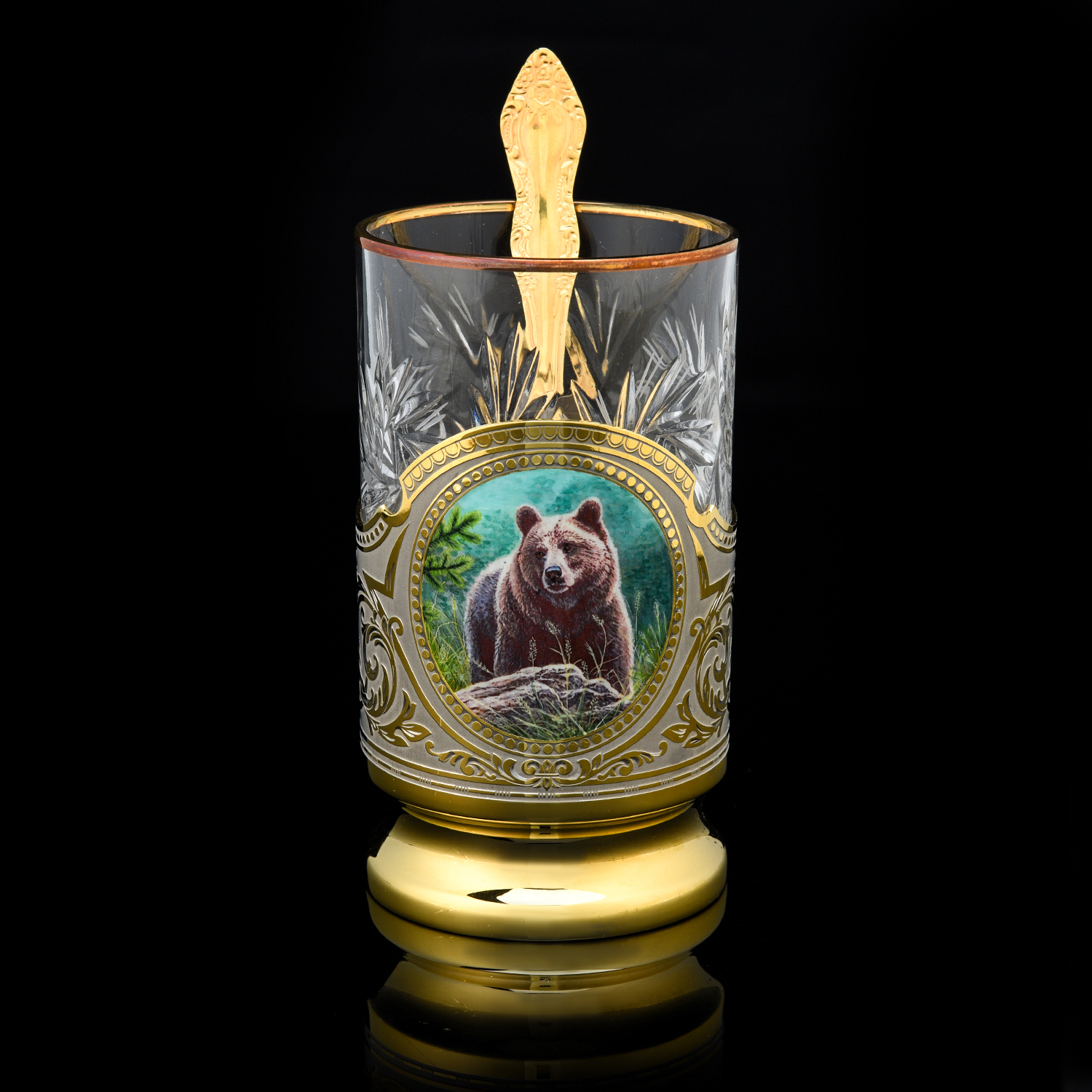 Подстаканник "Медведь". Златоуст.Материалы: латунь, никель, золото 999,9*, эмаль, хрусталь.