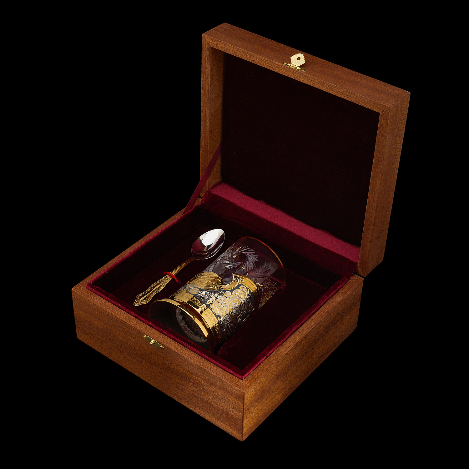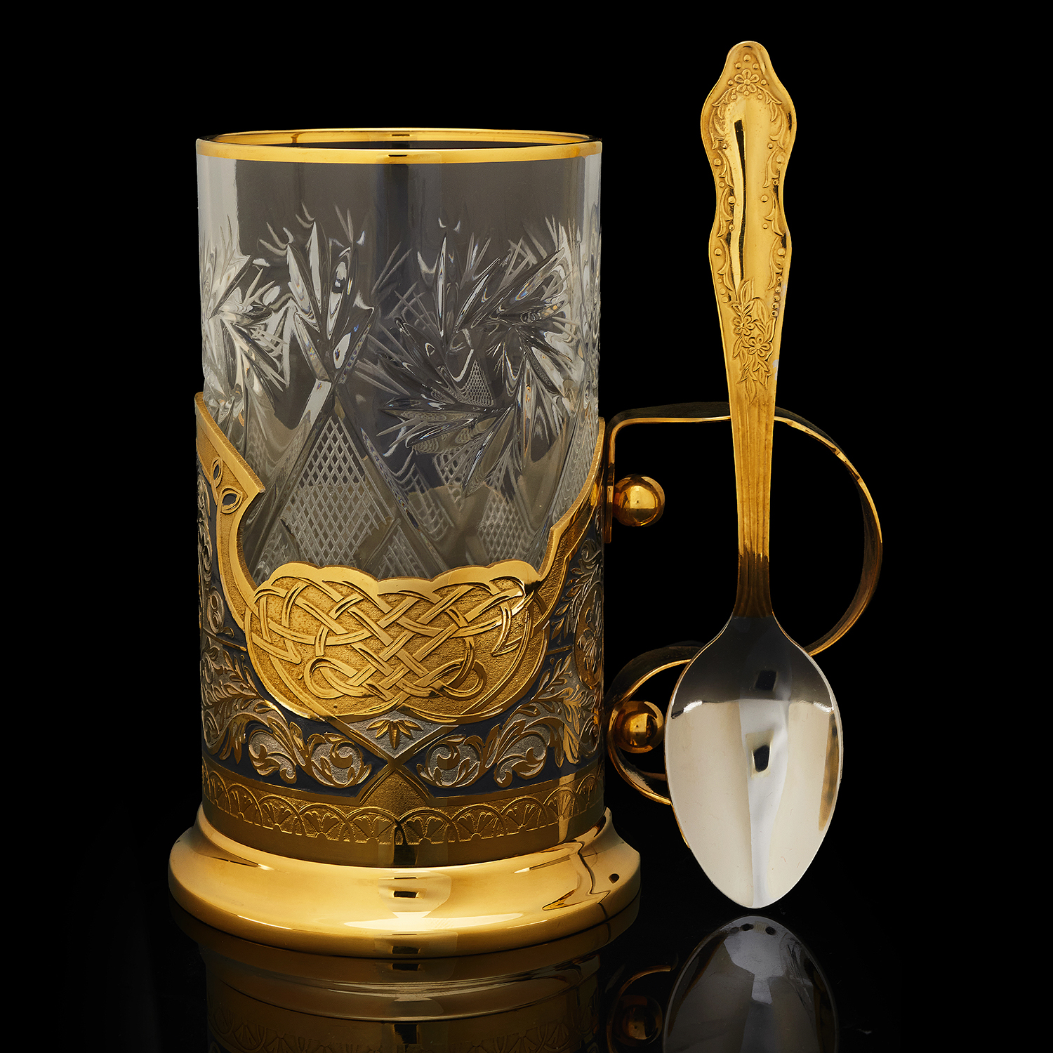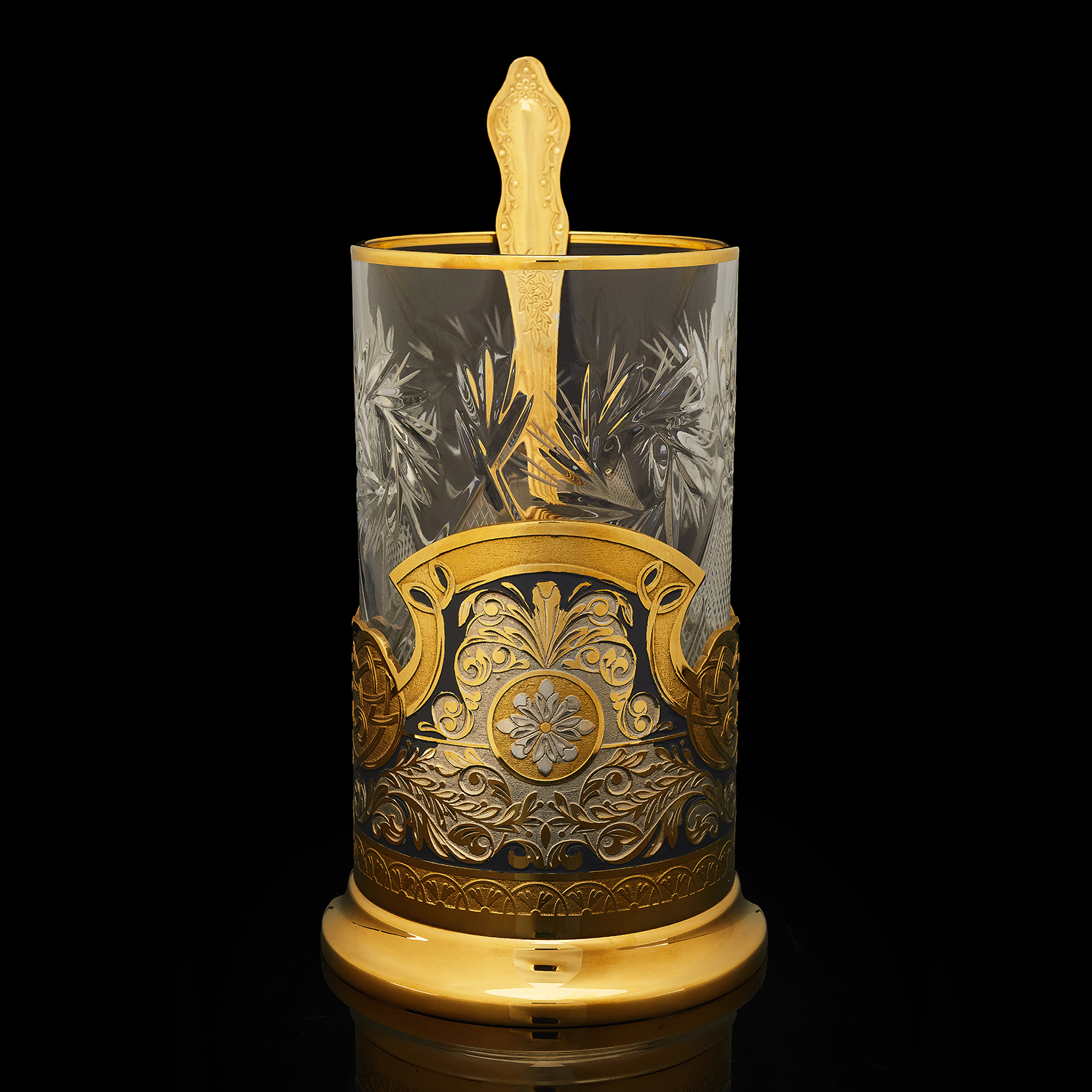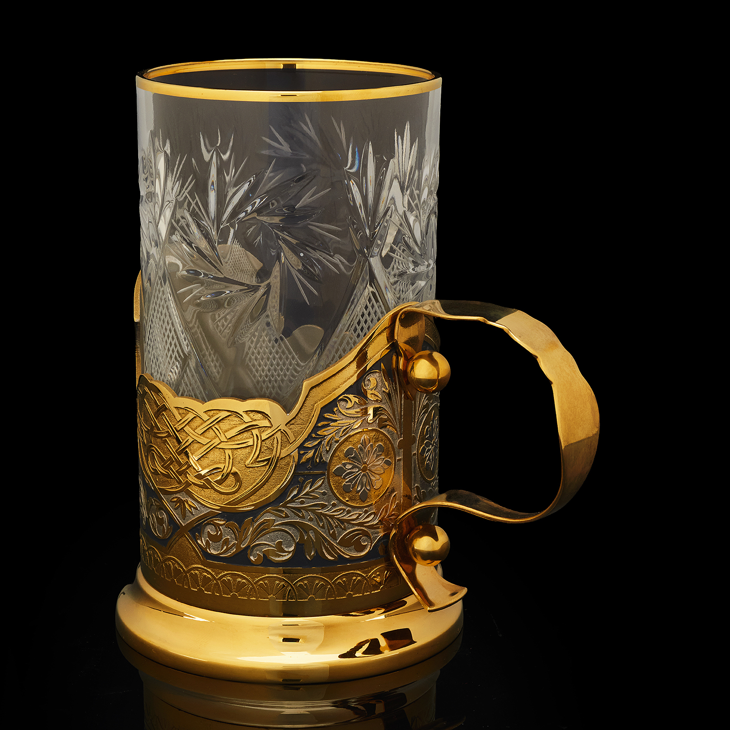 Подстаканник "Орнамент". Златоуст.Материалы: латунь, никель, золото 999,9*, эмаль, хрусталь.