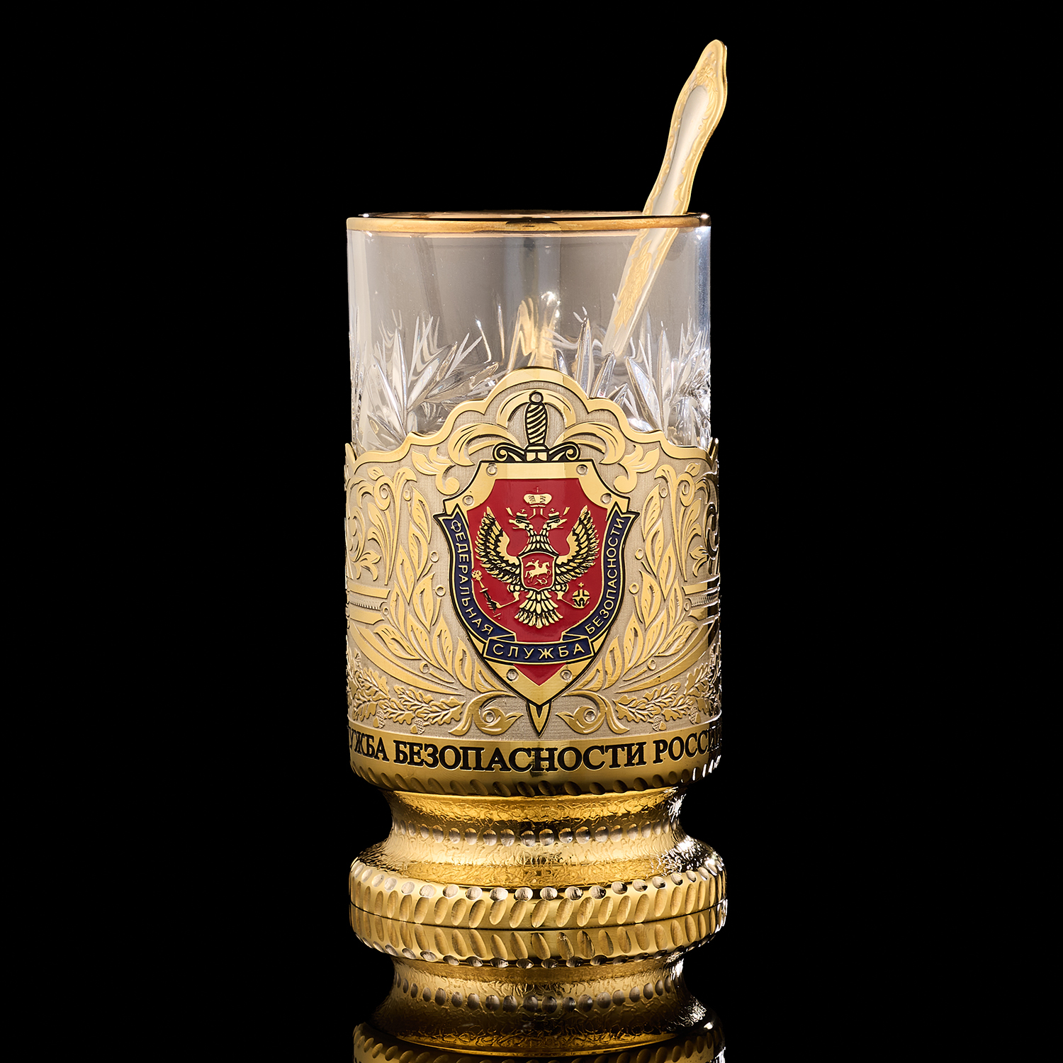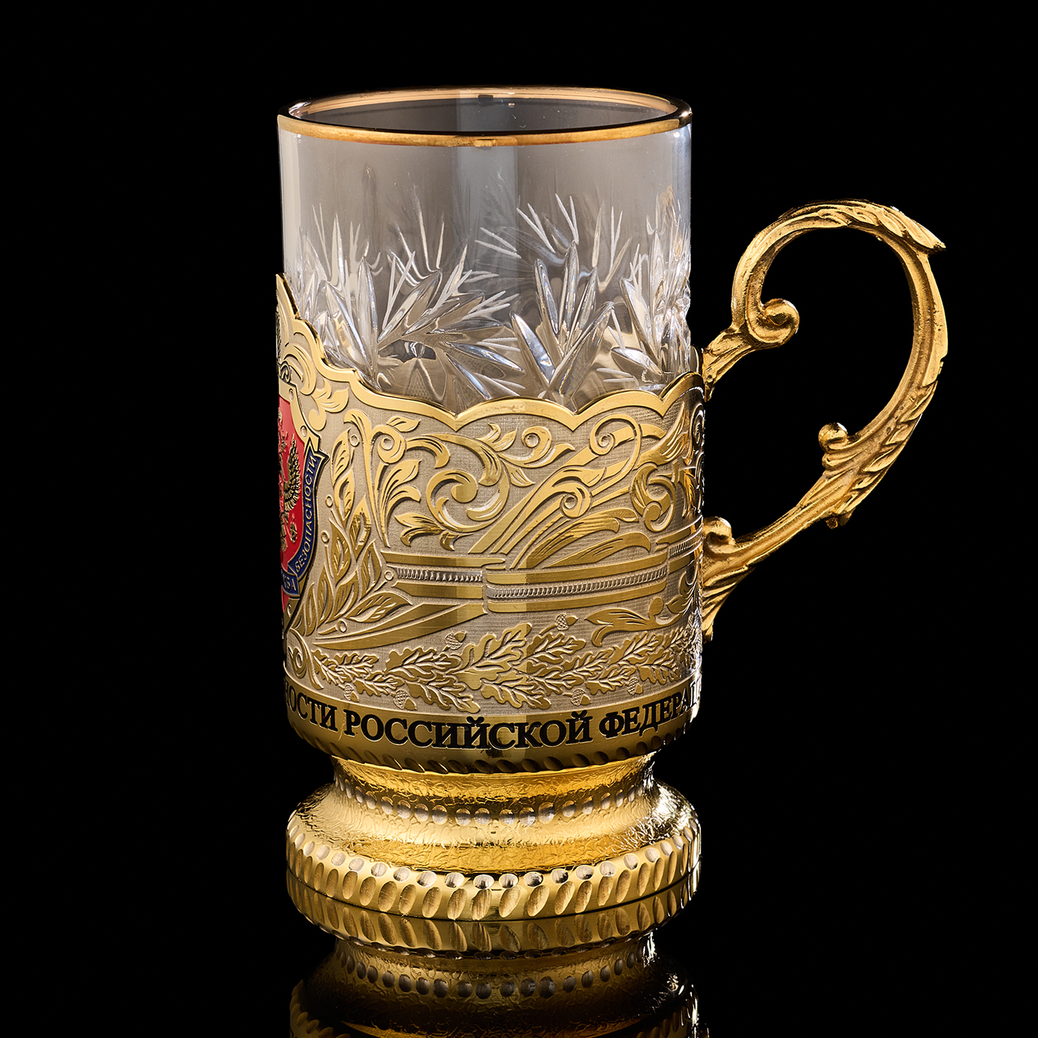 Подстаканник "ФСБ". Златоуст.Материалы: латунь, никель, золото 999,9*, эмаль, хрусталь.