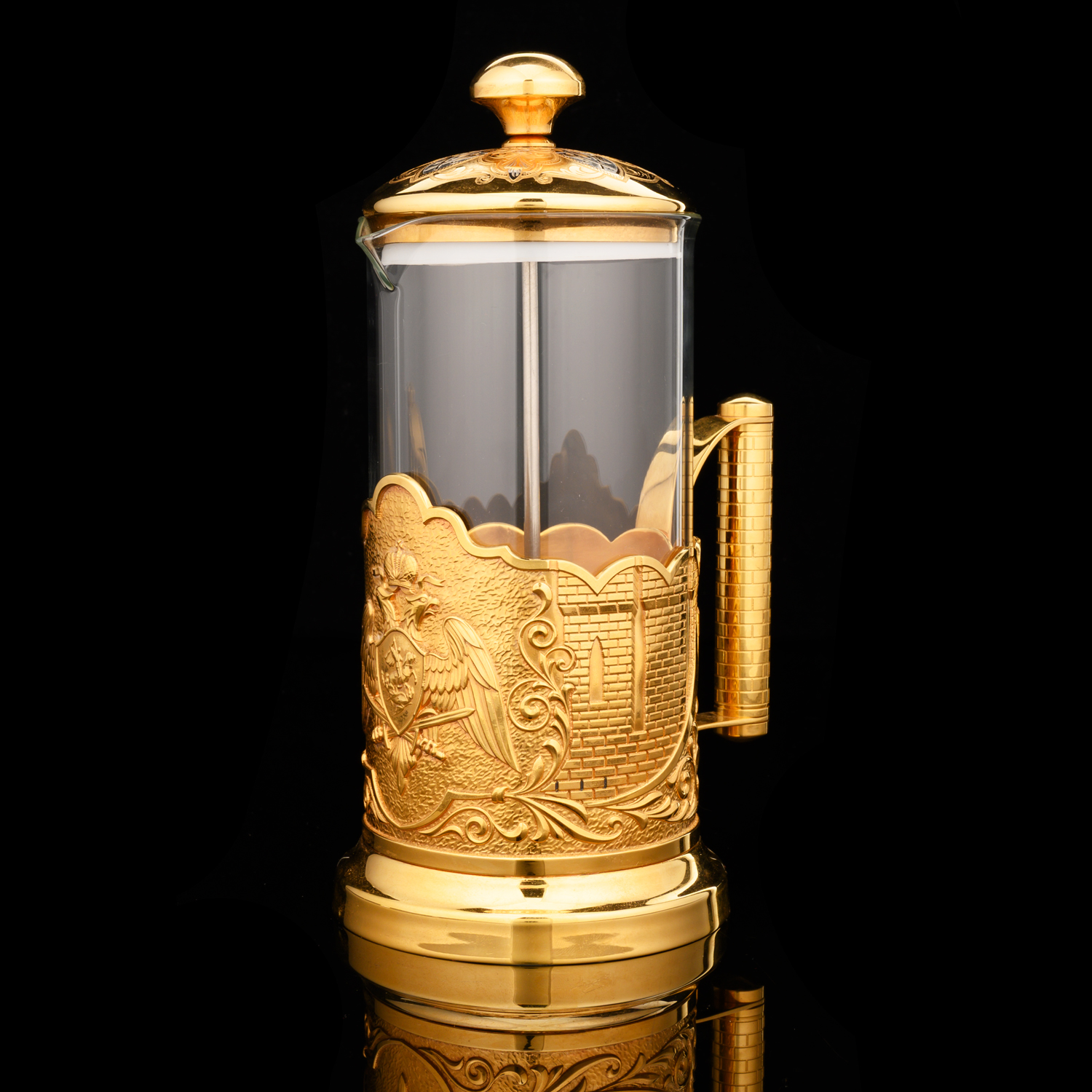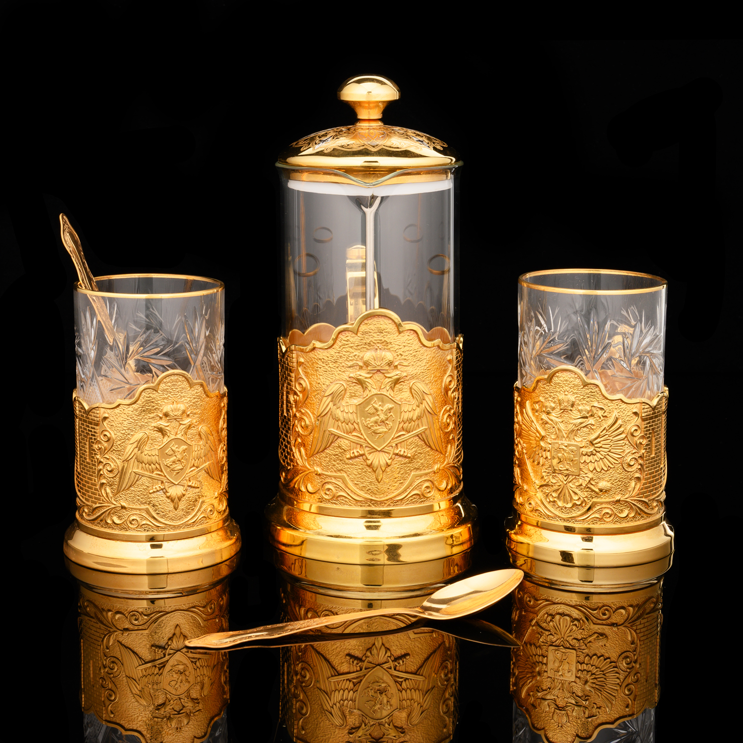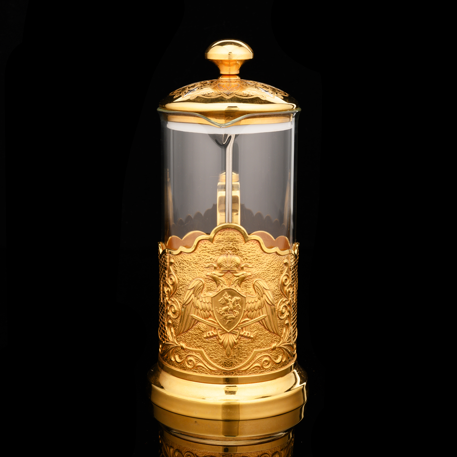 Набор с френч-прессом и подстаканниками "Национальная гвардия РФ". Златоуст.Материалы: латунь, никель, золото 999,9*, стекло.