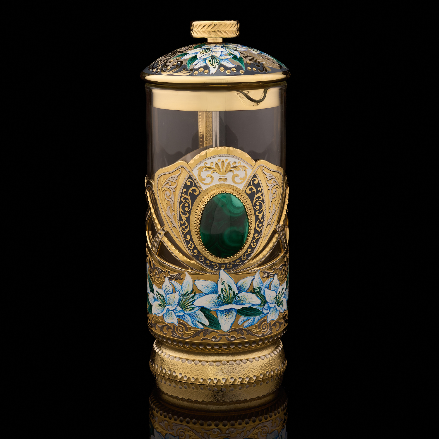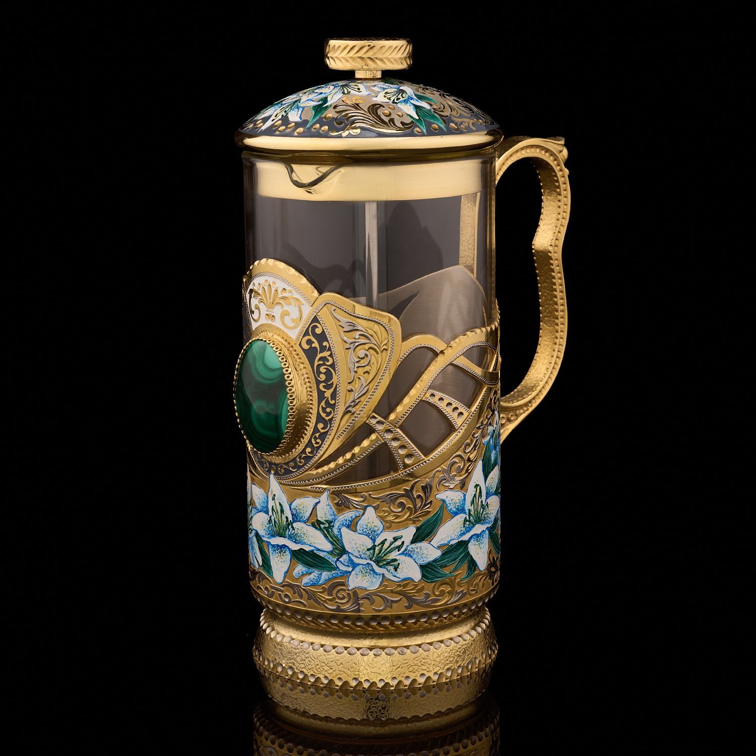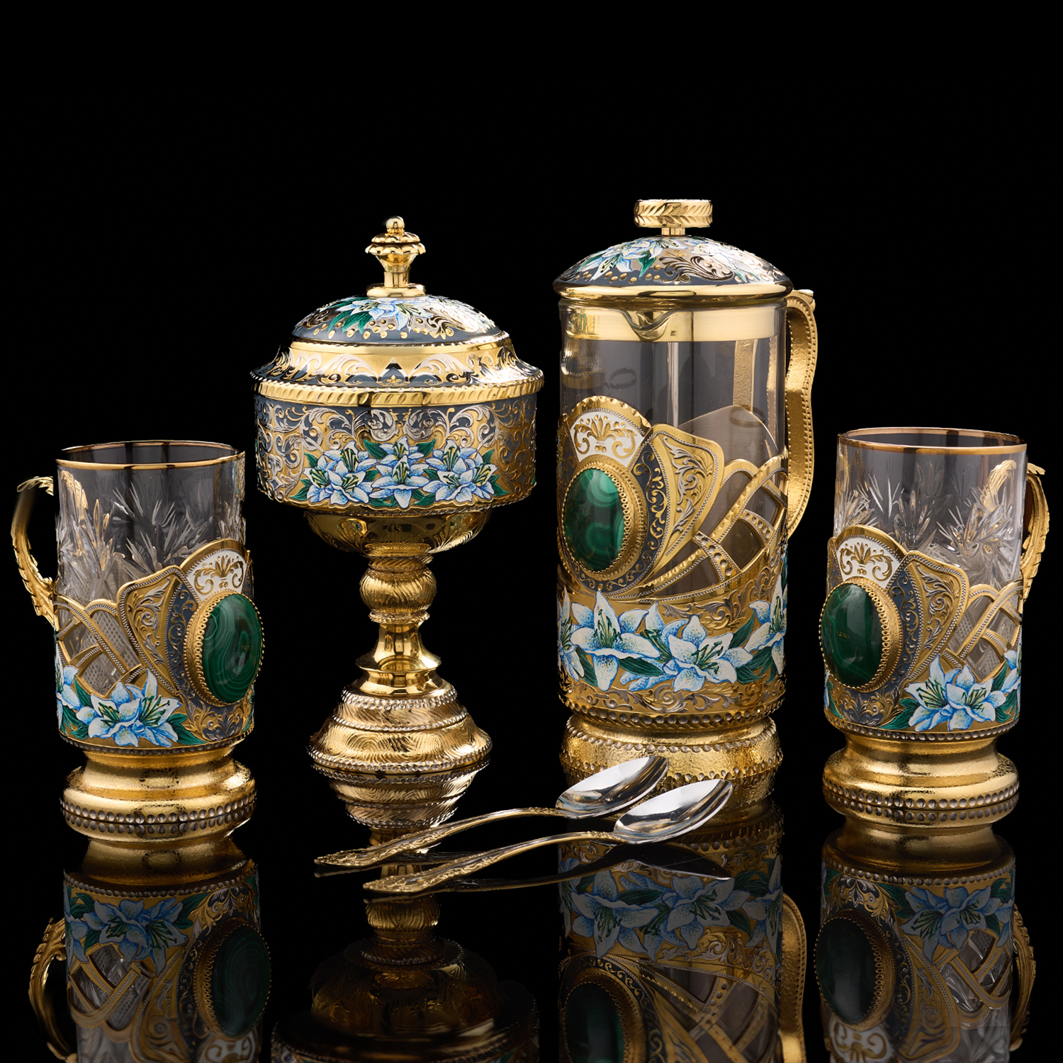 Чайный набор с френч-прессом и подстаканниками "Малахит". Златоуст.Материалы: латунь, никель, золото 999,9*, эмаль, стекло, малахит.