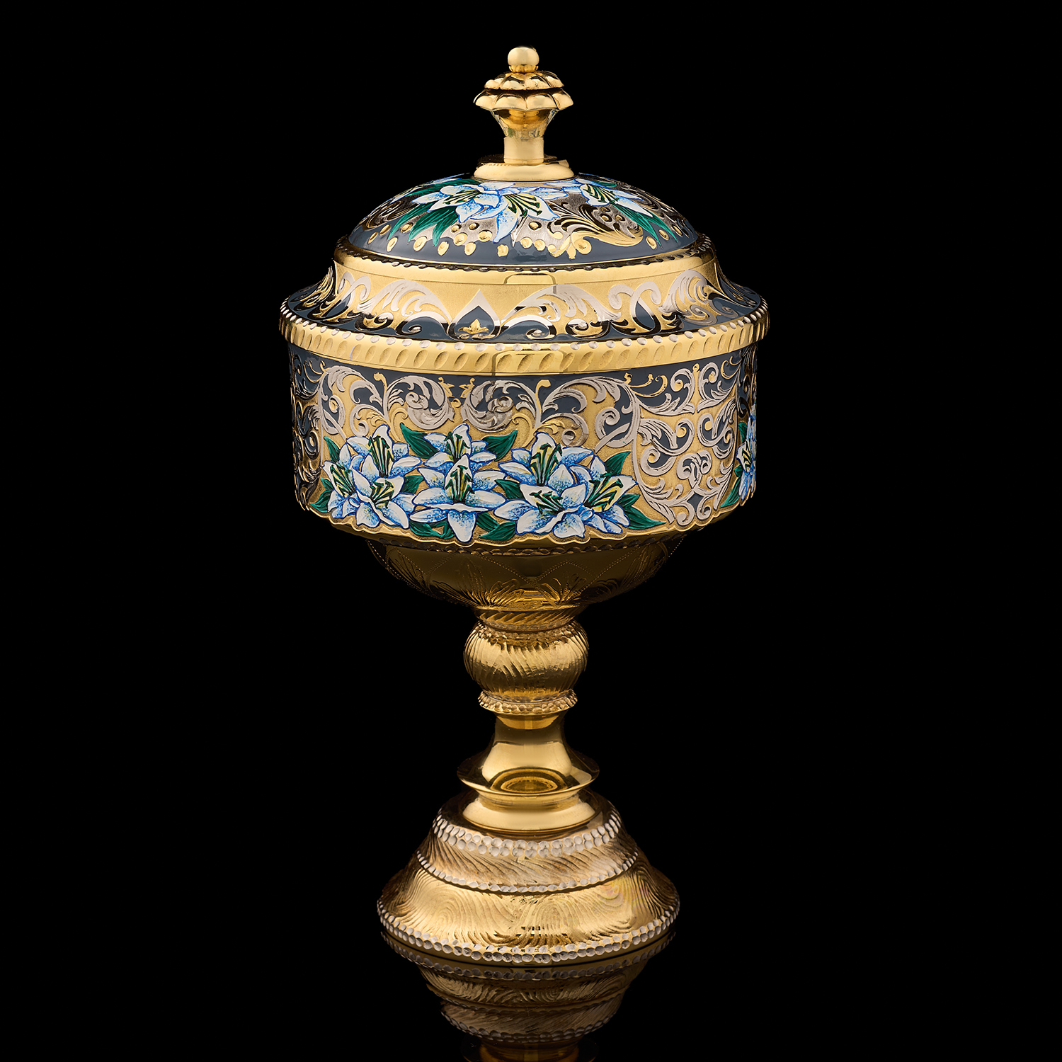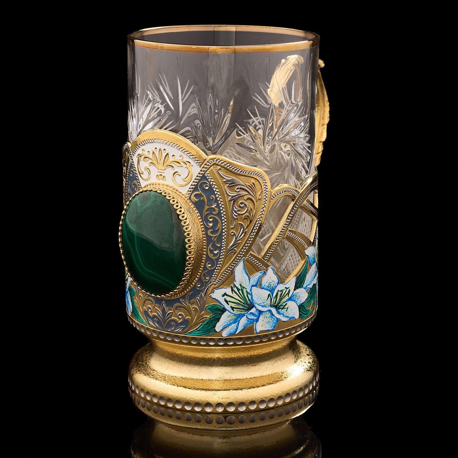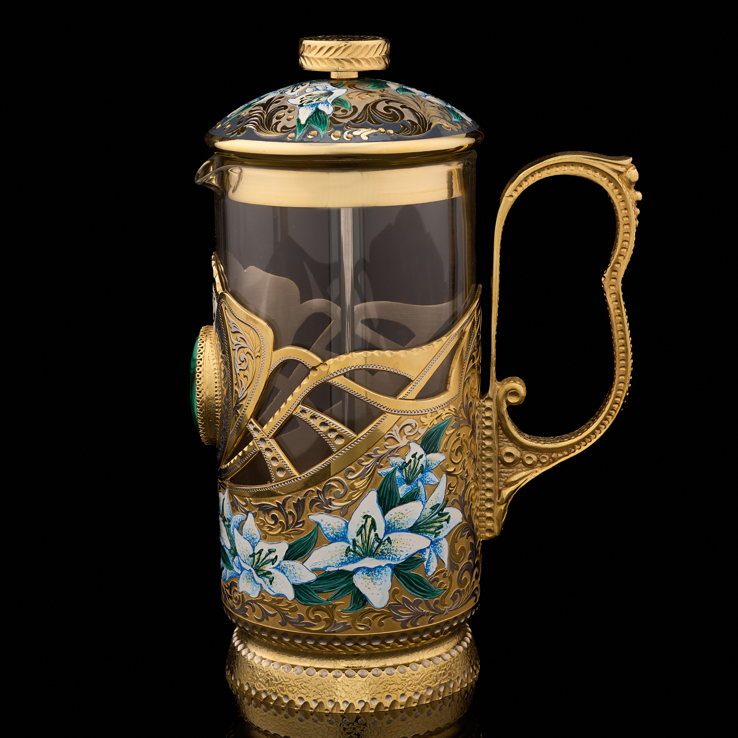 Чайный набор с френч-прессом и подстаканниками "Малахит". Златоуст.Материалы: латунь, никель, золото 999,9*, эмаль, стекло, малахит.