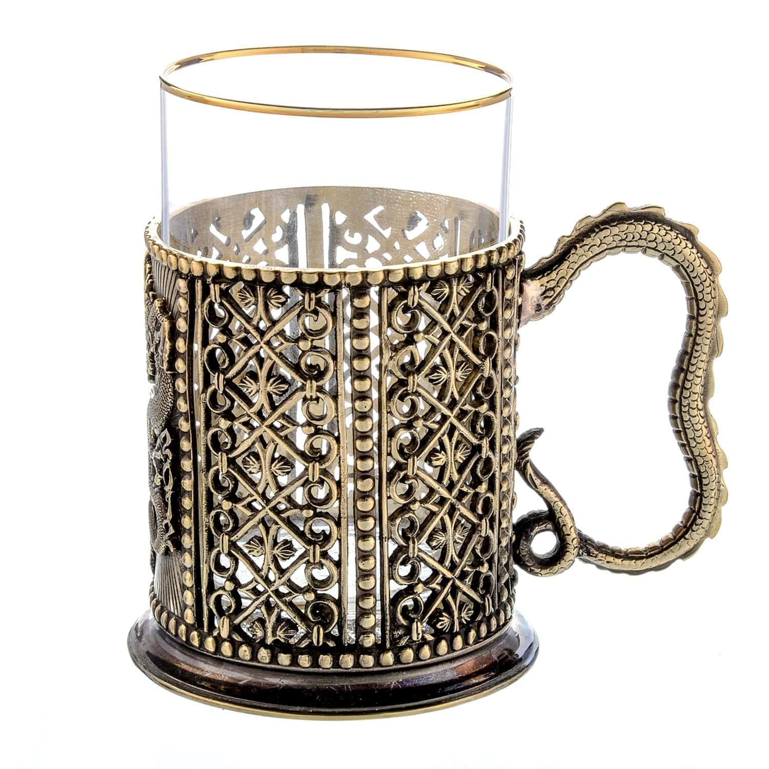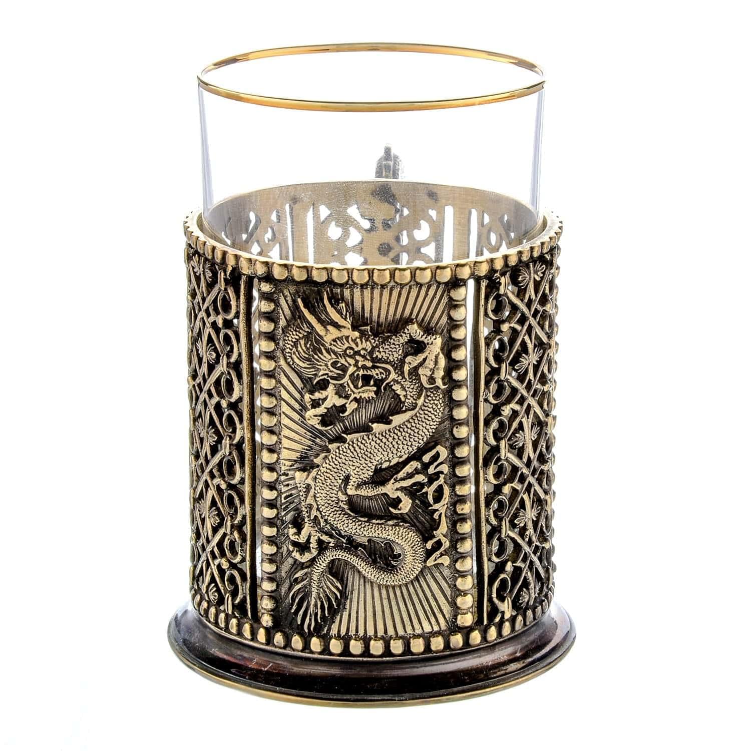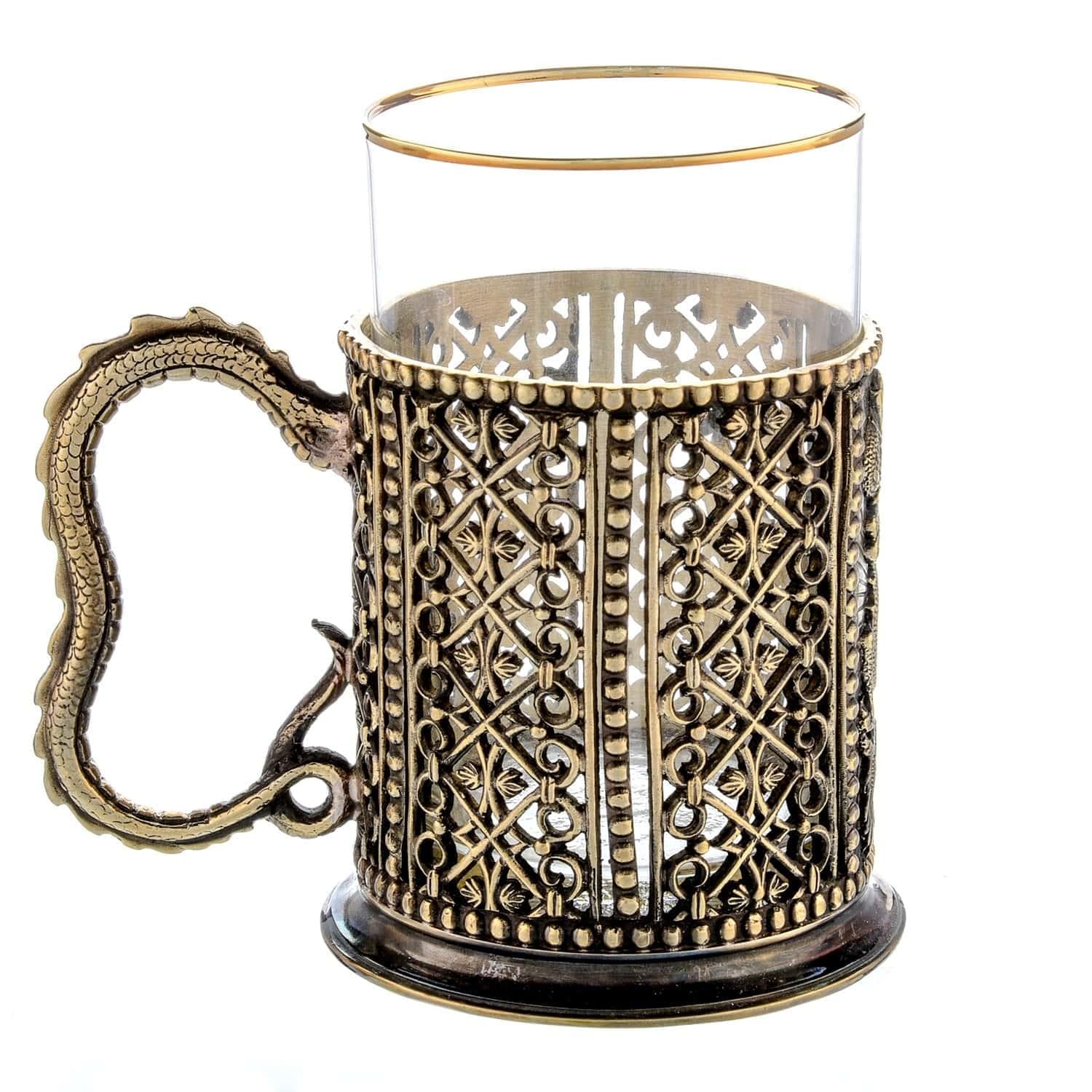Дракон фигурирует в мифологии многих древних культур. Кроме того. что образ гремучего змия ассоциировался на Руси с пьянством, дракон всегда оставался символом силы и великодушия, мудрости и выносливости. Вашему вниманию - эксклюзивный сосуд для распития горячих и холодных напитков и прекрасная альтернатива чашке, подстаканник "Дракон". Его корпус сделан по авторскому эскизу из латуни; в него помещается стакан из высококачественного прозрачного стекла, декорированный золотой каёмкой.