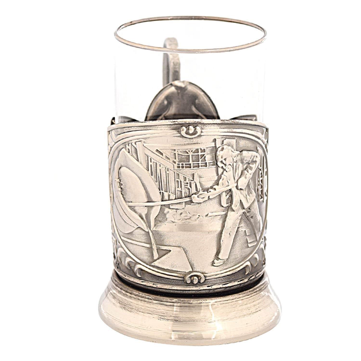 Вставной стакан, по традиции, украшен изящной серебряной каймой. Корпус подстаканника, представленного у нас в 2 вариантах, отлит из металлического сплава на основе никеля и оформлен в техниках серебрения. Для этого подстаканника Вы можете приобрести стильную подарочную упаковку из нашего ассортимента. Авторская работа, подстаканник "Металлург" - это прекрасный подарок для делового мужчины, женщины, коллеги, друга, руководителя, партнера по бизнесу по любому подходящему случаю, в том числе на профессиональный праздник, День металлурга. Стакан в комплект не входит.