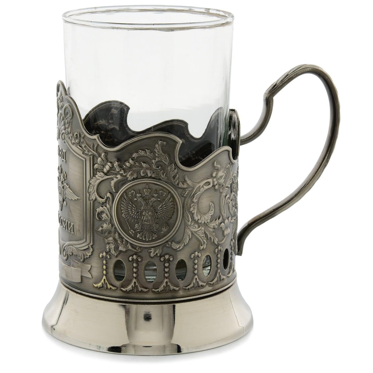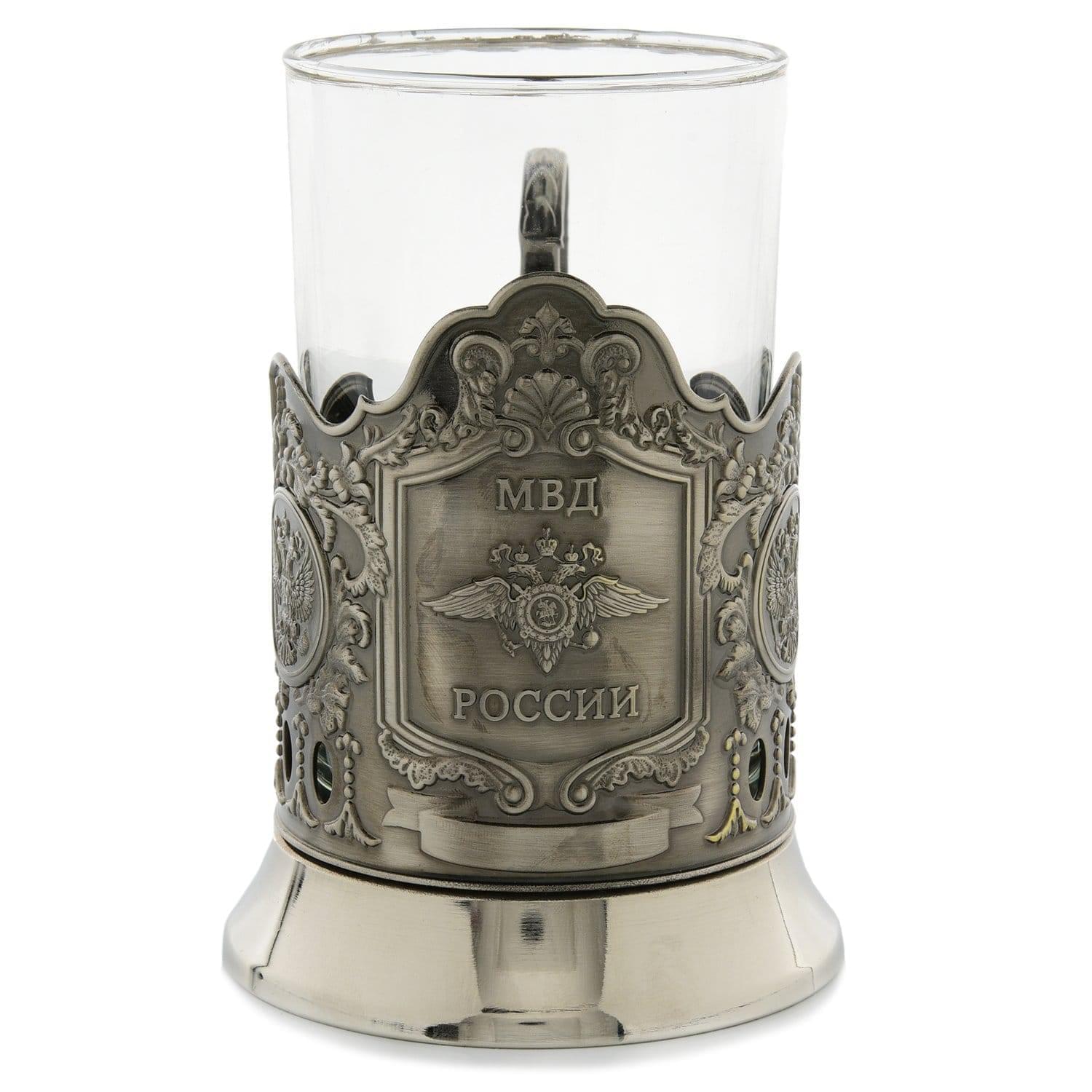 С геральдическим знаком - эмблемой МВД на металлическом корпусе, этот подстаканник - практичный вариант подарка-сувенира, подчеркивающего должностной статусВ качестве подарка подстаканник со вставным прозрачным стаканом - прекрасная альтернатива кружке.