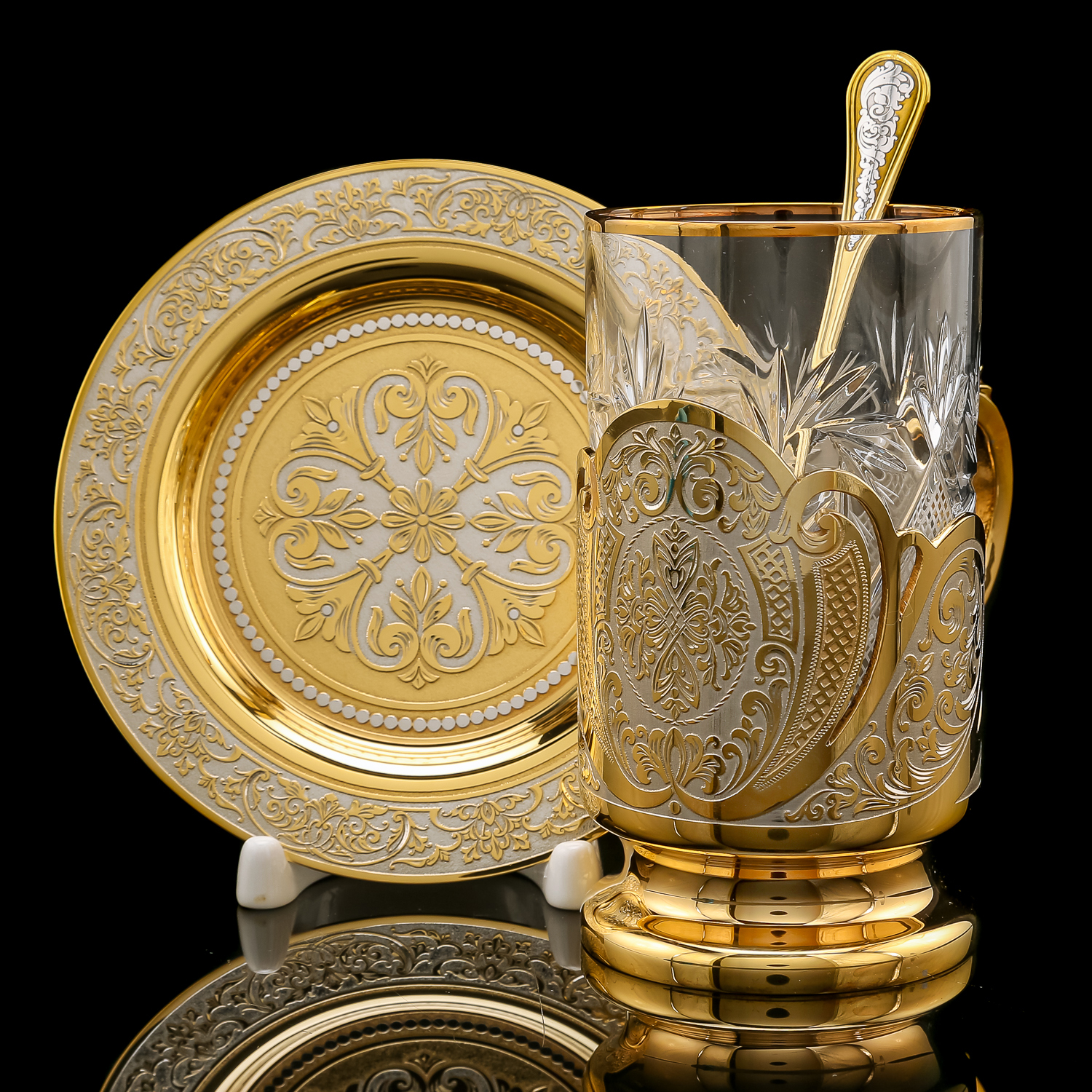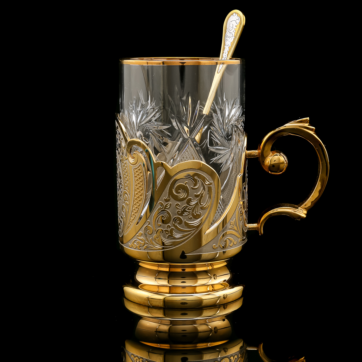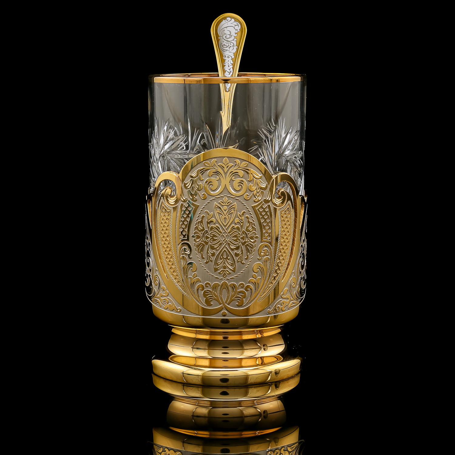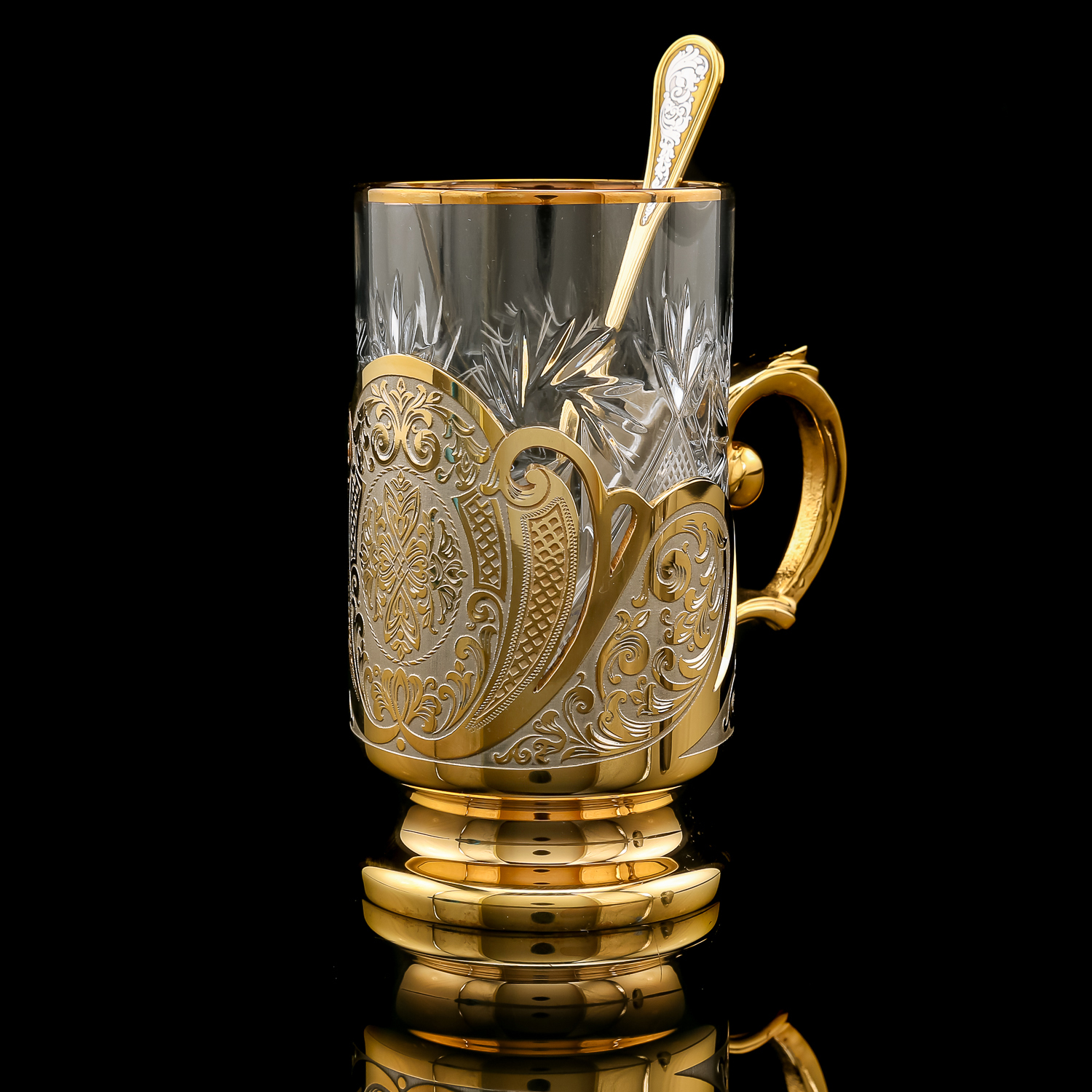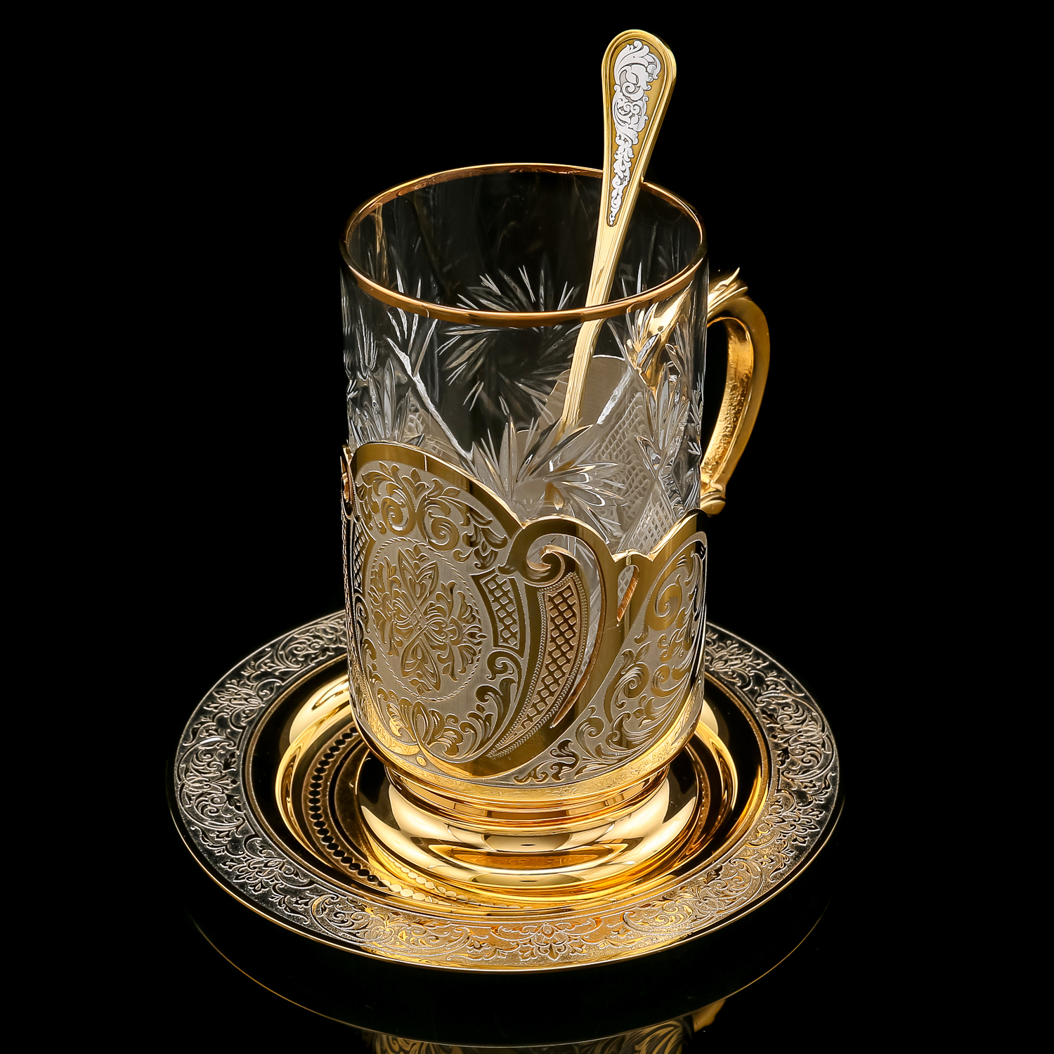 Чайный набор с подстаканником. Златоуст.Материалы: латунь, никель, золото 999,9*, хрусталь.