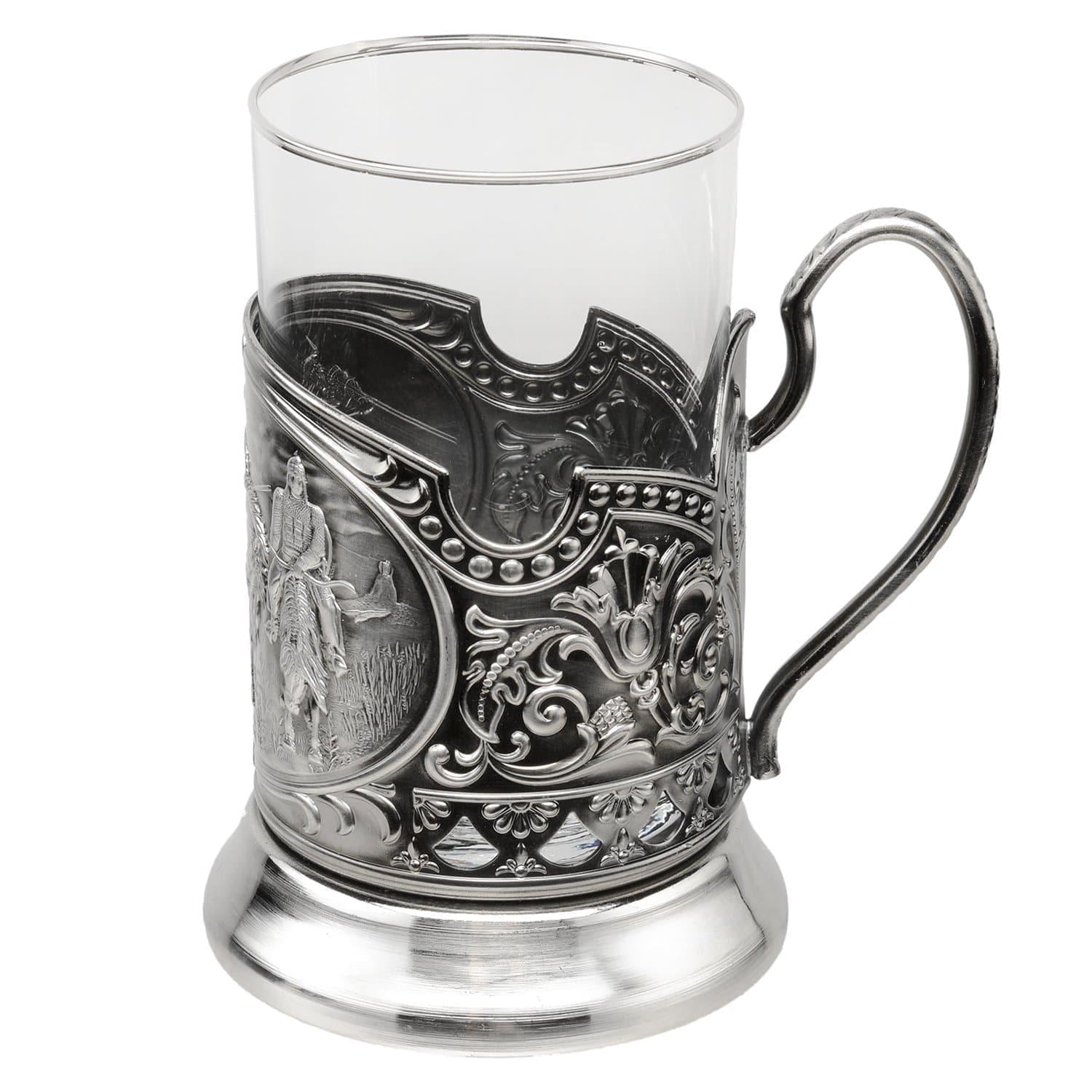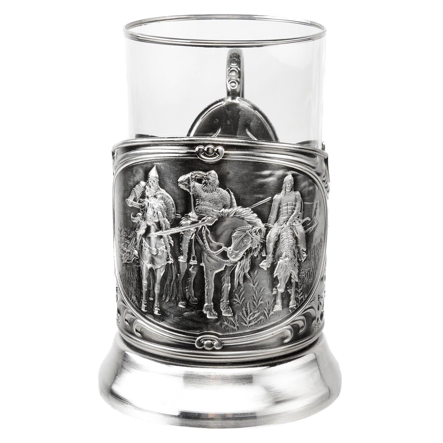 Легендарные герои русского народного героического эпоса, три богатыря изображены на корпусе подстаканника со стаканом. Три мужчины на коне атлетичного телосложения - символы мужественности и доблести. Подставку под стеклянный стакан, с ручкой, названную «подстаканником», традиционно используют в ж/д транспорте как элемент сервировки стола. Она появилась в российских пассажирских поездах в конце 19 века, когда Сергей Витте был директором Департамента железнодорожных дел Министерства финансов и министром путей сообщения Российской империи. Крупное производство подстаканников расположено в городе Кольчугино Владимирской области на заводе столовых приборов и посуды, который основал купец Александр Кольчугин в 19 веке как часть металлургической мануфактуры. Делаются изделия из мельхиора, латуни, меди и серебра. В качестве защитно-декоративного покрытия используются серебро, золото, никель. Чтобы придать подстаканникам рельефность и контрастность, мастера применяют технику чернения, затем полируют поверхность до блеска, многие работы дополнительно гравируют лазером, покрывают эмалью. Методом чеканки изготавливаются штампы для каждой подставки. Кстати, День работников нефтяной и газовой промышленности отмечается в России ежегодно в первое воскресенье сентября. .