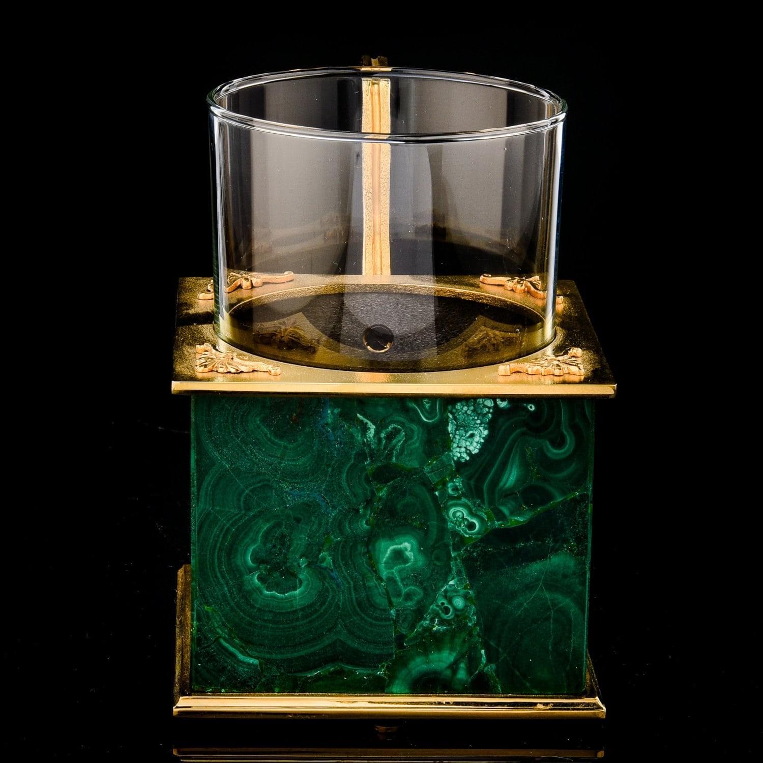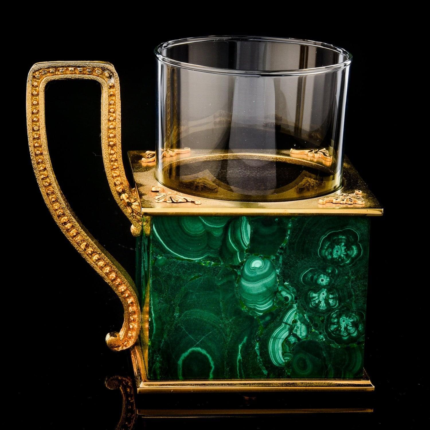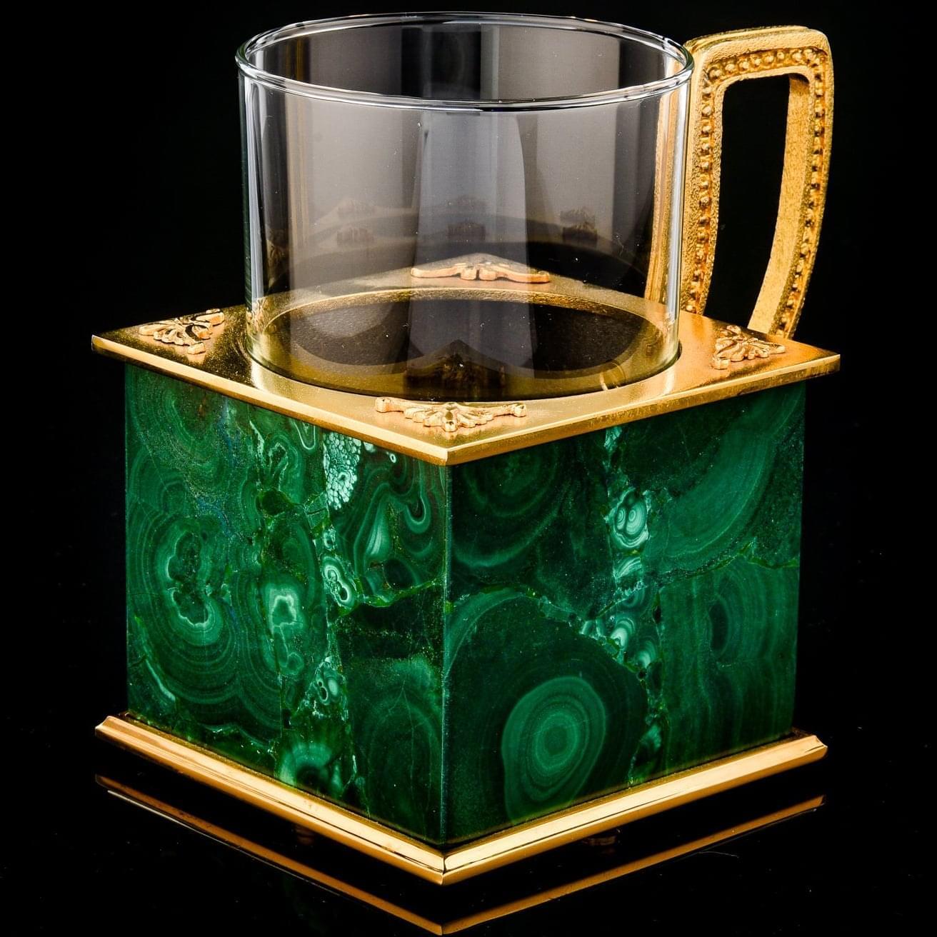 Дизайнерский подстаканник создан для почитателя кубизма. Он очарует ценителя размеренных чаепитий и стильных интерьерных украшений. Корпус подстаканника оформлен из литейной бронзы. Вставки на корпусе оформлены из малахита. Подстаканник как предмет обихода в русском стиле из металла и стекла оригинального дизайна получил широкое распространение во времена государственной деятельности министра Витте. В 19 веке в оформлении ручки и тулова преобладали мотивы неорококко и неоклассицизма. В конце 19 века появились подстаканники в виде сруба крестьянской избы, высокого бревенчатого забора, бочонка, кадушки, плетеного берестяного кузовка. Тулово украшалось гравюрами, литыми накладками, резными орнаментами. Чеканные или штампованные, с рельефными изображениями богатырей, исторических и бытовых сценок, подстаканники вошли в обиход русского человека и в конце концов стали ходовыми русскими сувенирами. .