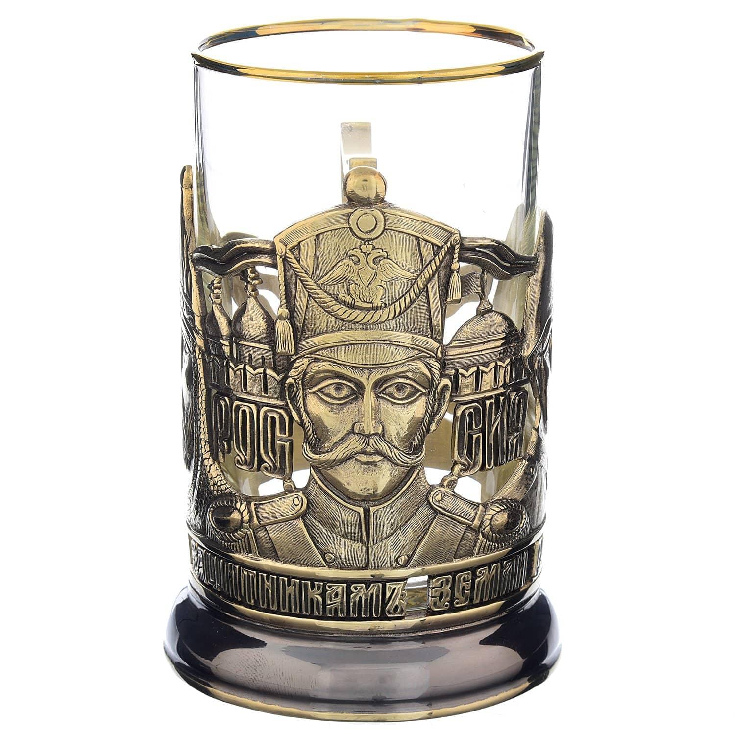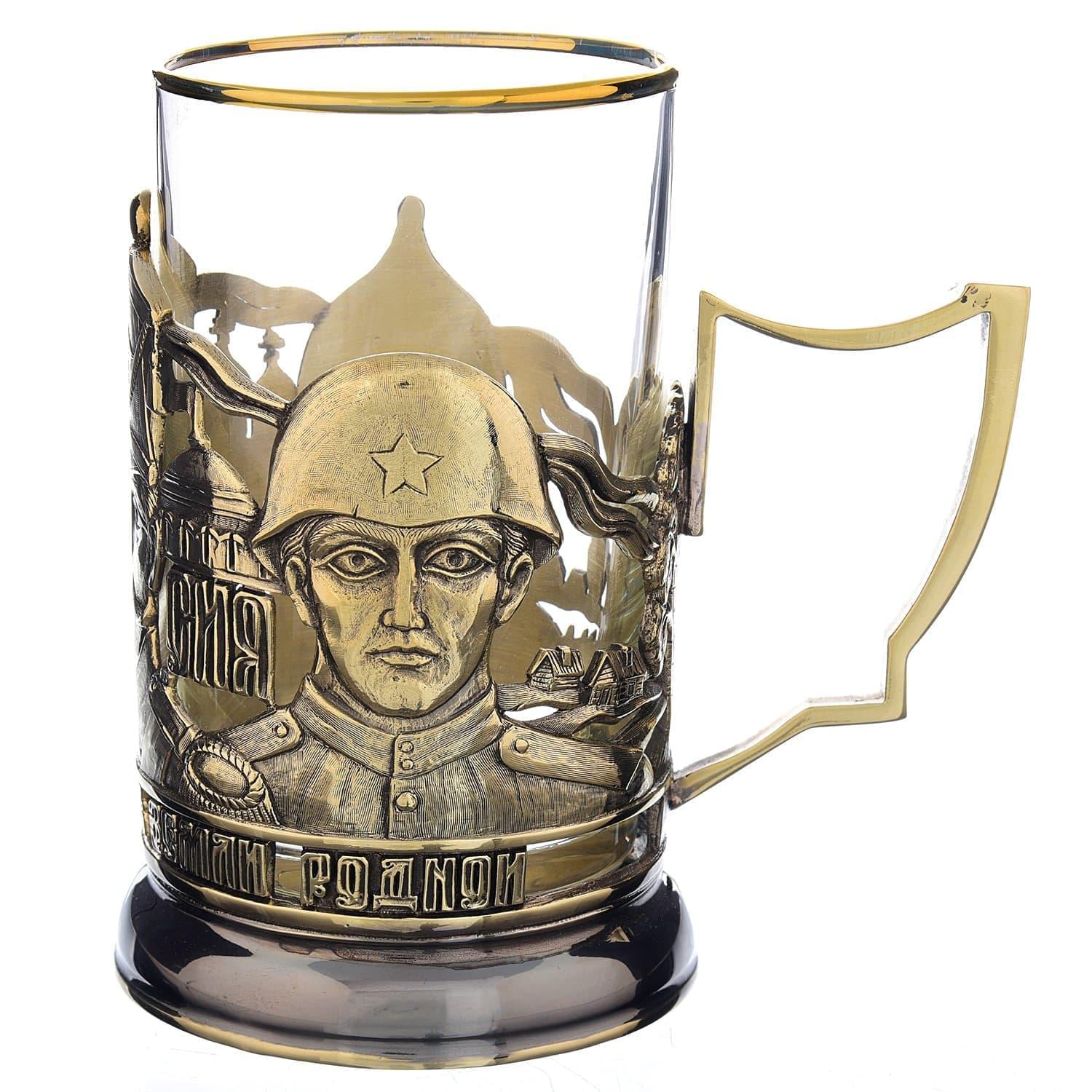 Вариант адресного подарка с говорящим названием.Вашему вниманию - ХИТ продаж Галереи подарков, питейный сосуд подстаканник, который представляет собой двухчастное произведение декоративно-прикладного искусства от художников по металлу и стеклу. Металлическая часть корпуса с образом защитника Отечества изготовлена мастером бронзового литья в соответствии с оригинальным авторским эскизом - минуя стадию создания модели из воска / дерева / слоновой кости - из металлического медного сплава, латуни.