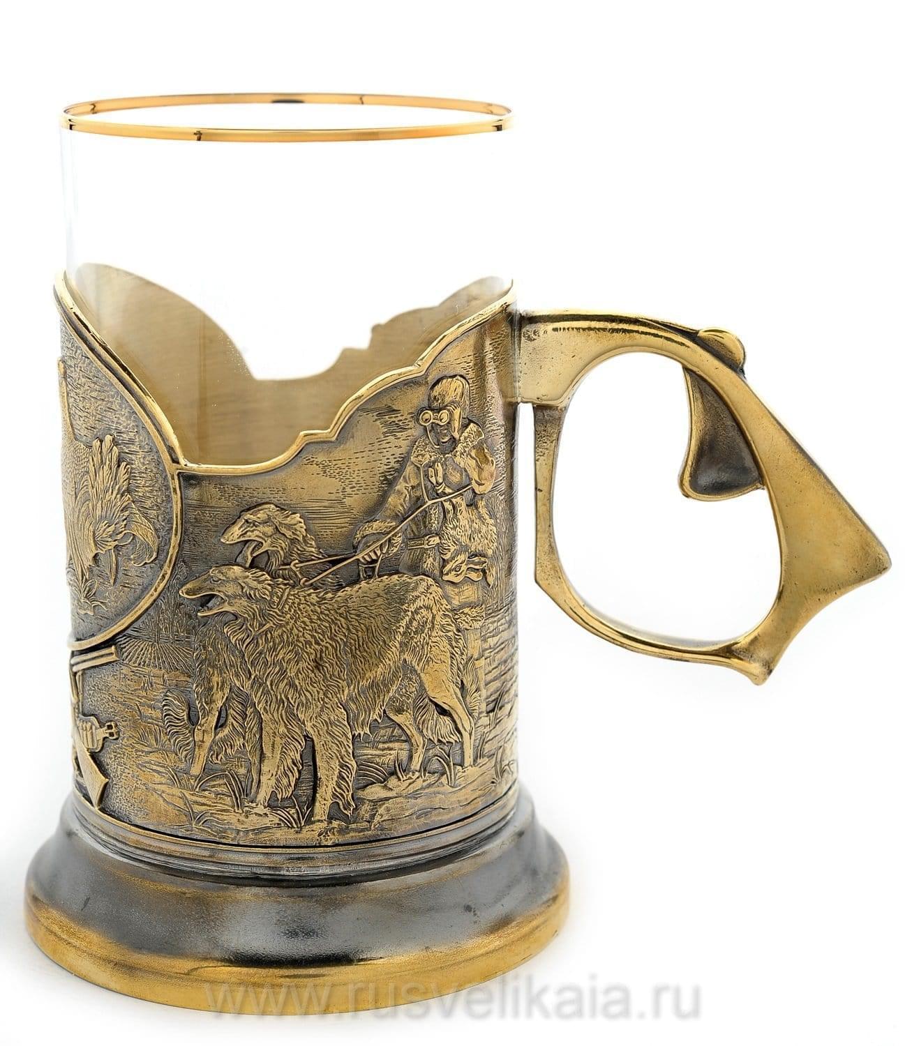 Фигурный корпус подстаканника изготовлен в технике металлического литья из медного сплава, латуни. Литье выполнено по авторскому эскизу. Корпус тонирован позолотой и патиной. Корпус имеет ручку, которая вмещает сразу несколько пальцев.
