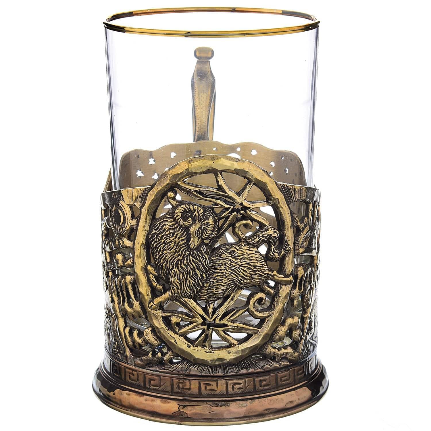 Рады предложить Вашему вниманию ХИТ продаж Галереи подарков - дизайнерский питейный сосуд в русском стиле, предназначенный для горячих и холодных напитков. Подстаканник изготовлен мастером латунного литья в соответствии с оригинальным авторским эскизом - минуя стадию создания модели из воска / дерева / слоновой кости - из металлического медного сплава латуни. Металлический корпус тонирован позолотой и патиной с целью придания объемов изображениям в рамках композиции с зодиакальным символом, образом овна.Подстаканник авторского дизайна со вставным стаканом из прозрачного стекла точно не останется лежать без дела.