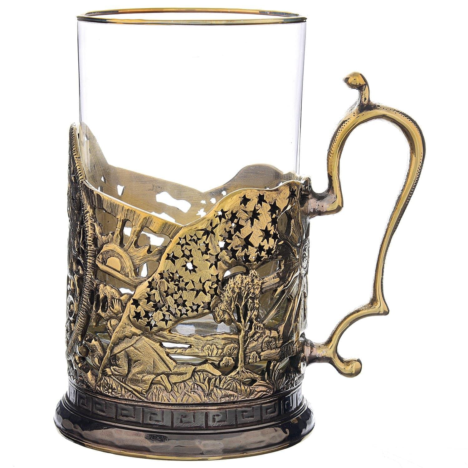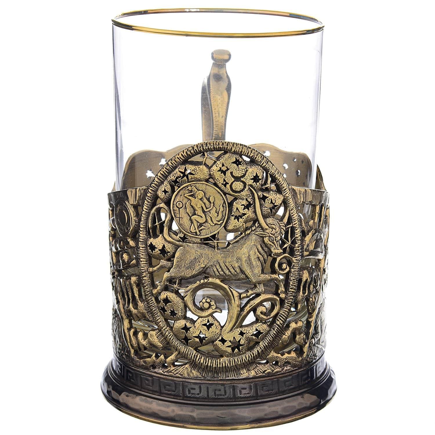 Рады предложить Вашему вниманию ХИТ продаж Галереи подарков - дизайнерский питейный сосуд в русском стиле, предназначенный для горячих и холодных напитков. Подстаканник изготовлен мастером латунного литья в соответствии с оригинальным авторским эскизом - минуя стадию создания модели из воска / дерева / слоновой кости - из металлического медного сплава латуни. Металлический корпус тонирован позолотой и патиной с целью придания объемов изображениям в рамках композиции с зодиакальным символом, тельцом.Подстаканник авторского дизайна со вставным стаканом из прозрачного стекла точно не останется лежать без дела.