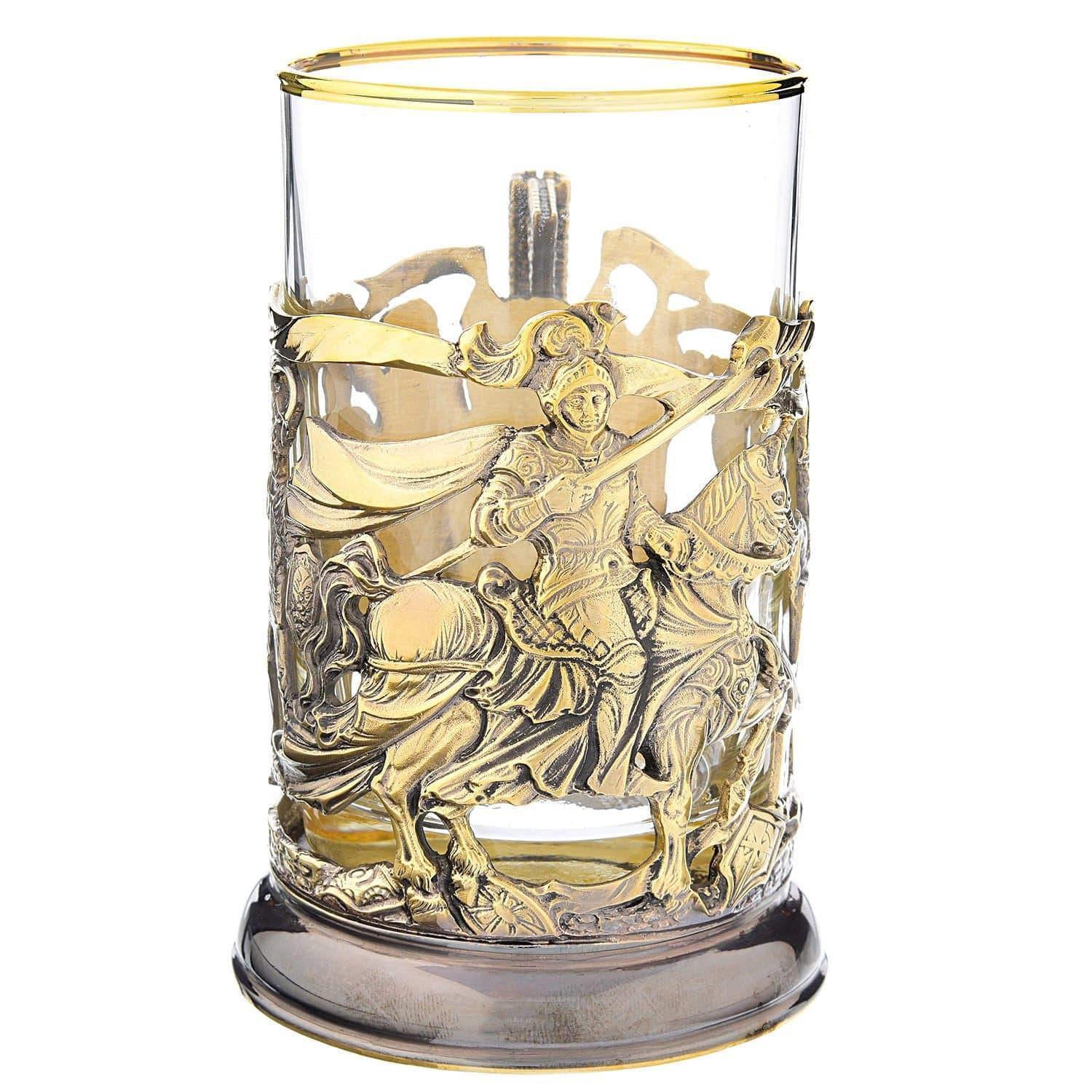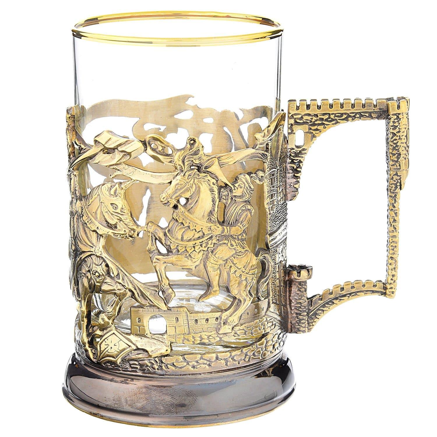 Вашему вниманию - сувенирное изделие, которое представляет собой сосуд для питья, интерьерный аксессуар, образец художественного литья. В металлический корпус подстаканника вставляется стакан. Корпус представляет собой прорезную детальную композицию с образами рыцарей эпохи Средневековья, тонированную эффектной позолотой.