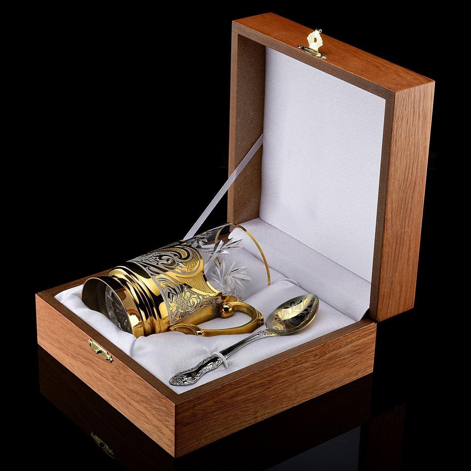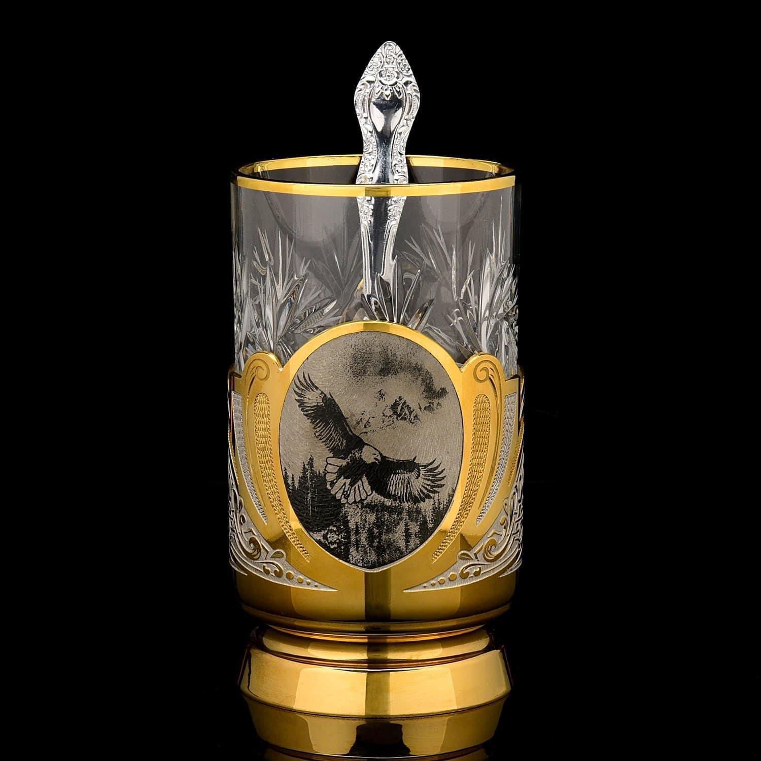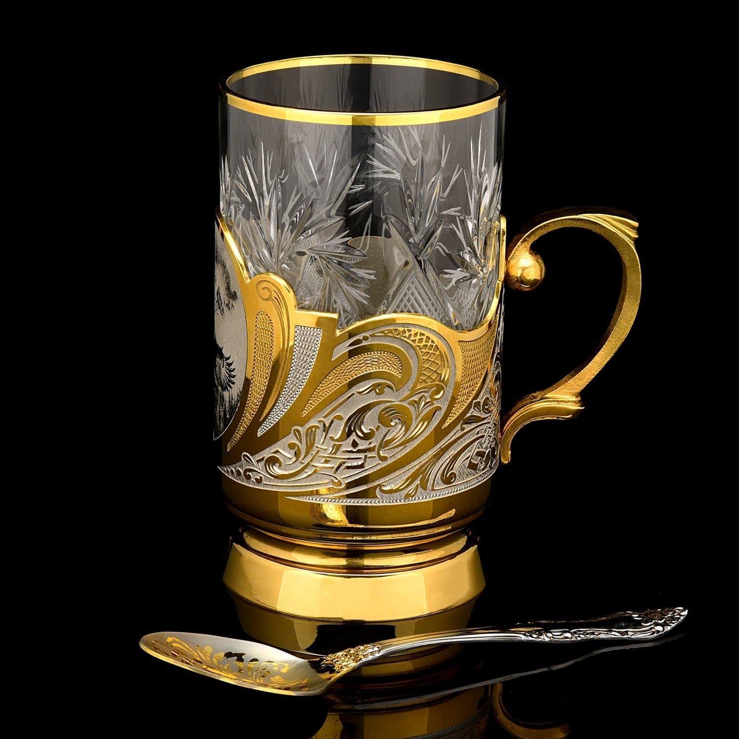 С ложкой и вставным стаканом - в подарочной упаковке из дерева. Подстаканник - это русский сувенир, дизайнерский питейный сосуд в русском стиле, предназначенный для горячих или холодных напитков. Дизайн подстаканника с литым корпусом, оформленным в техниках резьбы и гравировки, восхищает нас! Вашему вниманию - функциональное украшение для интерьера, например, рабочего кабинета.Русский подстаканник в качестве подарка является прекрасной альтернативой кружке. Этот подстаканник с выгравированными вручную композициями по мотивам охоты изготовлен мастерами Златоуста - поставщиками посуды, холодного оружия и элементов декора ручной работы для главной резиденции президента России, Московского Кремля.