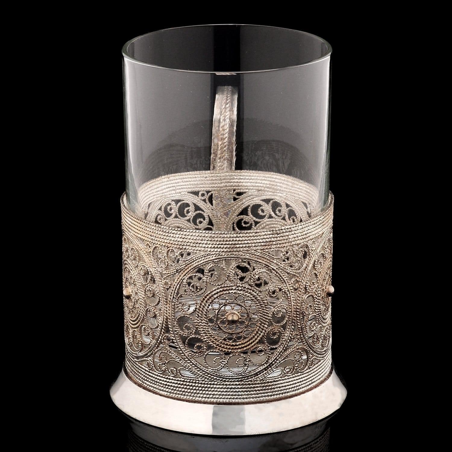 Корпус предлагаемого подстаканника искусно оформлен из драгоценного металла, самородка, серебра в технике скань. Скань - это техника плетения кружев из тончайшей металлической проволоки. Художник по металлу создает ажурные узоры на металлических корпусах авторских изделий, словно свивая их из металлических проволок, спаянных друг с другом в красивый узор.