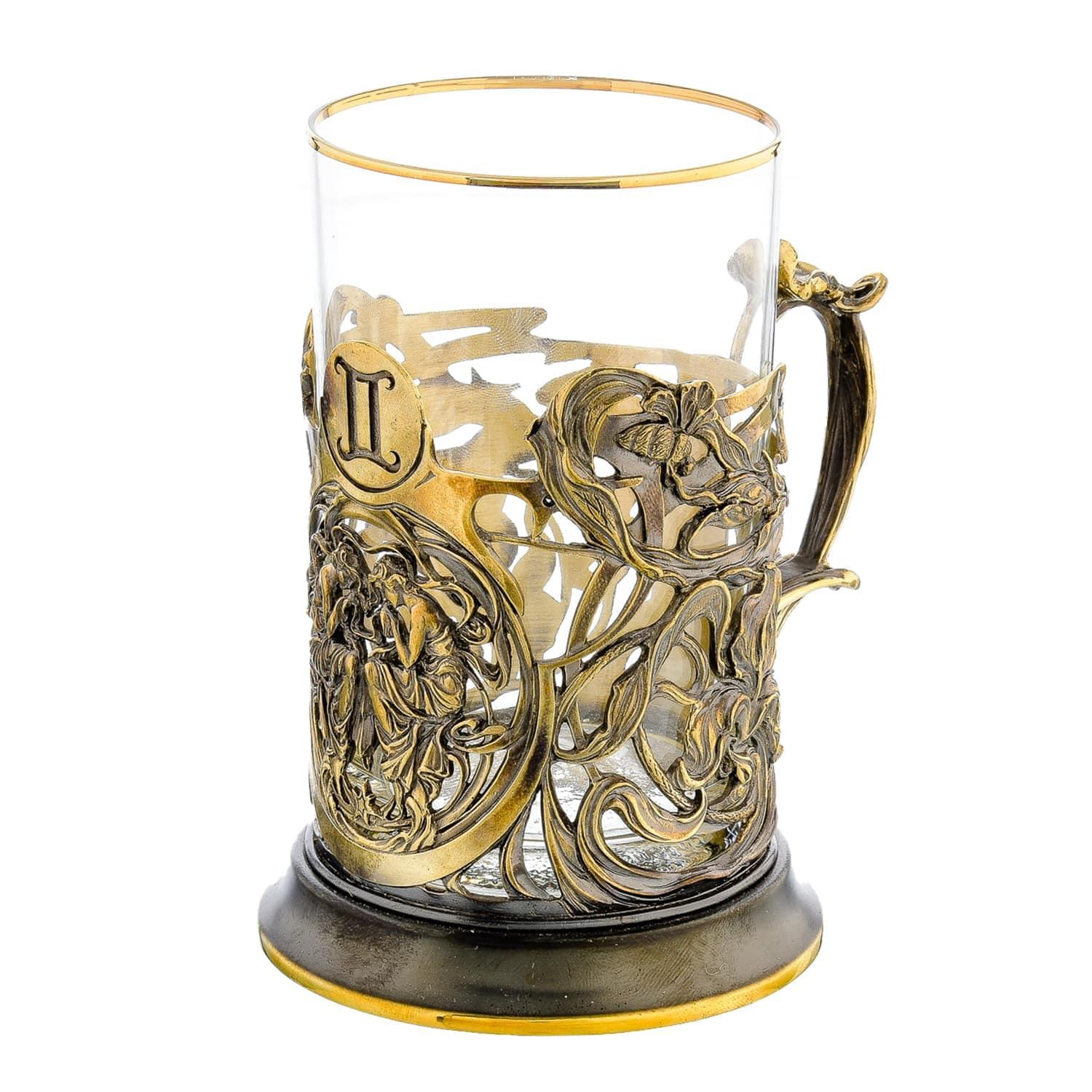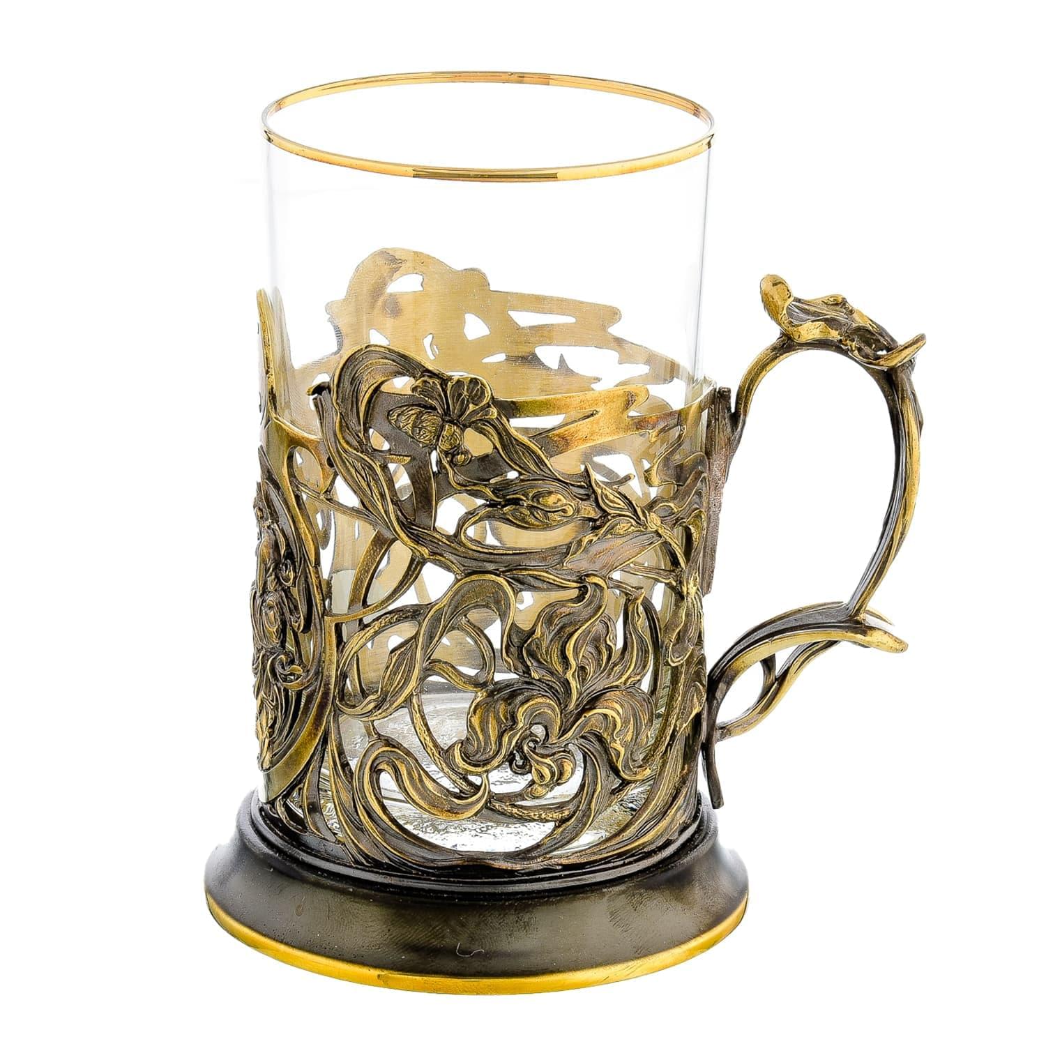 Подстаканник в наборе со вставным стаканом из твердого фарфора сделан вручную. Корпус с ручкой оформлен в технике художественного литья из латуни.  Металл с  медью в составе имеет  множество  природных свойств, это один из лучших материалов для изготовления дорогой посуды. Рука к подстаканнику сама тянется!