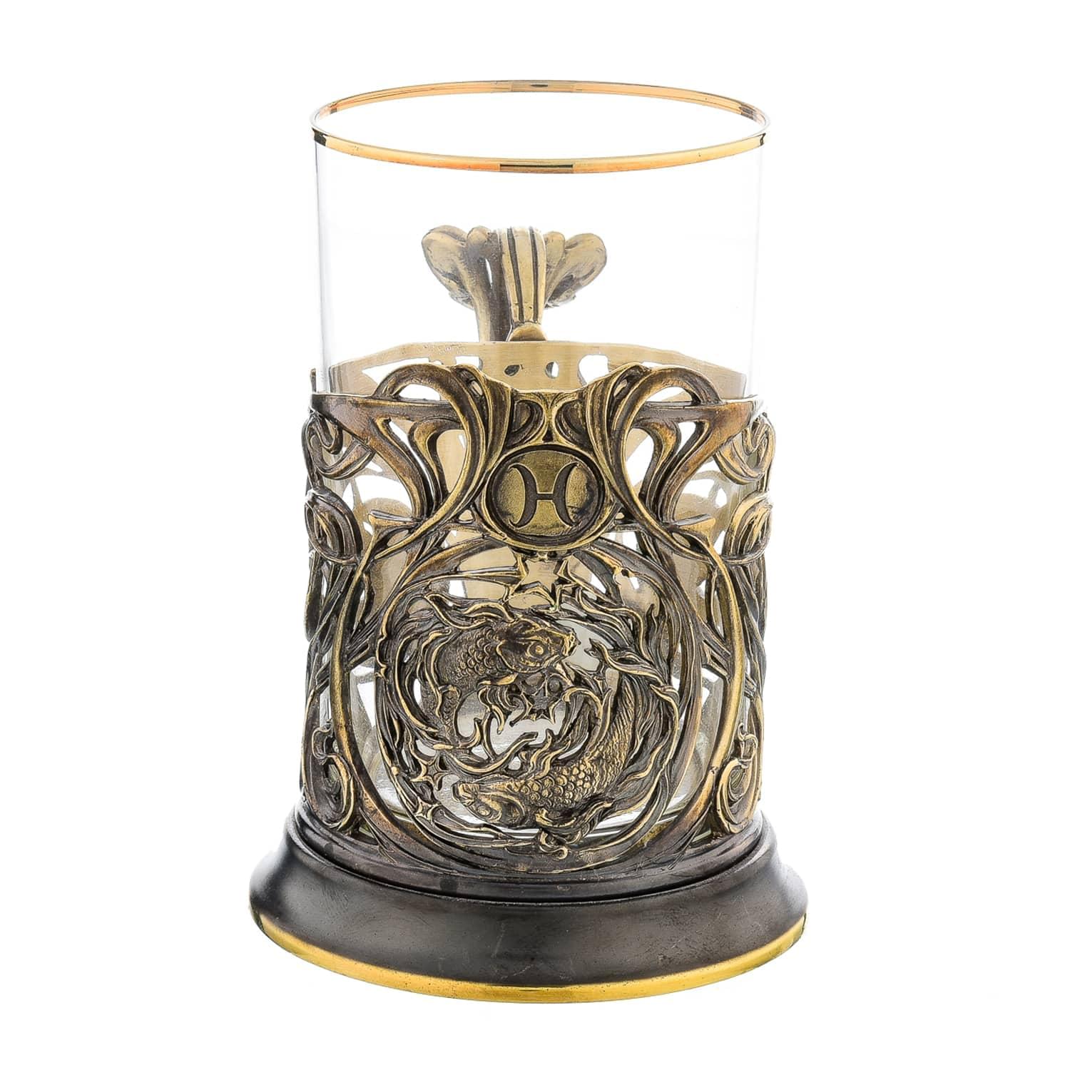 Подстаканник - это предмет обихода в русском стиле из металла и стекла оригинального дизайна, известный с 19 века. Это наш бестселлер - дизайнерский питейный сосуд в русском стиле, который предназначен для горячих и холодных напитков. Подстаканники получили распространение во времена активной государственной деятельности министра Витте. Этот подстаканник сделан специально для рожденного под знаком зодиака Рыбы.