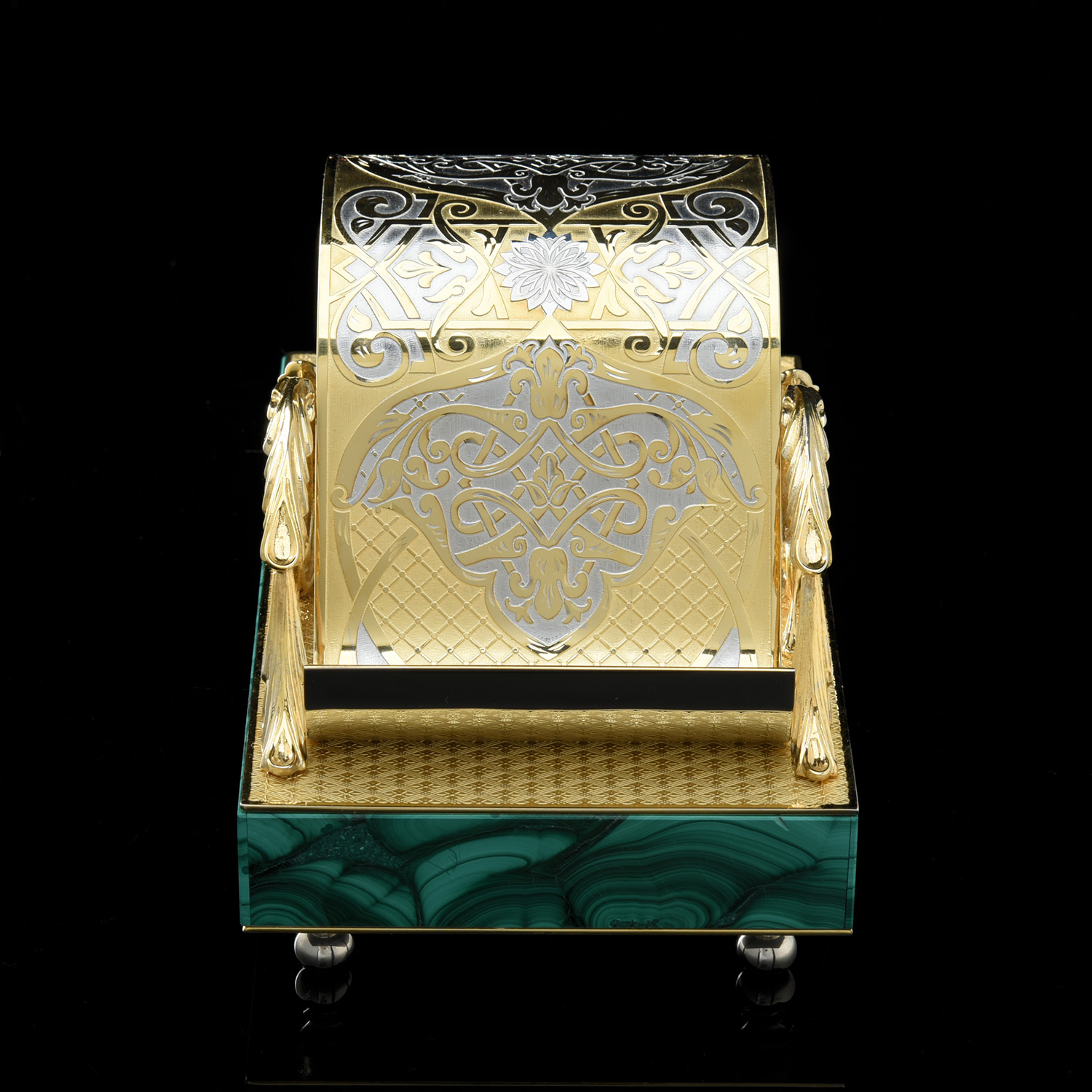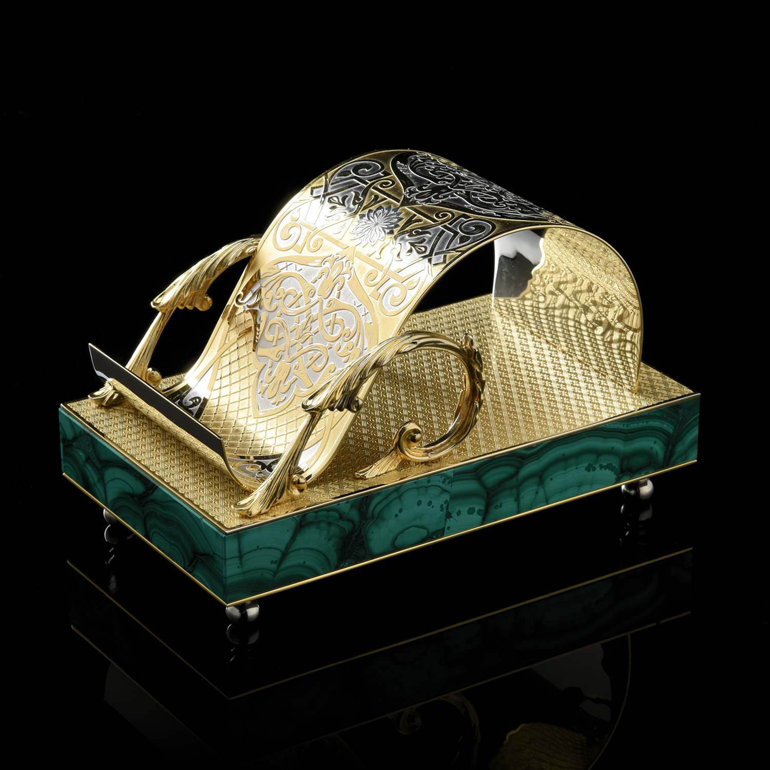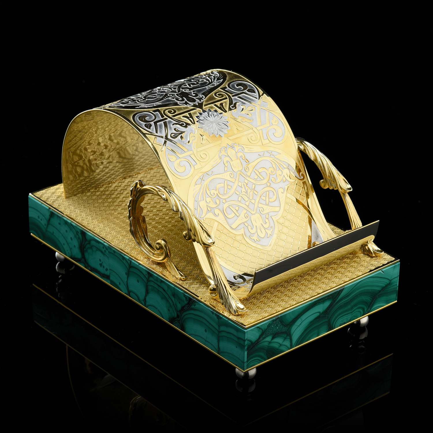 Подставка под телефон. Златоуст.Материалы: латунь, никель, золото 999,9*, малахит.