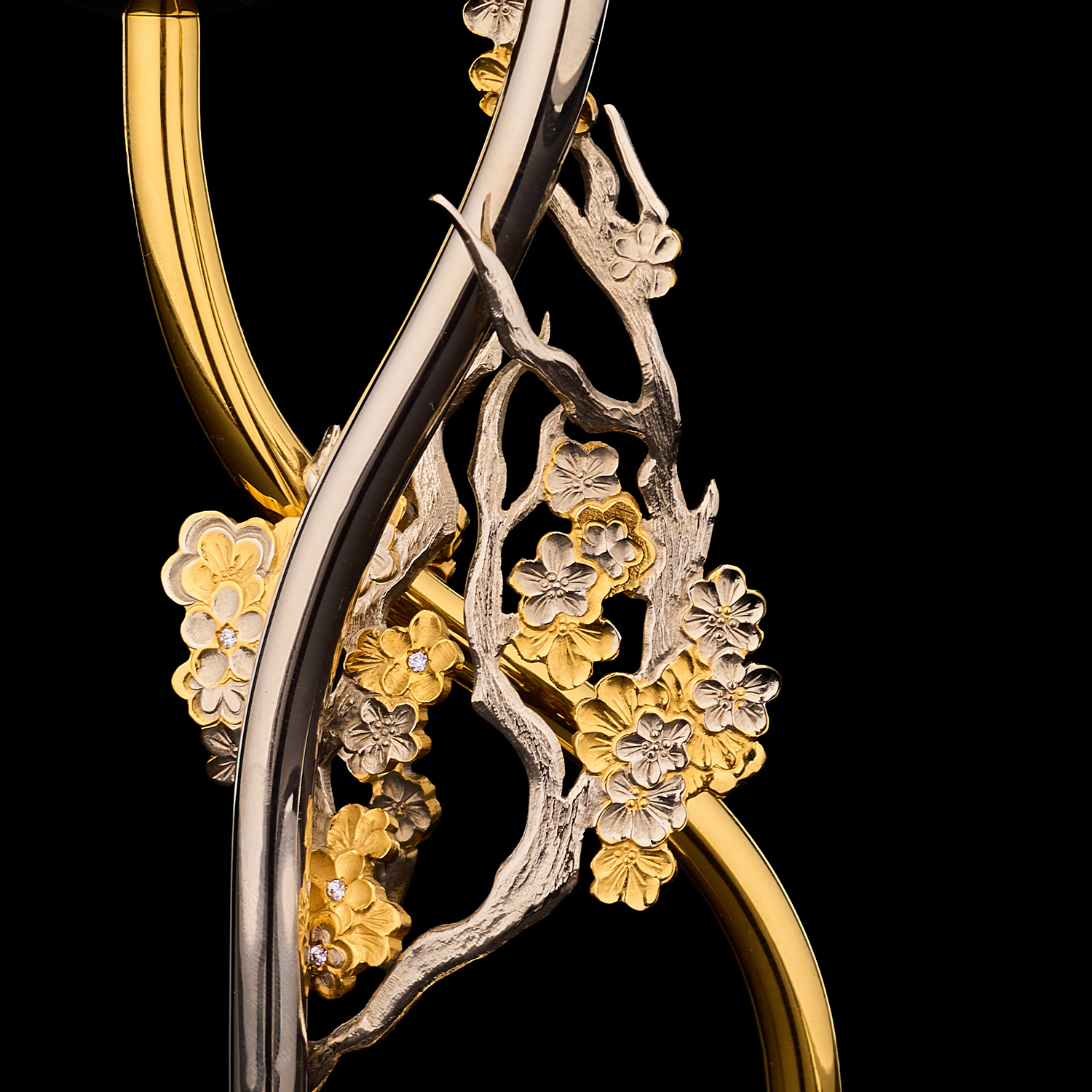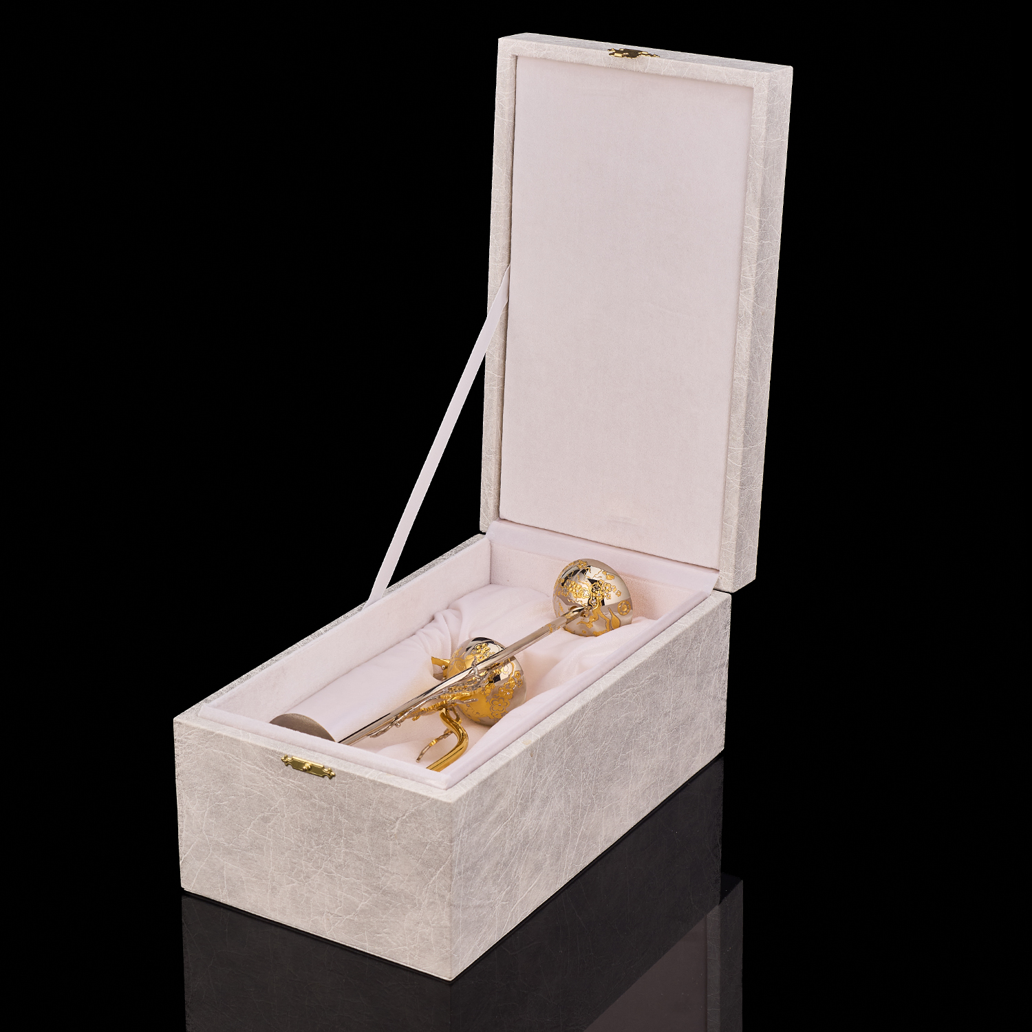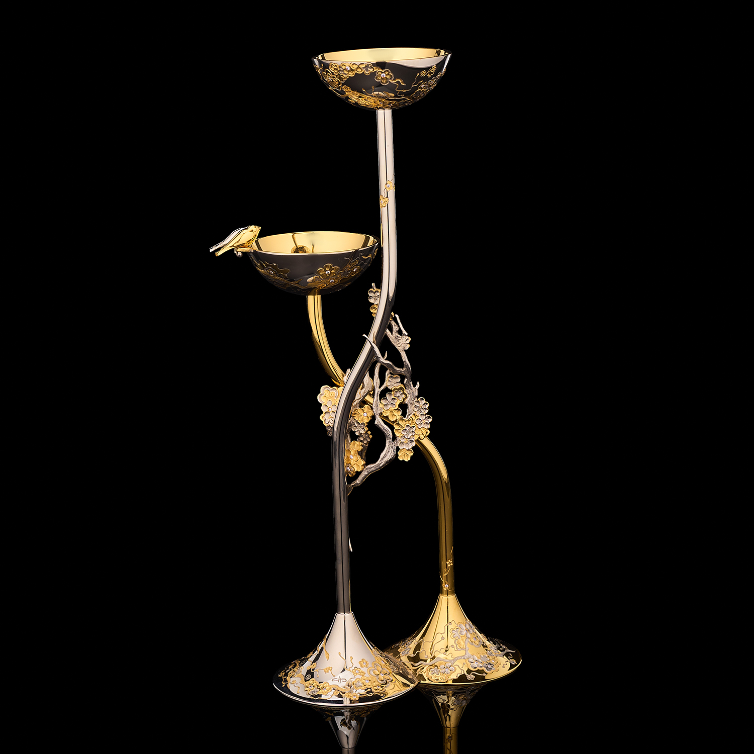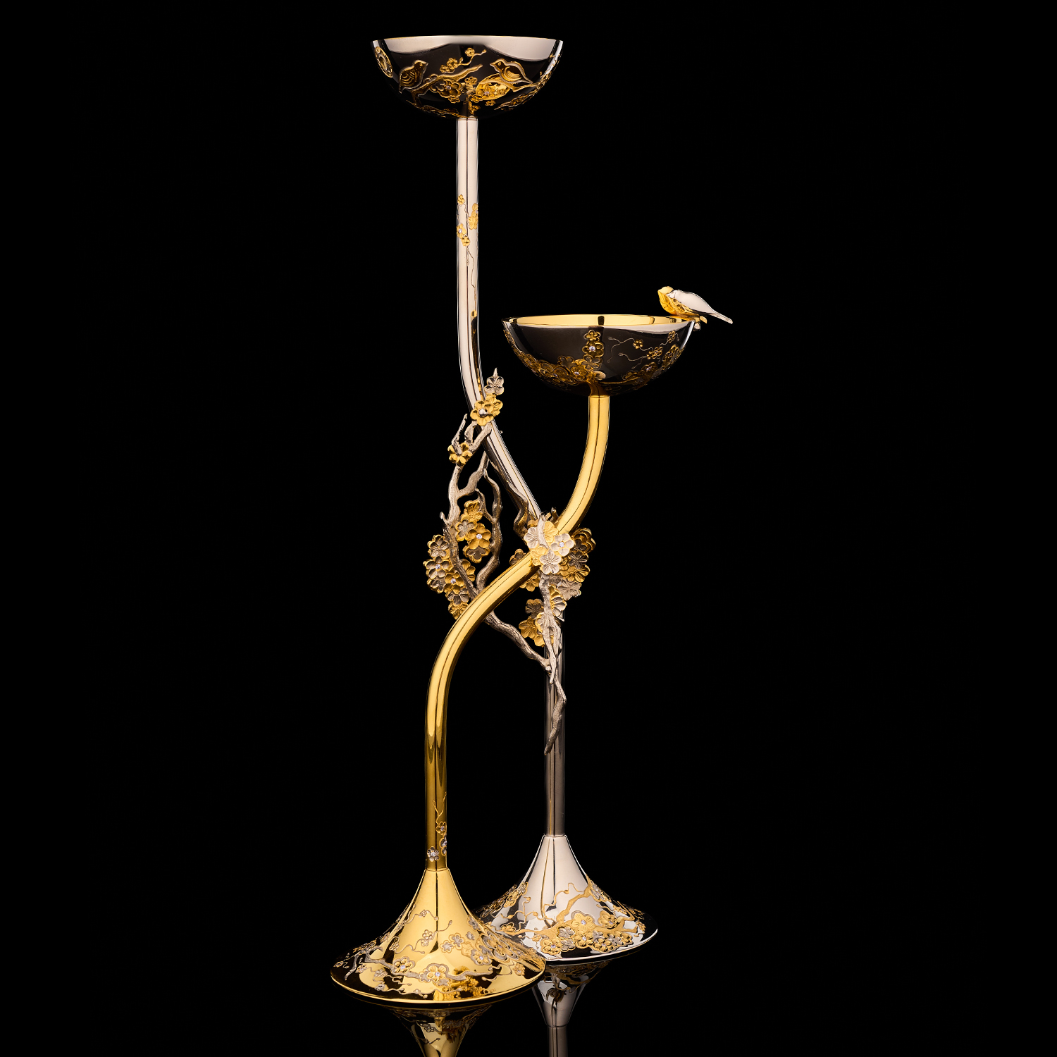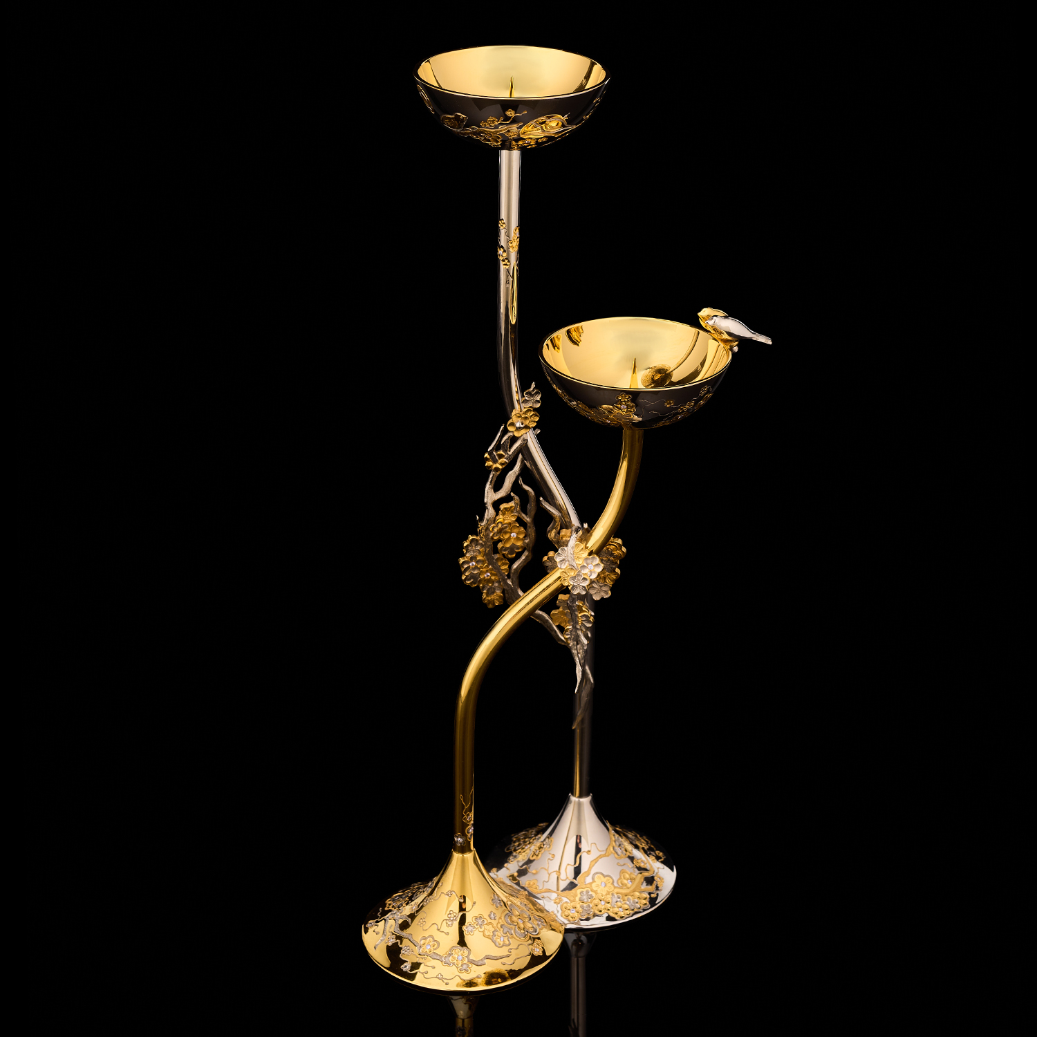 Подсвечник двухрожковый с позолотой и фианитами "Весна". Златоуст.Материалы: латунь, никель, золото 999,9*, фианиты.