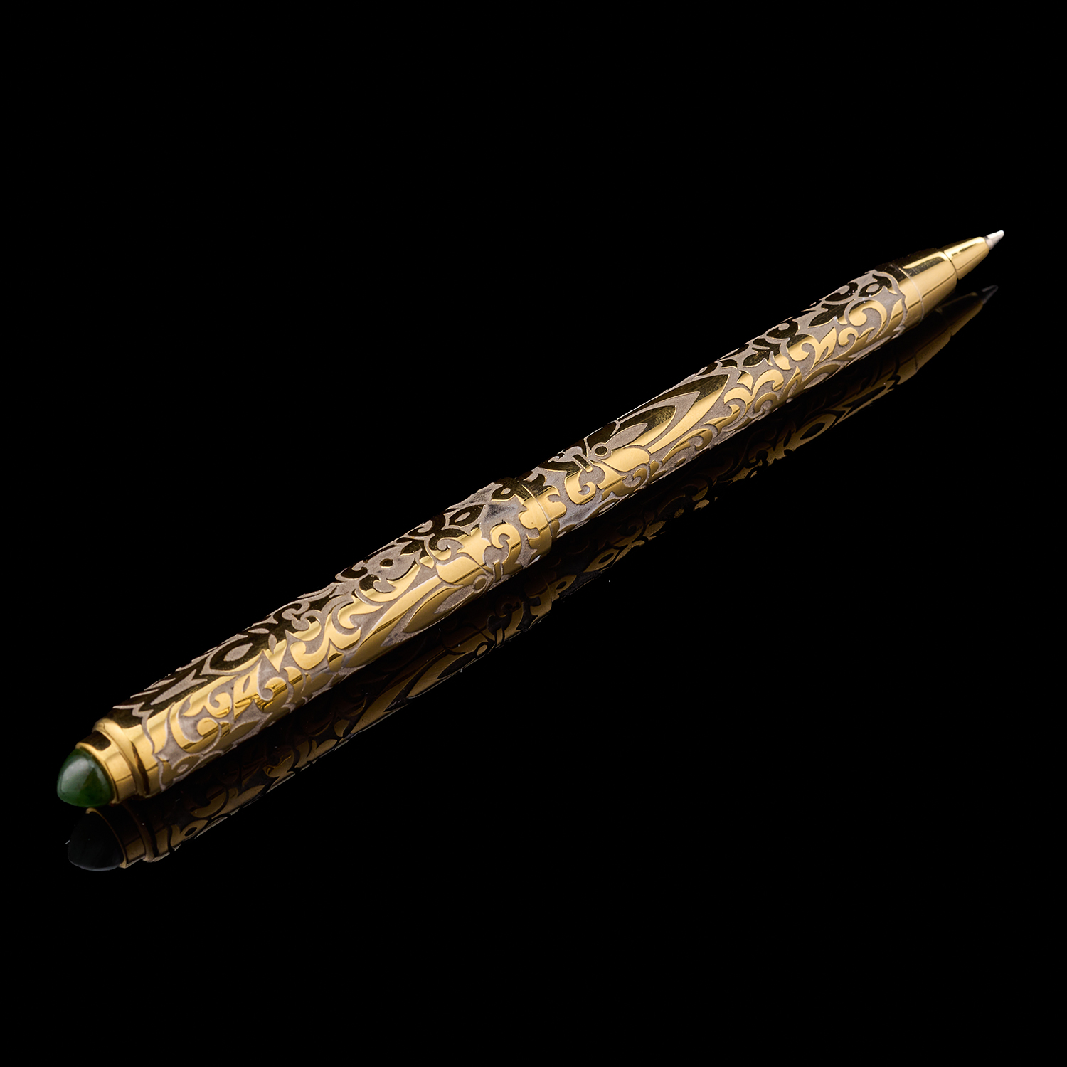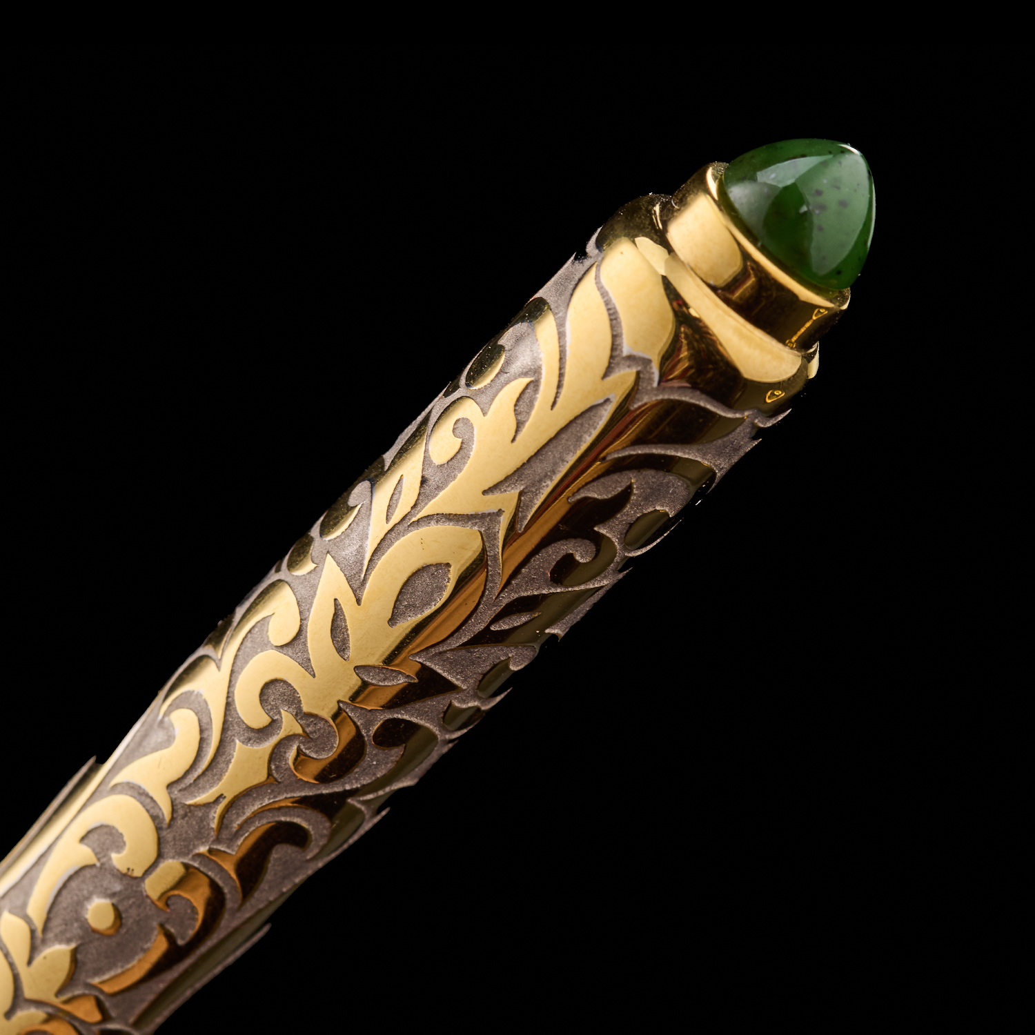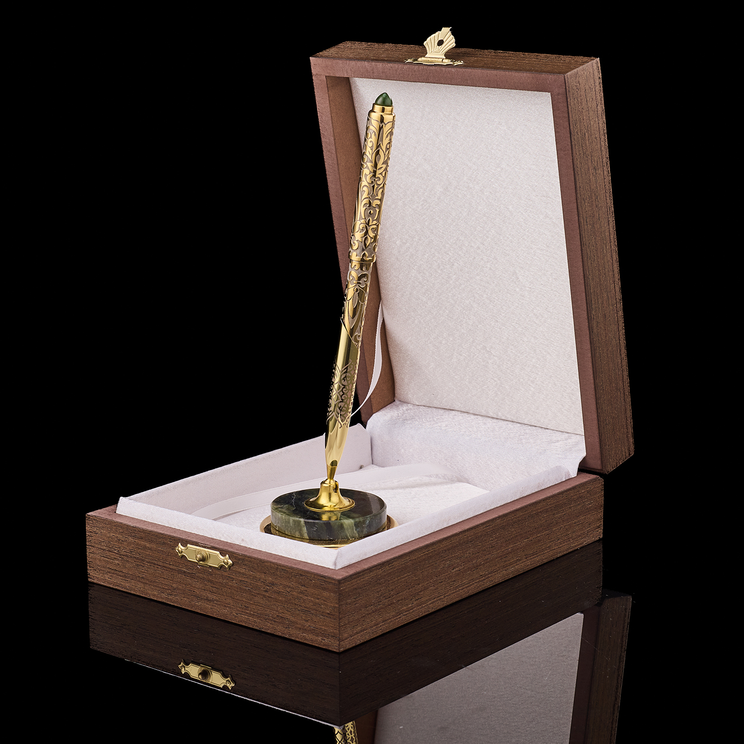 Ручка подарочная с подставкой из нефрита. Златоуст.Материалы: латунь, никель, золото 999,9*, нефрит.
