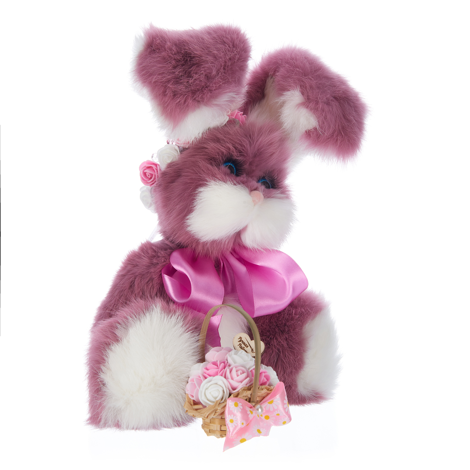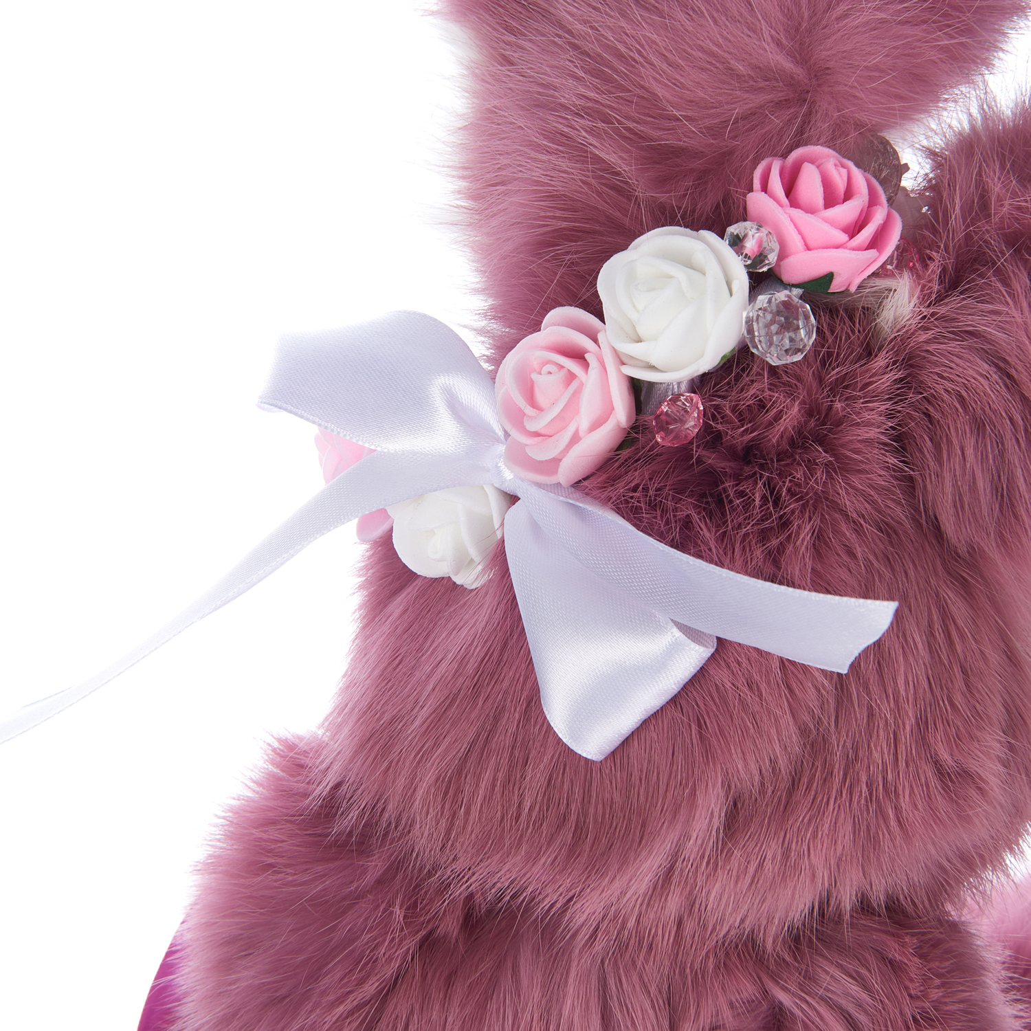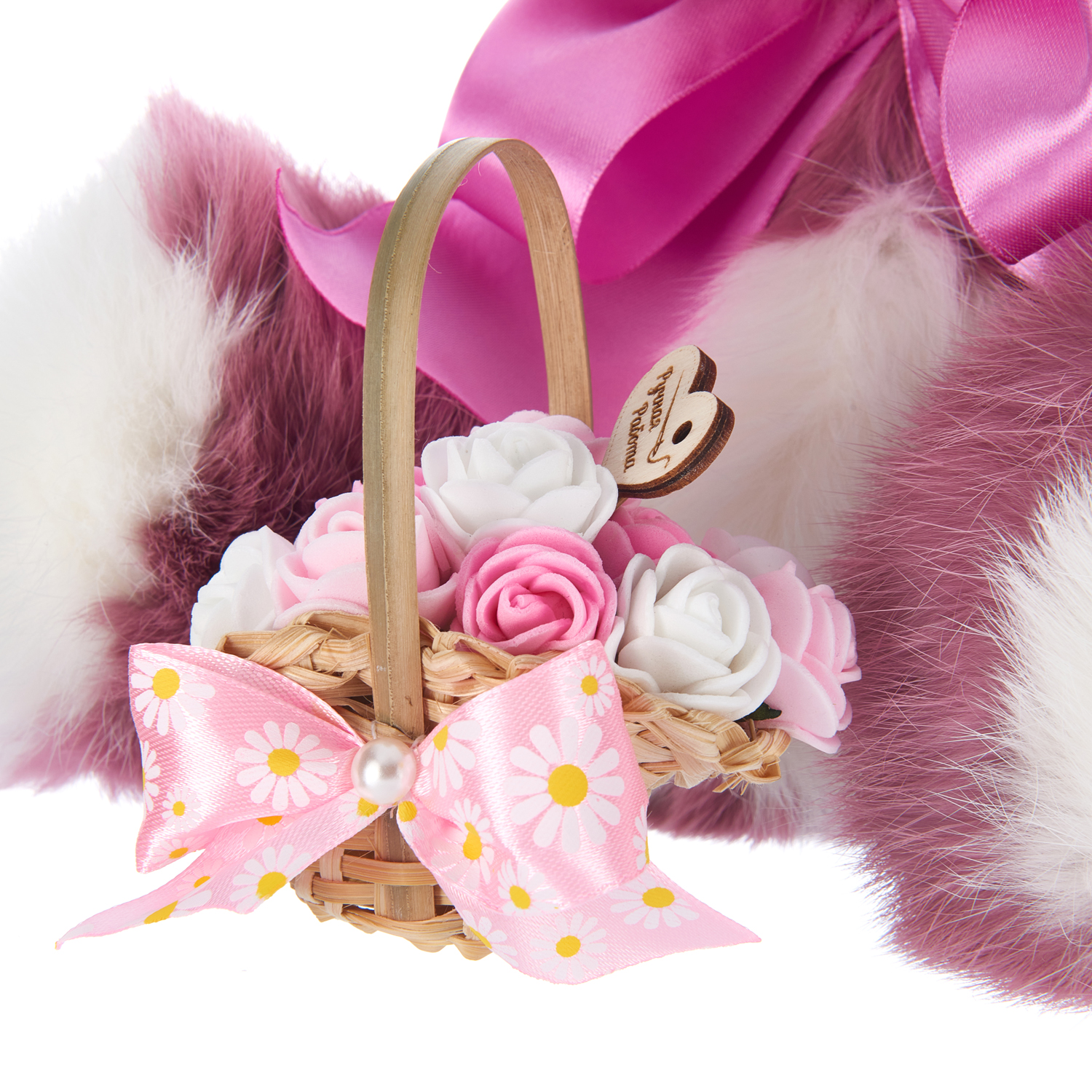 0055412-розовый Нат.мех  Сувенир Игрушка "ЗАЯЦ ЗЕФИРКА" (мех кролика) (венок, корзинка) .