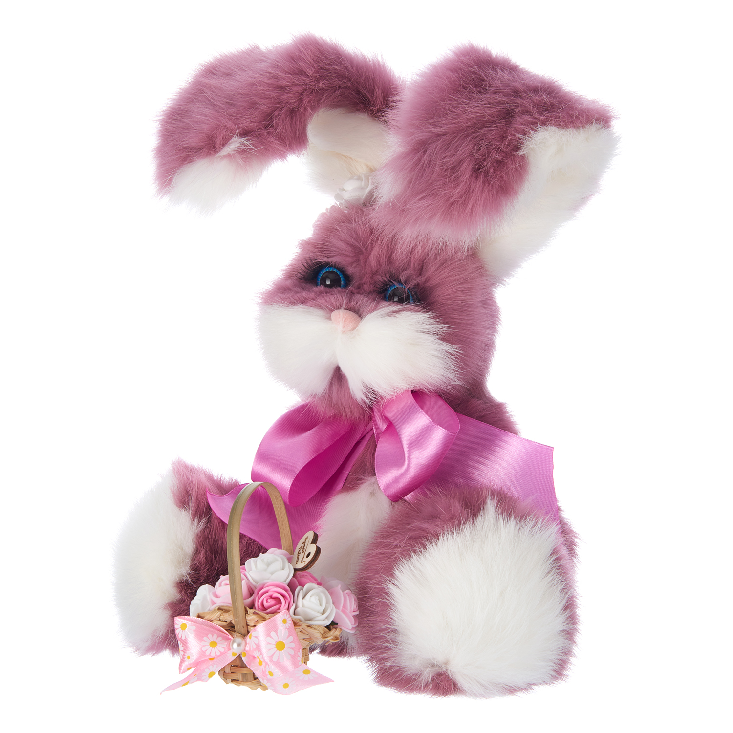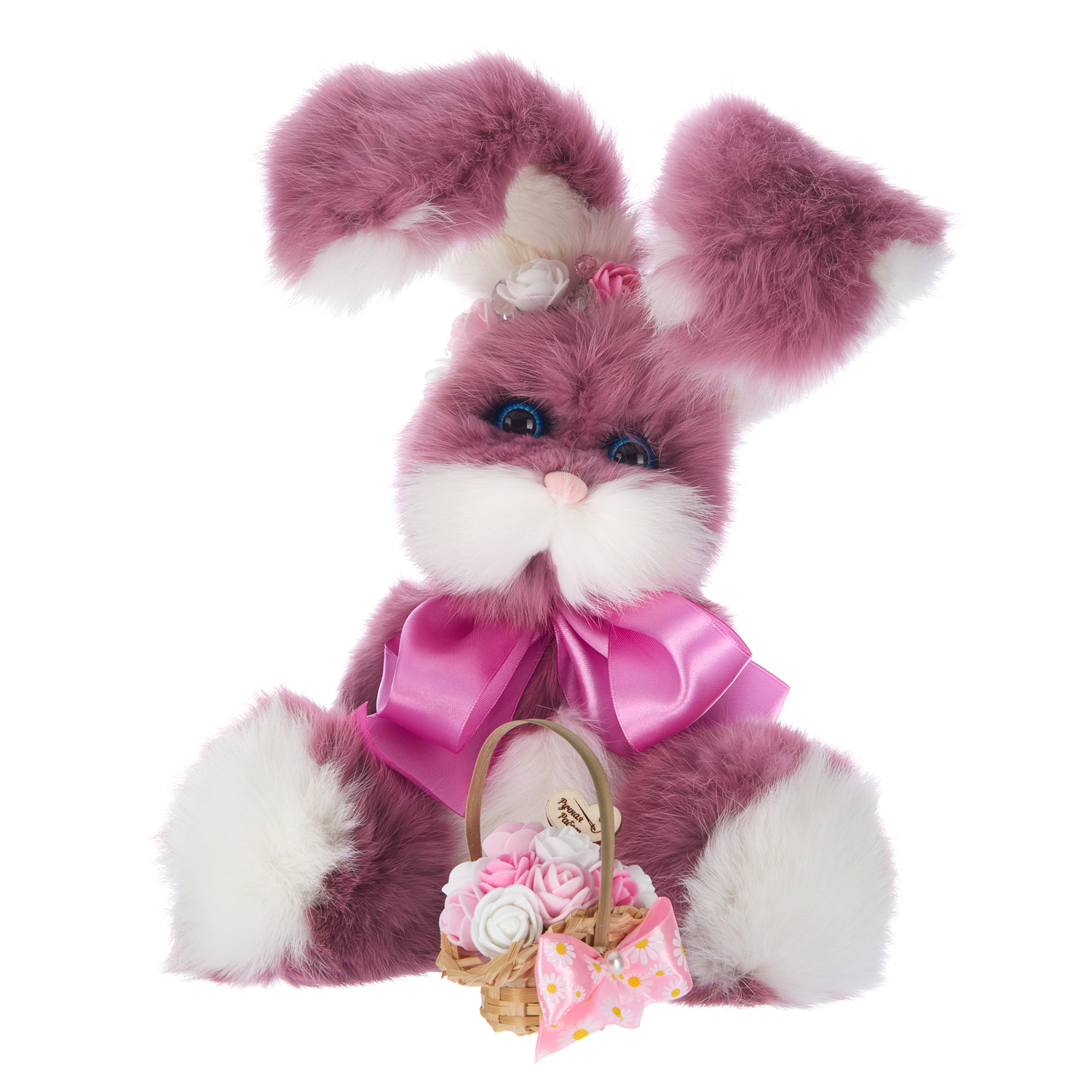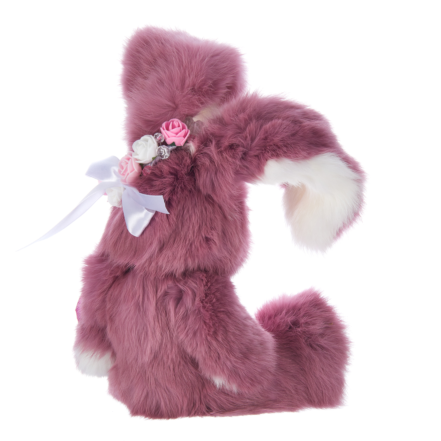 0055412-розовый Нат.мех  Сувенир Игрушка "ЗАЯЦ ЗЕФИРКА" (мех кролика) (венок, корзинка) .