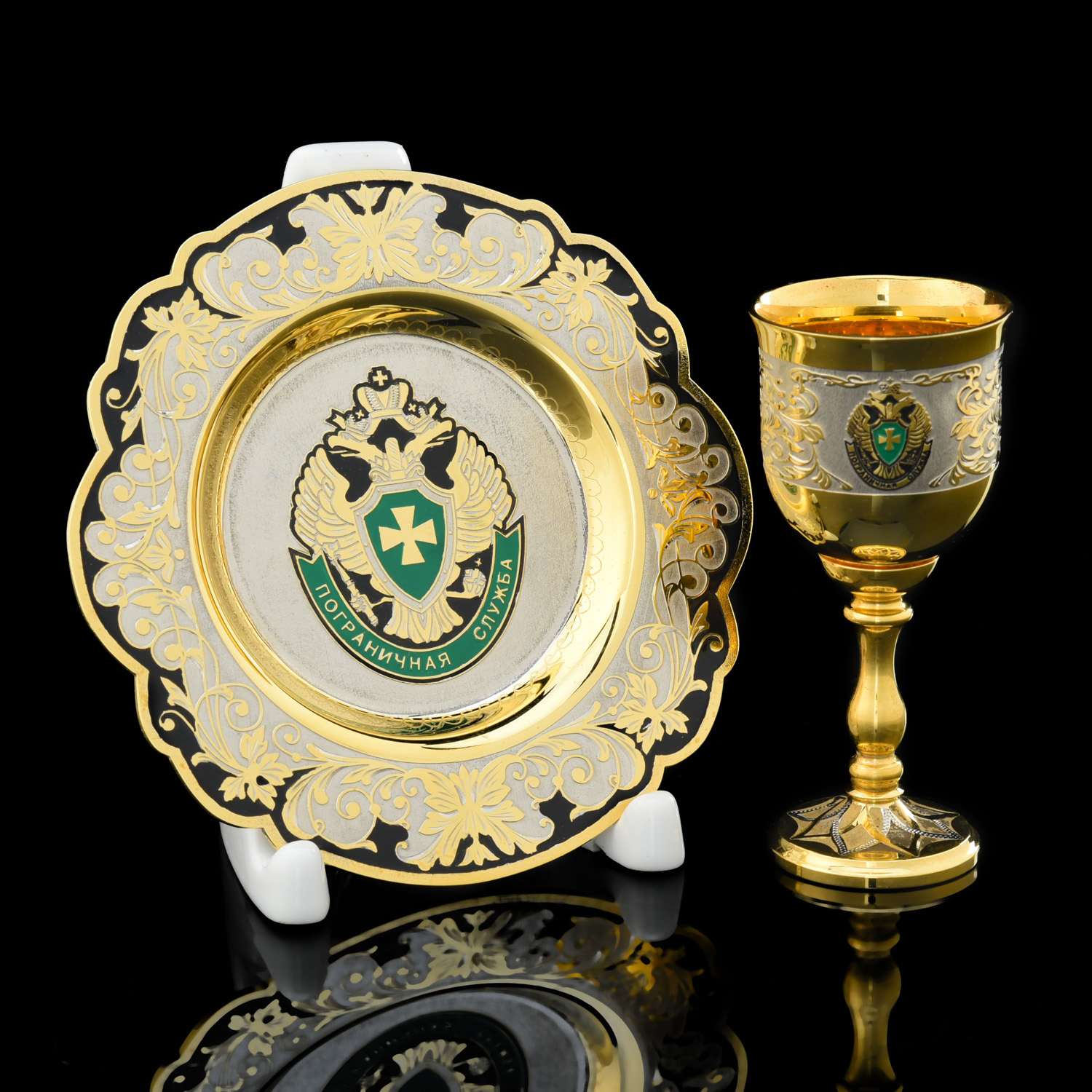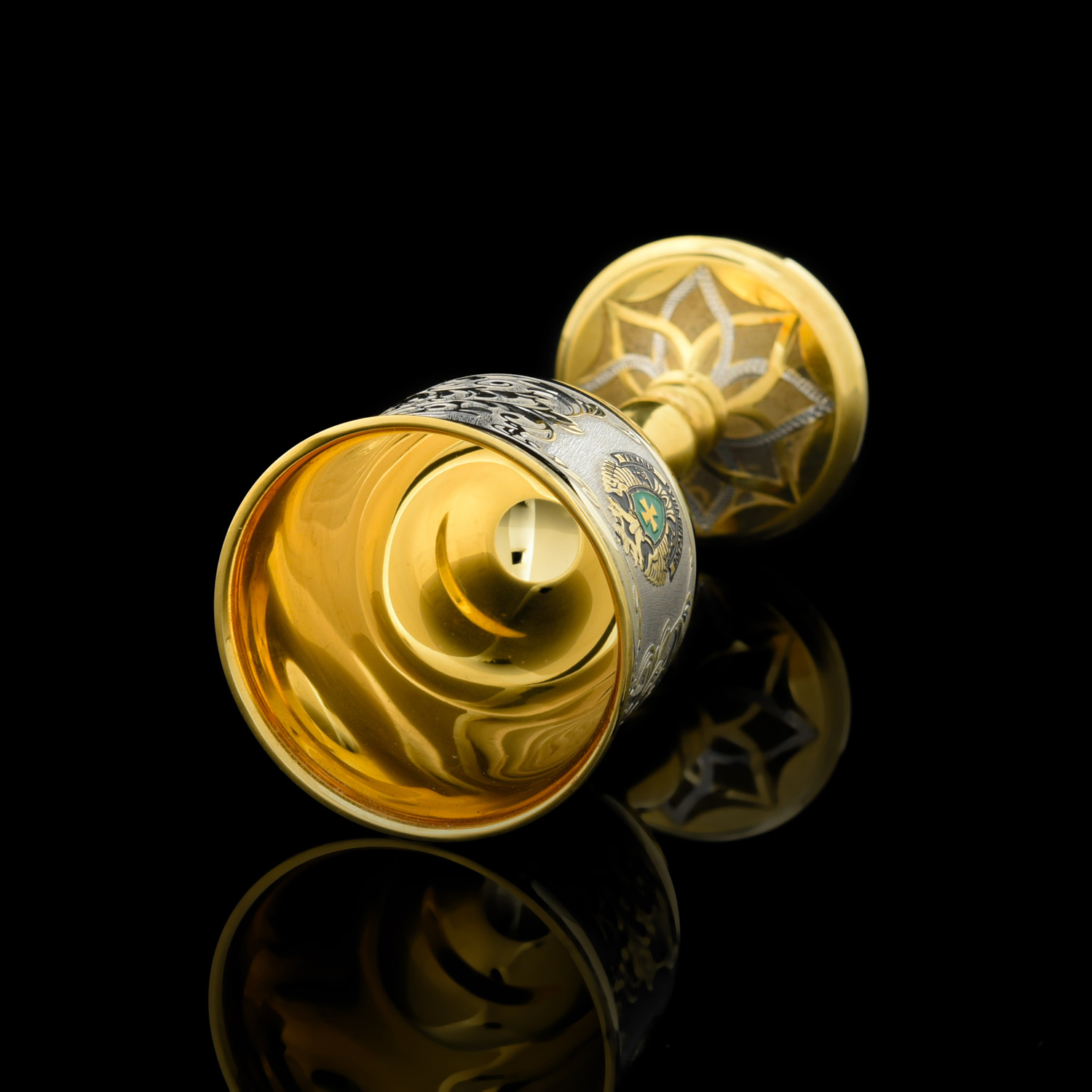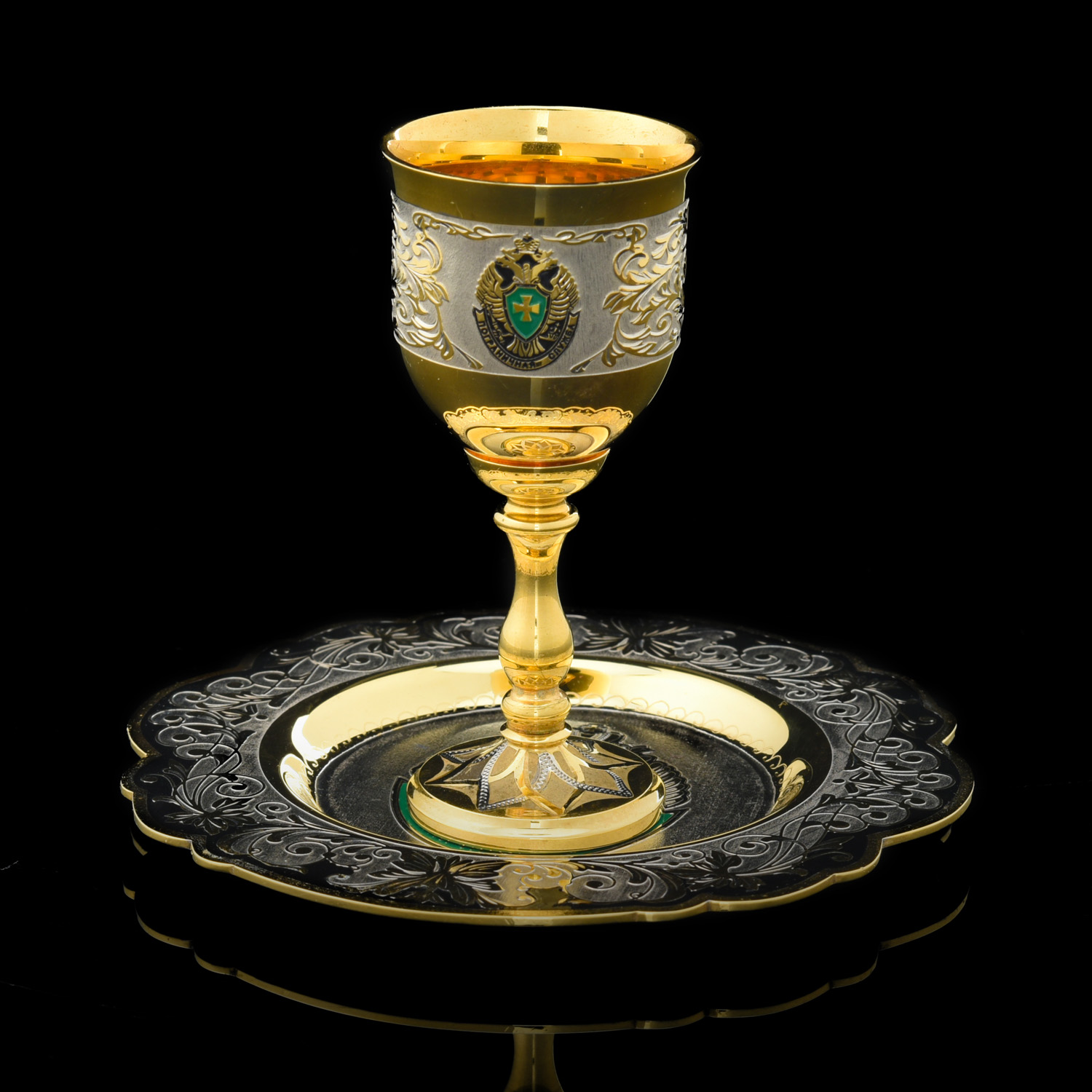Золотая композиция для интерьера в стиле ампир с рюмками из металла, искусно декорированными гравюрами и золотом, с гербом РФ, создает в интерьере притягательный акцент. Изготовлена для любителей интерьерных аксессуаров класса люкс. Распитие алкоголя с набором превращается в торжественный ритуал. Корпуса рюмок отлиты из латуни с использованием форм Императорского фарфорового завода, украшены выгравированным композициями, при создании которых традиционно применяются техники Златоустовской гравюры на металле. Златоустовская гравюра на металле - самобытный русский народный промысел, зародившийся в начале 19 века как способ украшения холодного оружия, производимого на Оружейном заводе, который был построен по указу русского царя Александра I в городке Златоуст. Техника исполнения: токарные работы, рисовка кистью, гравировка иглой по лаку, травление, гравировка резцом, полировка, никелирование, золочение. В изделии использовались традиционные методы обработки и украшения Златоустовской гравюры на металле.